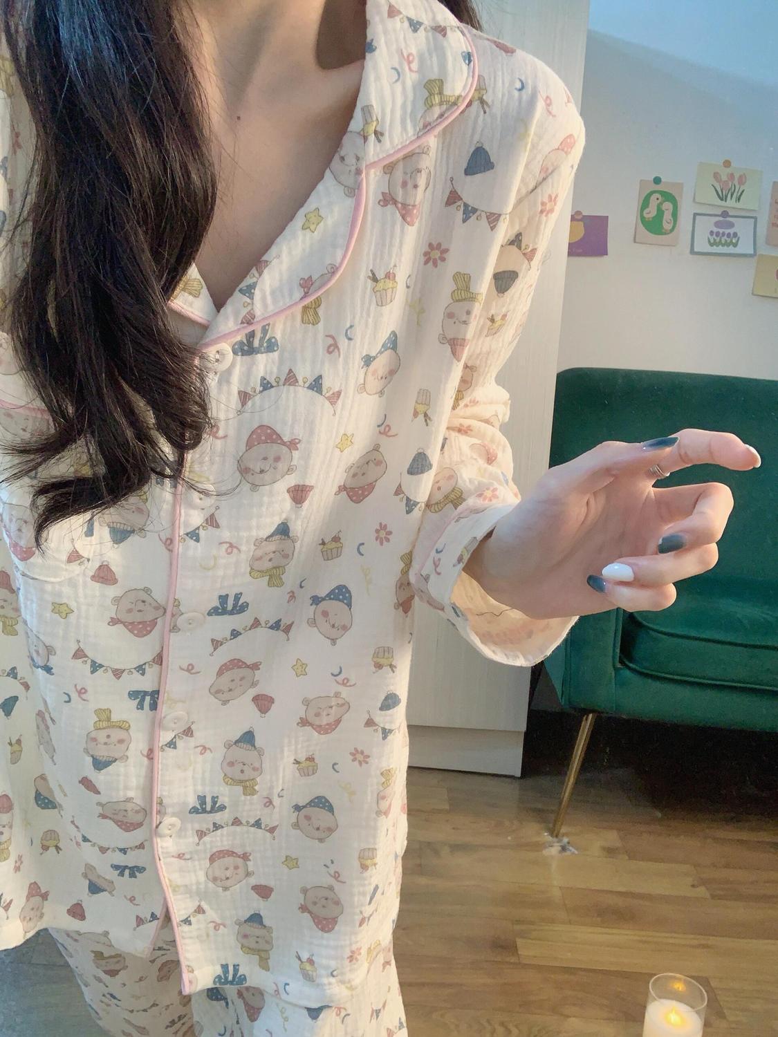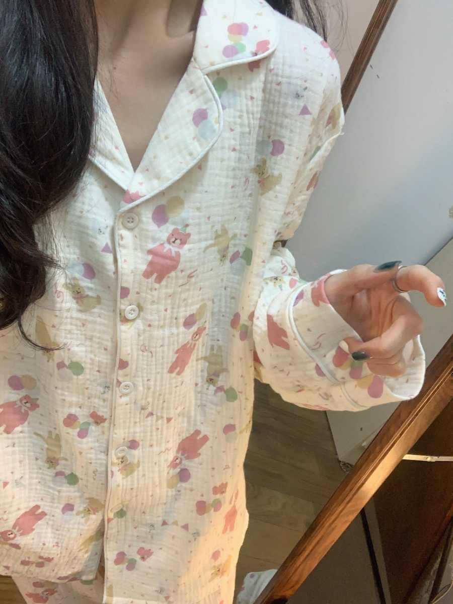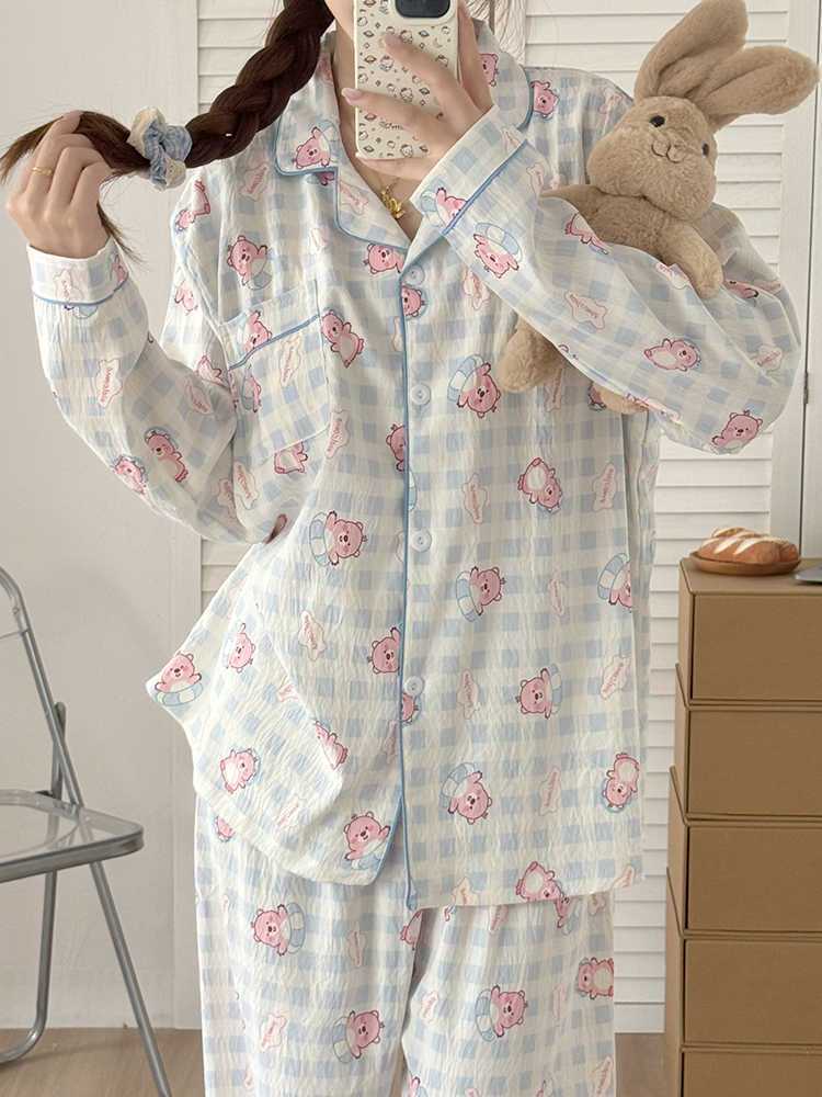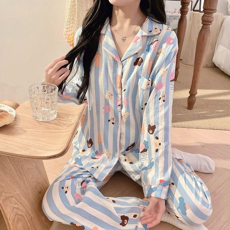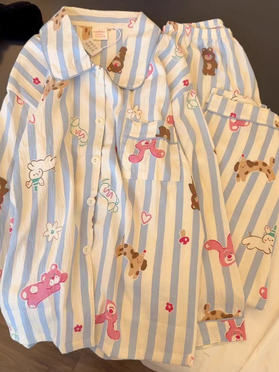 블루 스트라이프 펭귄 잠옷 여성의 봄과 가을 2024 새로운 귀여운 만화 긴 소매 바지 느슨한 외부 착용 홈 옷스토어 가기