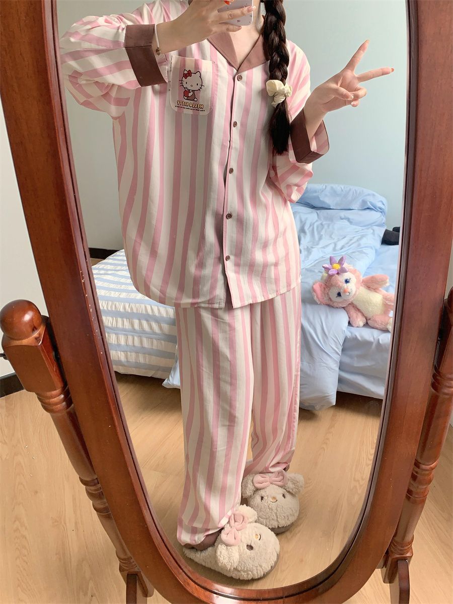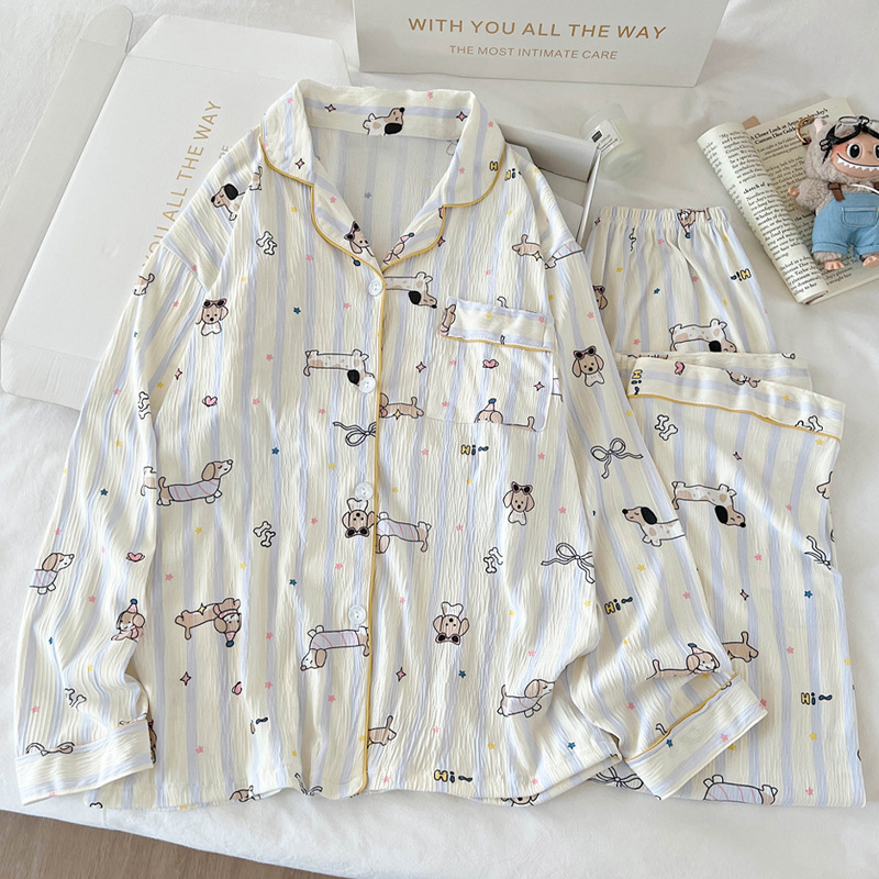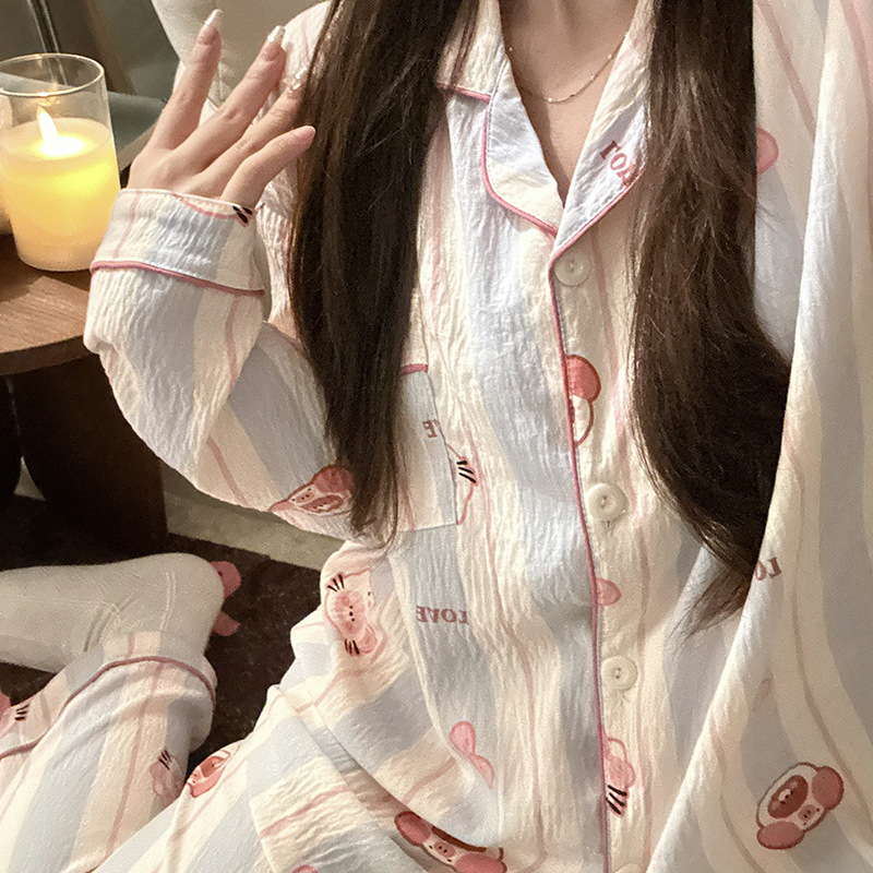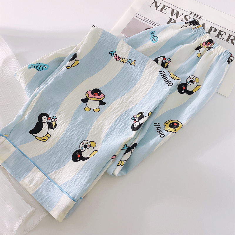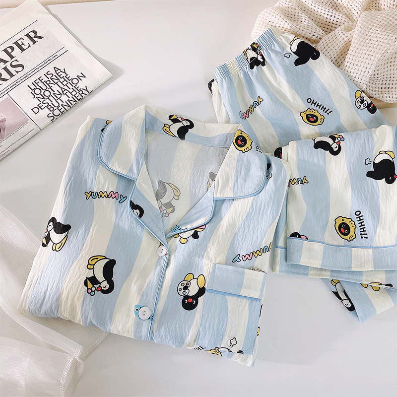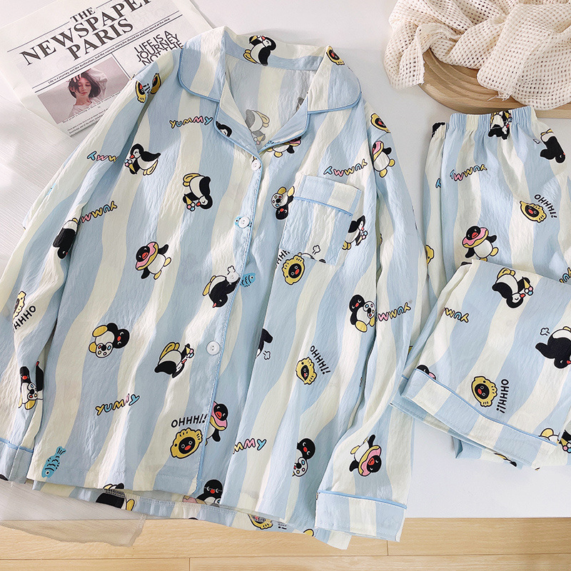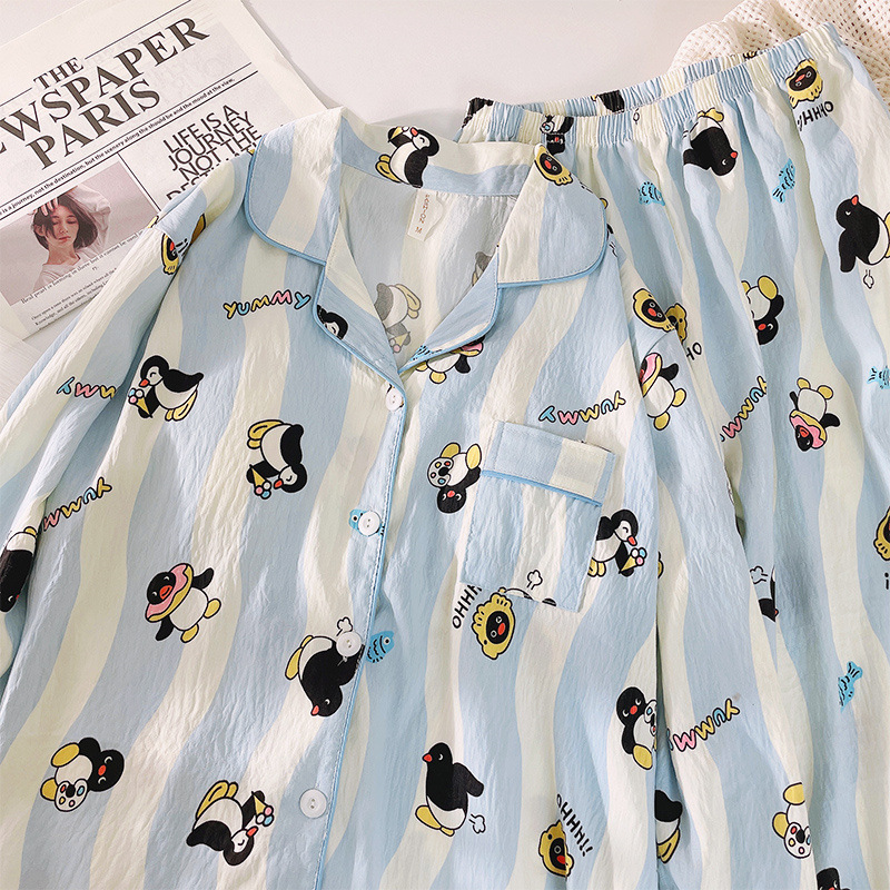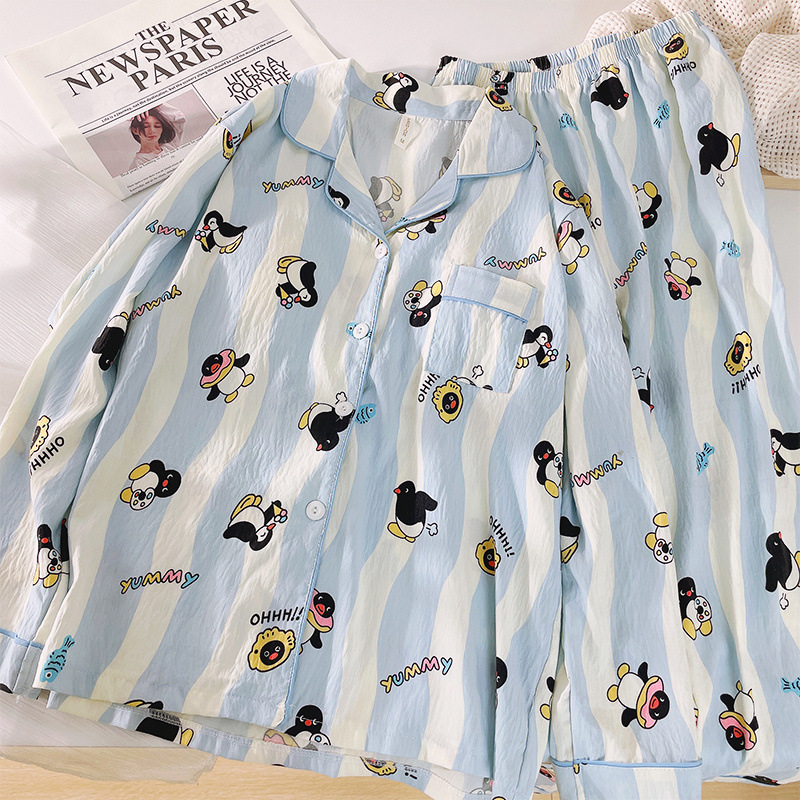 블루 스트라이프 펭귄 잠옷 여성의 봄과 가을 2024 새로운 귀여운 만화 긴 소매 바지 느슨한 외부 착용 홈 옷