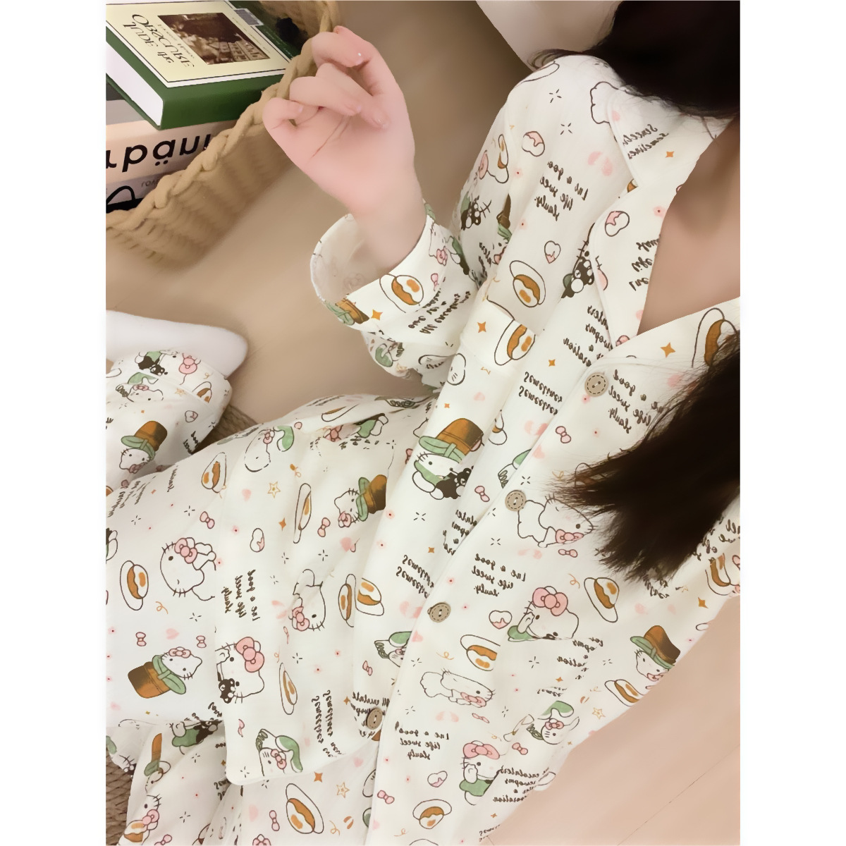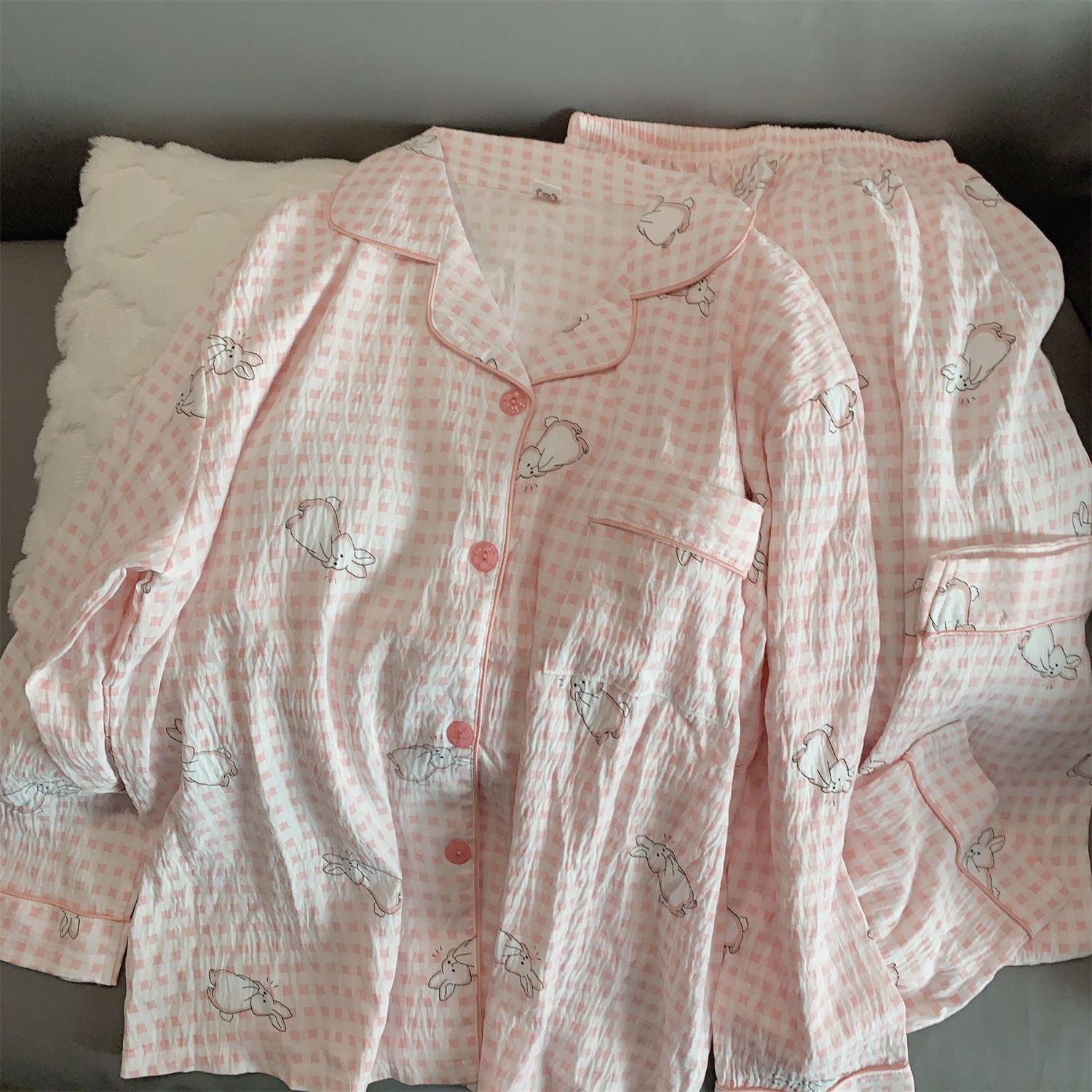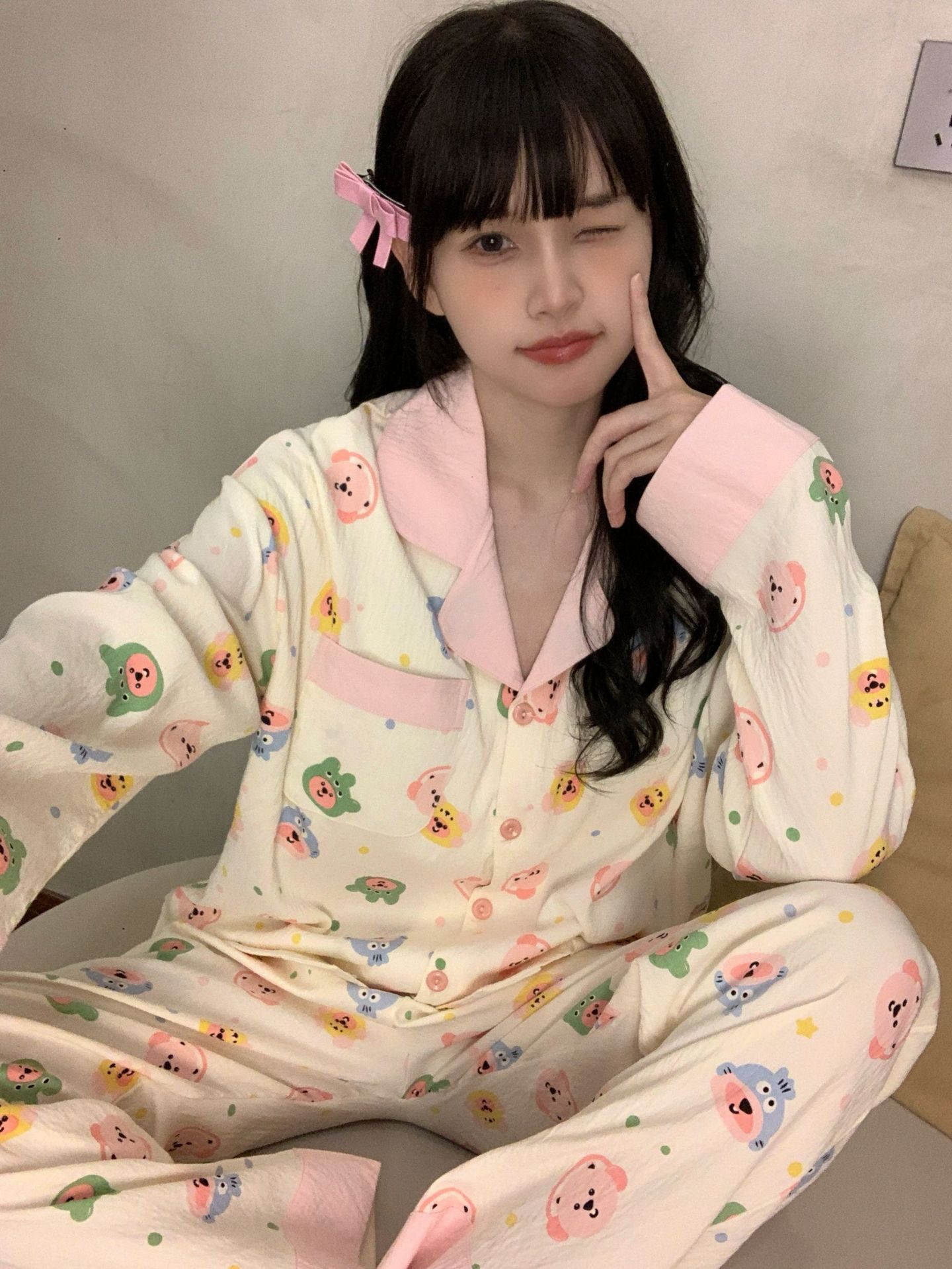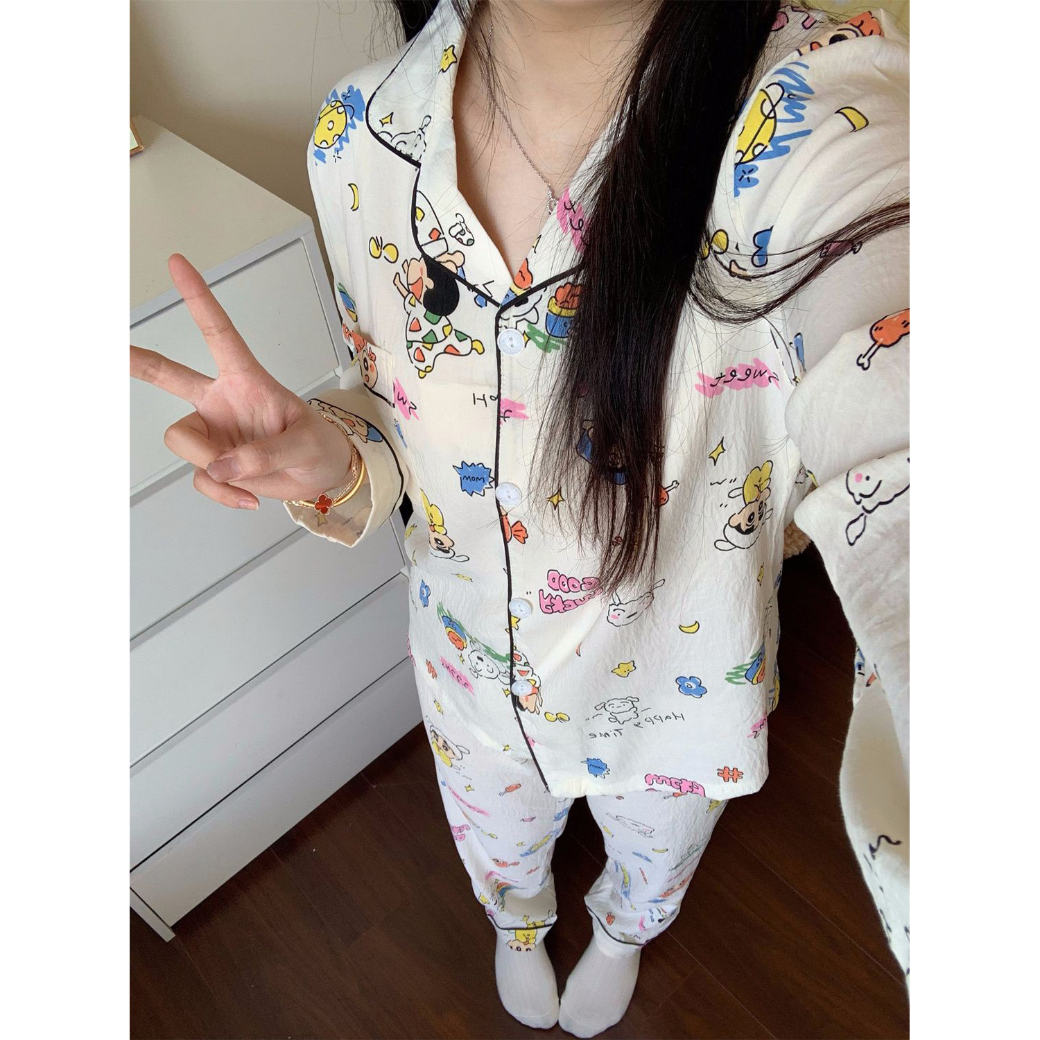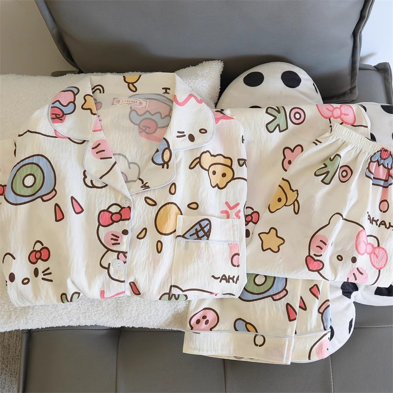 블루 스트라이프 펭귄 잠옷 여성의 봄과 가을 2024 새로운 귀여운 만화 긴 소매 바지 느슨한 외부 착용 홈 옷