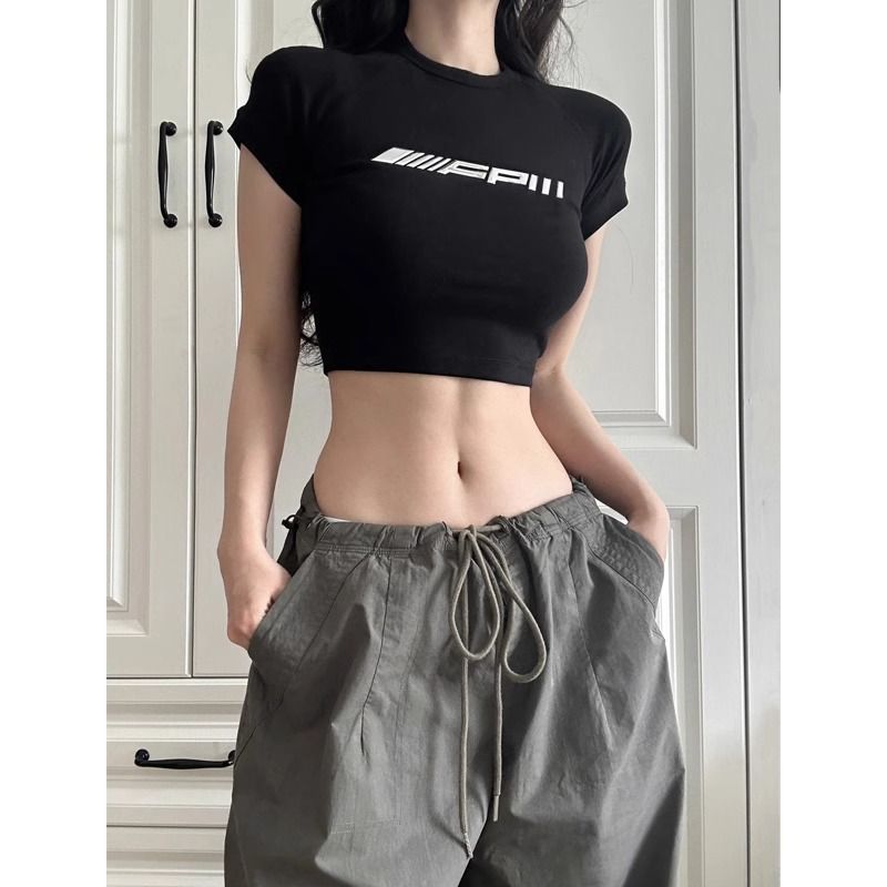 여름 핫걸을 위한 아메리칸 레터 3D 액체 메탈 반팔 티셔츠 슬리밍 짧은 재즈 댄스 웨이스트 탑스토어 가기
