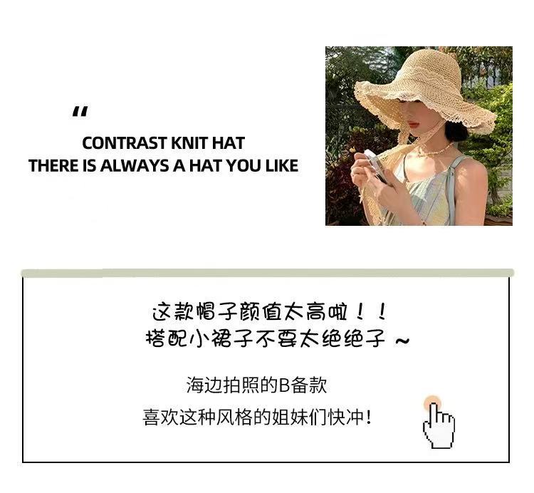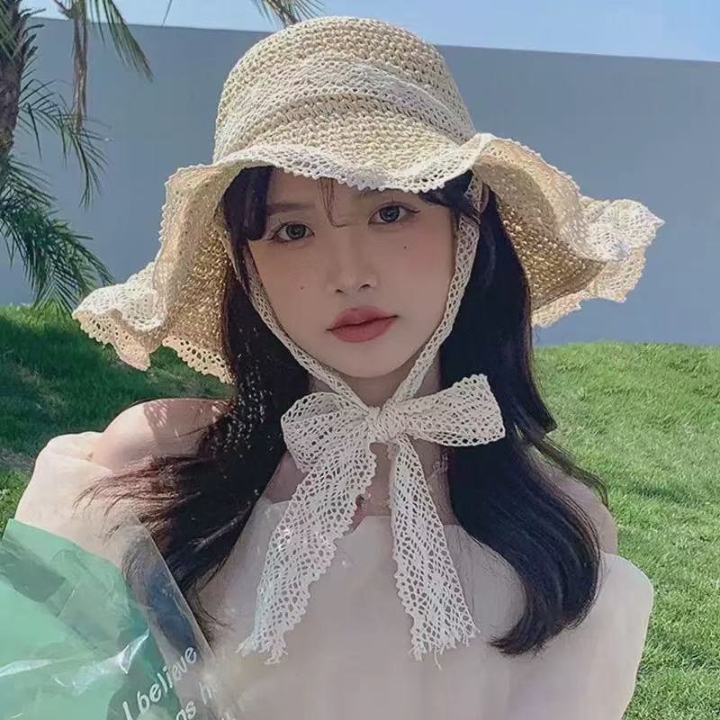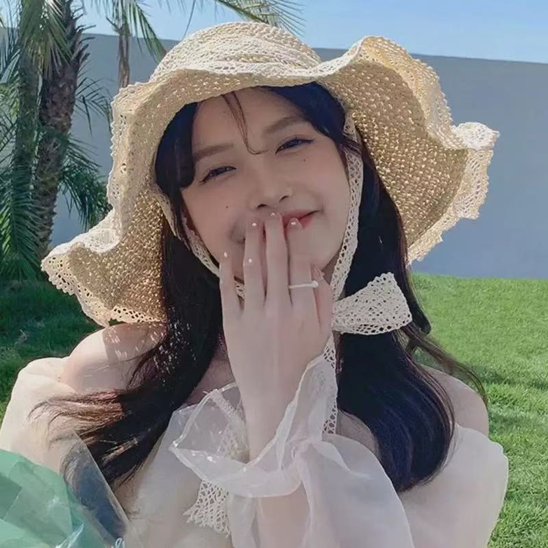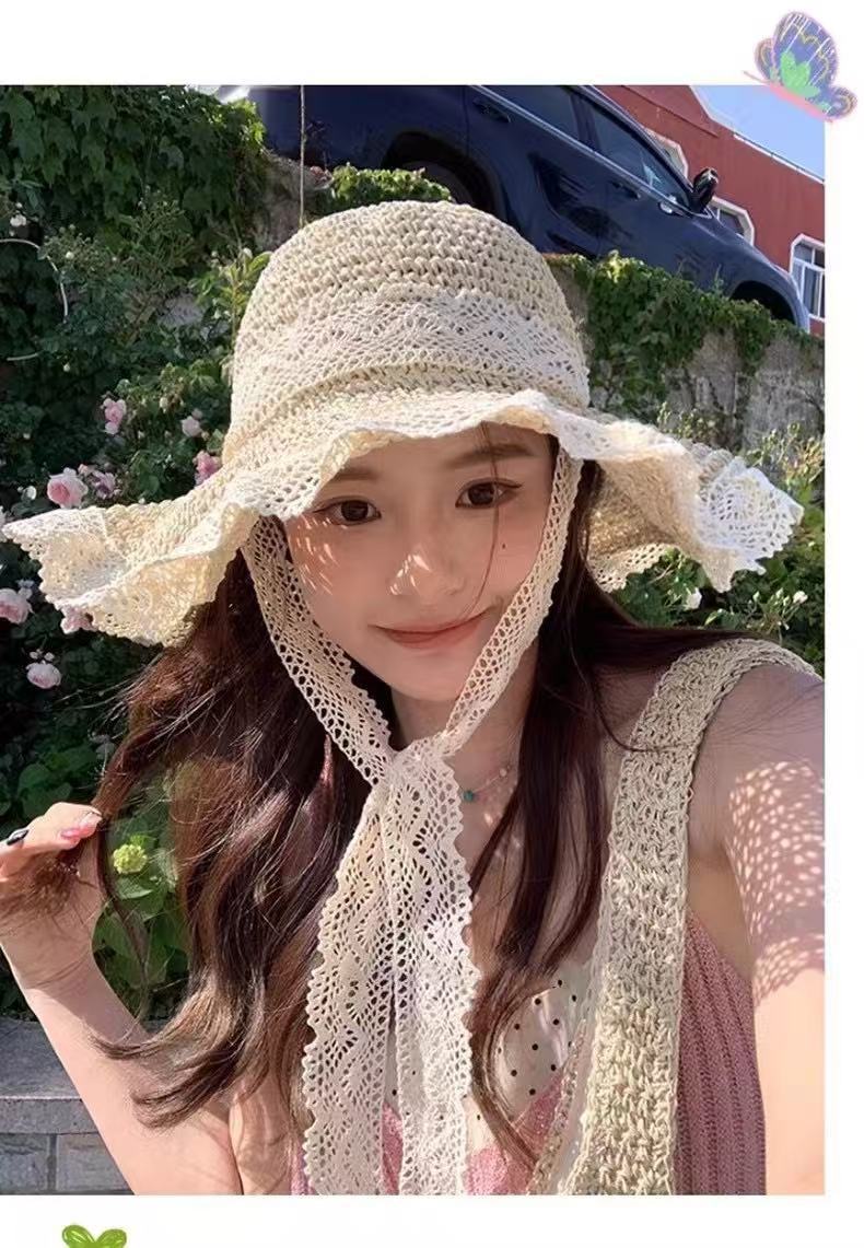 프랑스 밀짚 모자 여자 2024 년 여름 새로운 통기성 레이스 할로우 선 스크린 모자 해변 모자 햇살