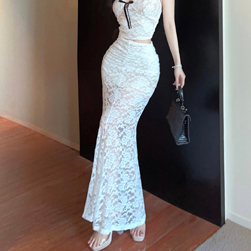 1220 유럽, 미국, 동남아시아 대외 무역 도매 2026 여성복 섹시 레이스 홀터넥 백리스 베스트와 스커트 세트