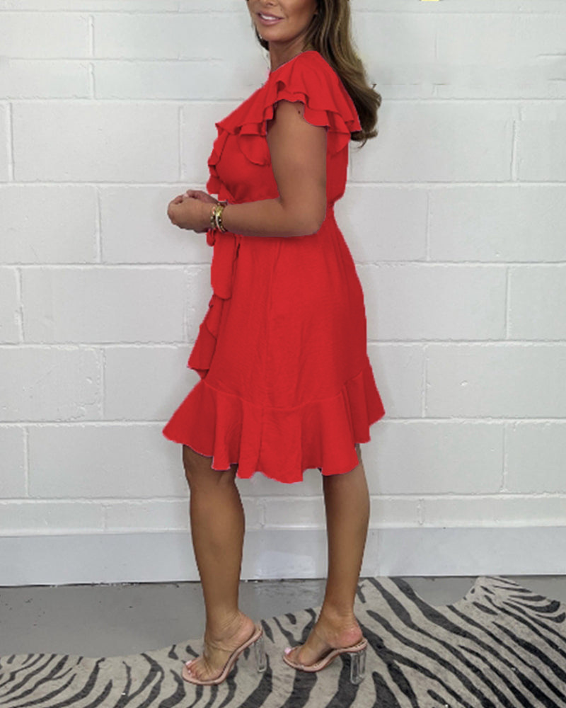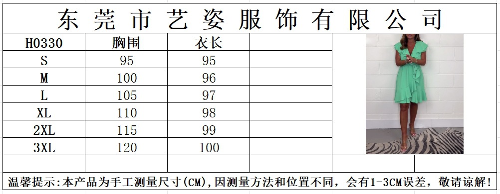 2025 유럽과 미국 여성의 여름 새로운 아마존 V 넥 타이트 허리 스커트 러플 솔리드 컬러 원피스 여성