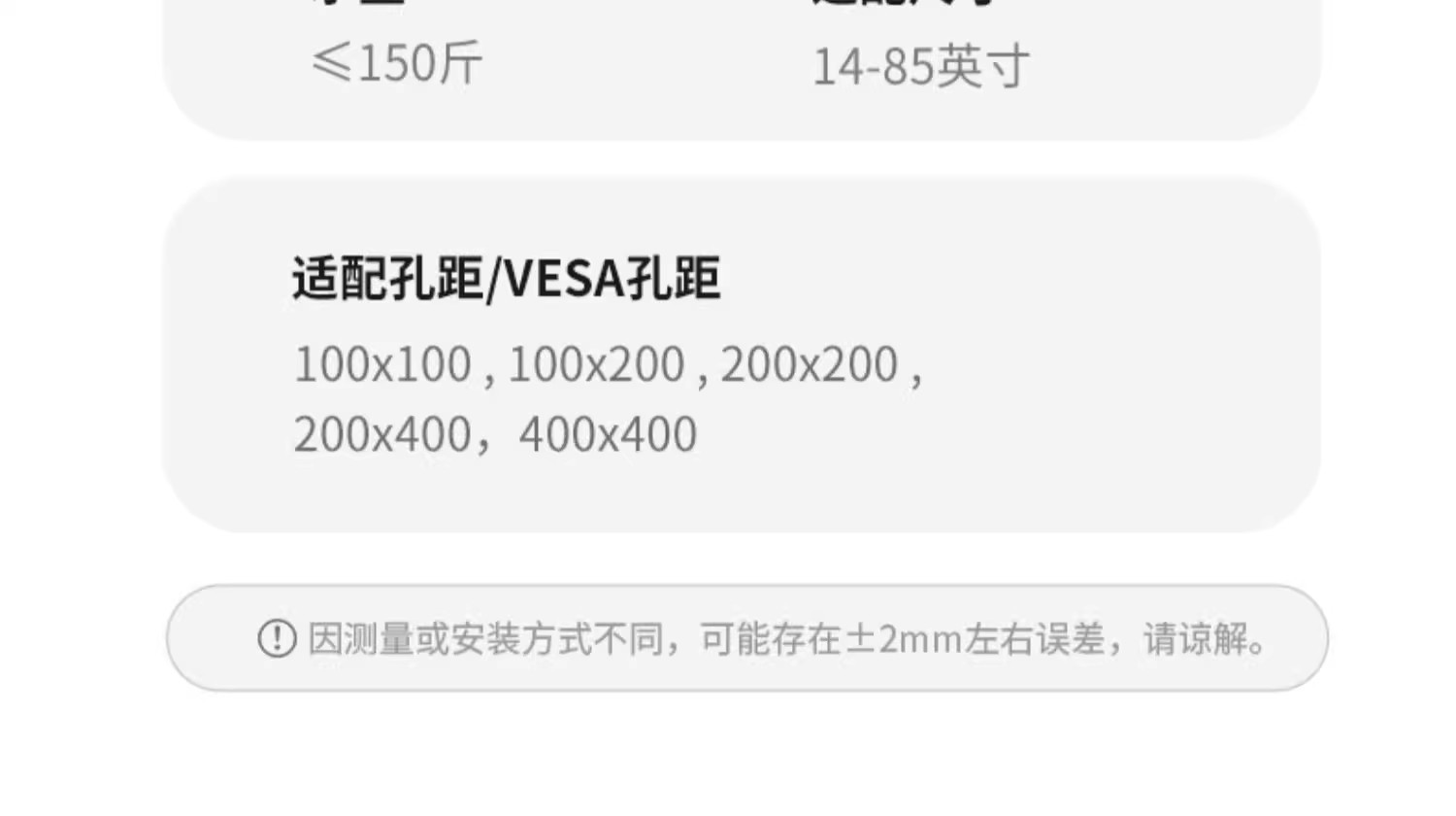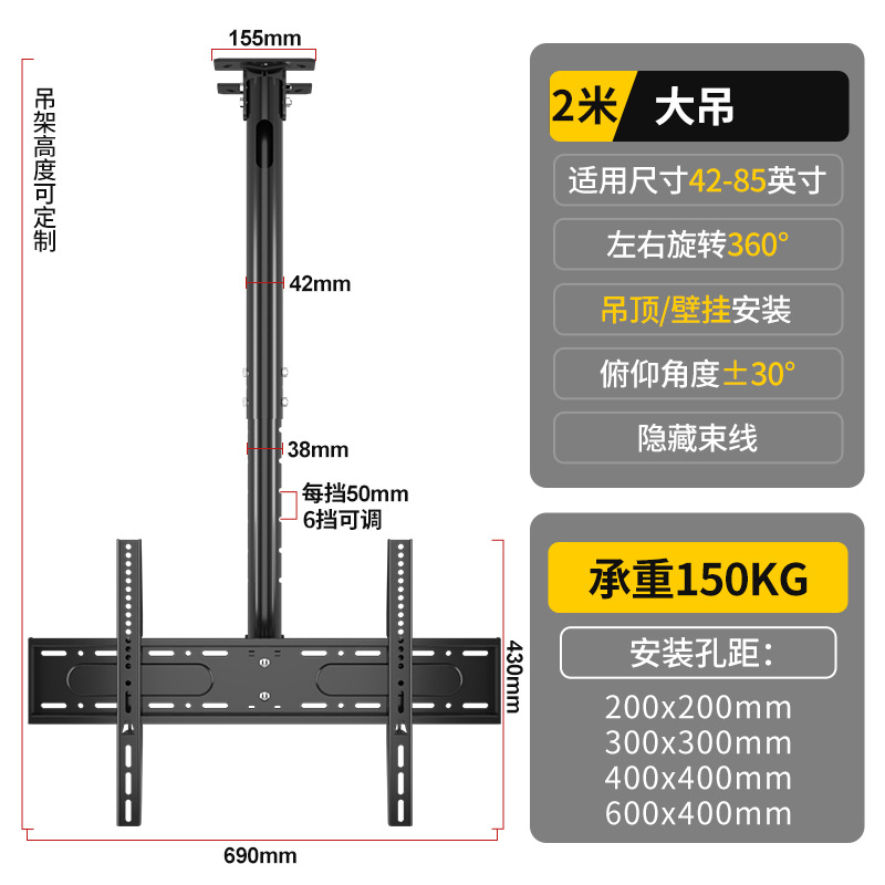 • 42-85inch / 총 길이 2m / 강화 / 리프팅 가능 및 피치 각도 조절 가능 / 측면 장착 가능