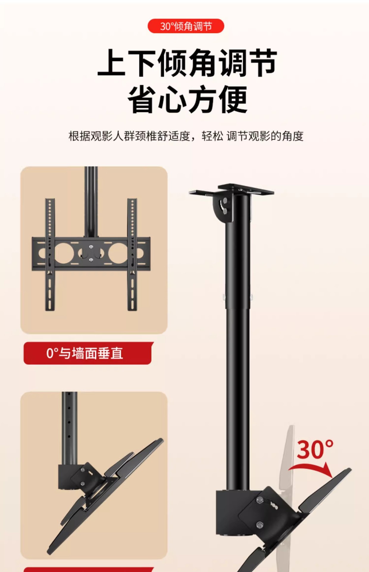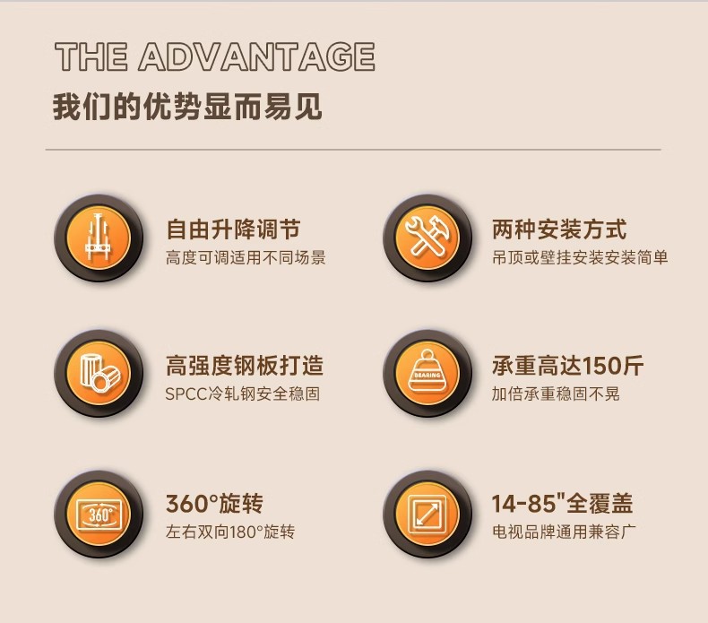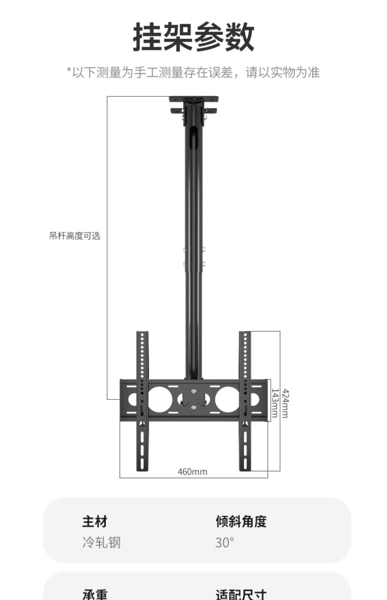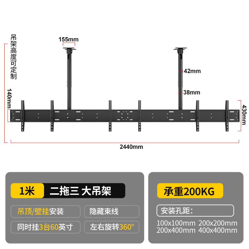 • 42-85inch / 총 길이 3m / 강화 / 리프팅 가능 및 피치 각도 조절 가능 / 측면 장착 가능
