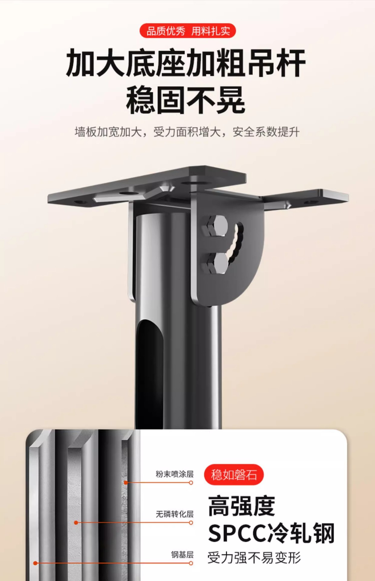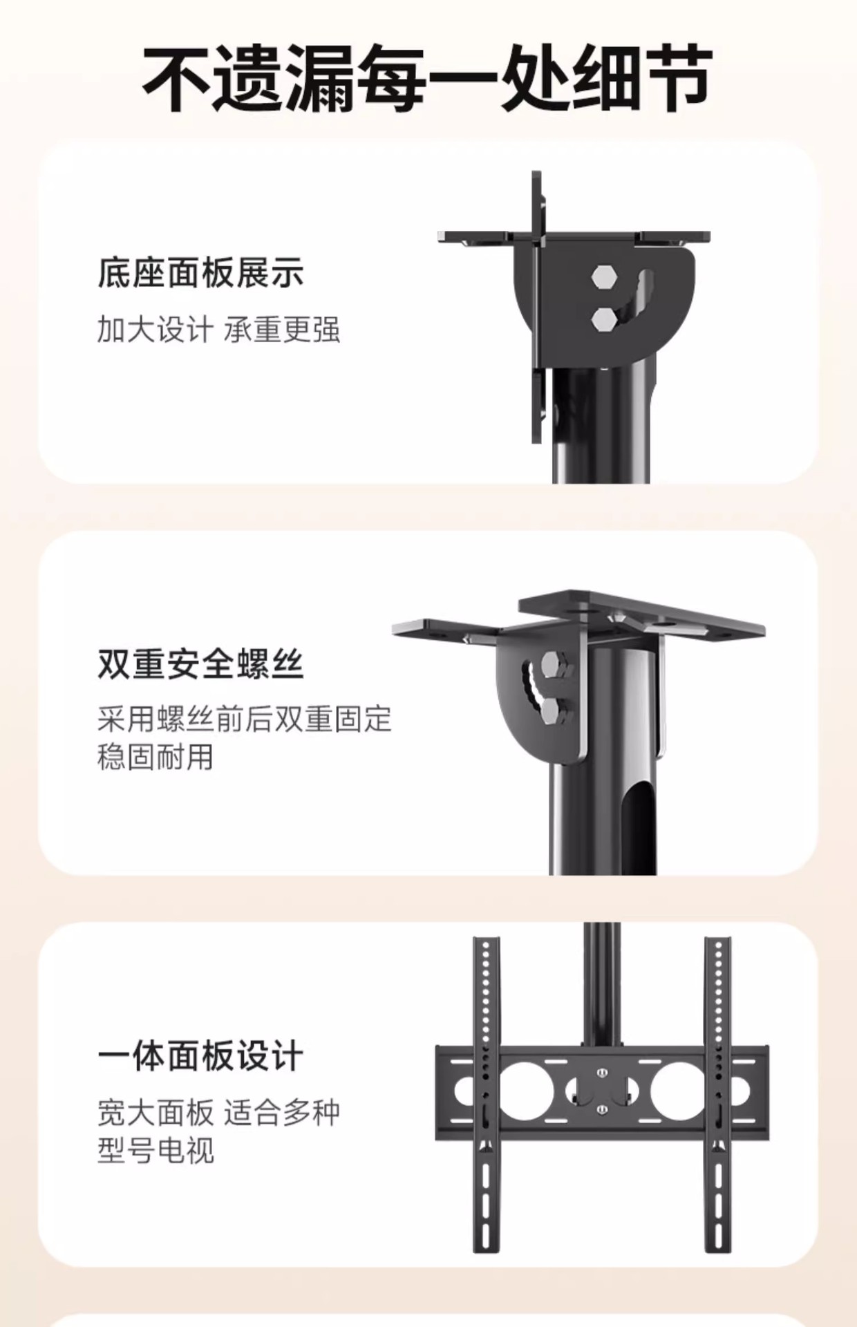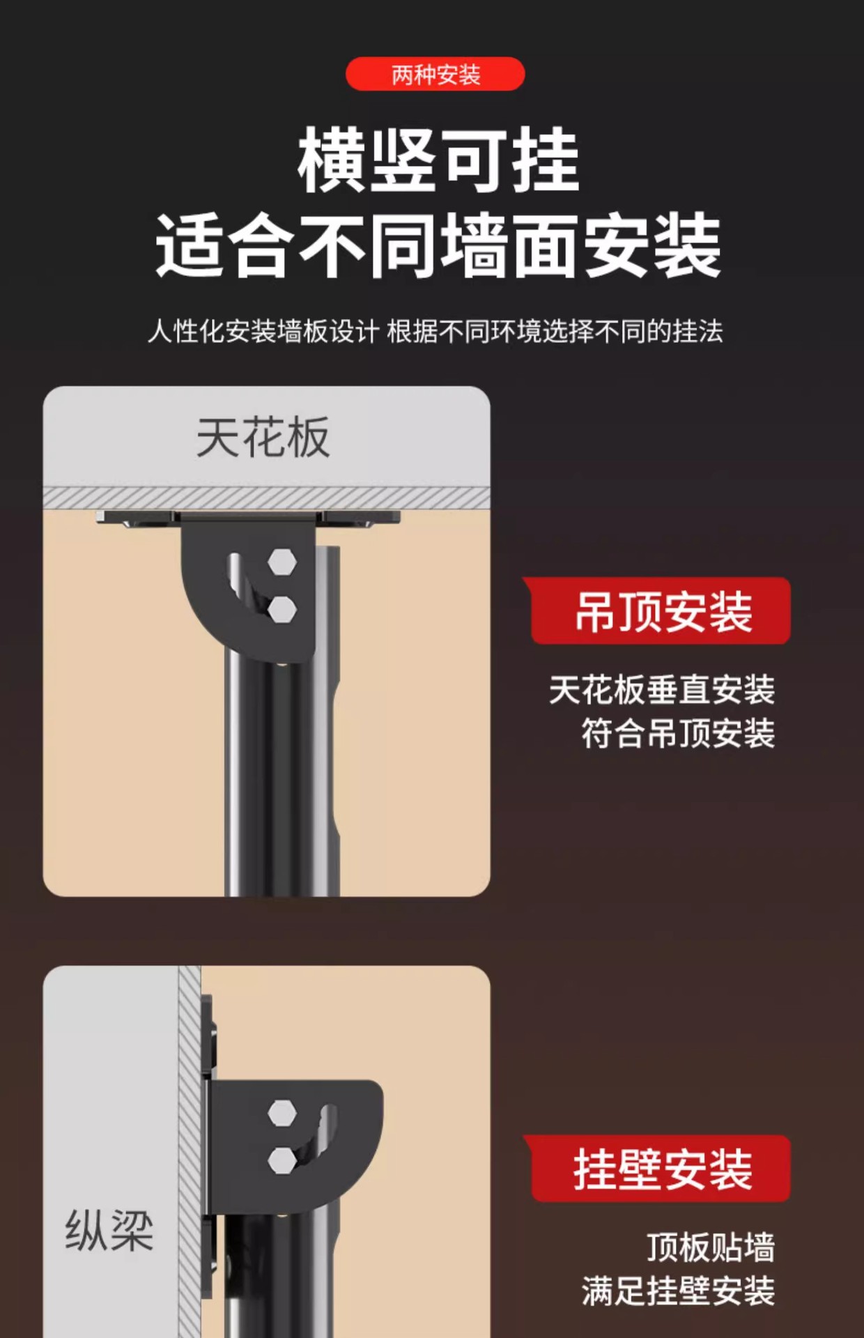 • 42-85inch / 총 길이 3m / 강화 / 리프팅 가능 및 피치 각도 조절 가능 / 측면 장착 가능