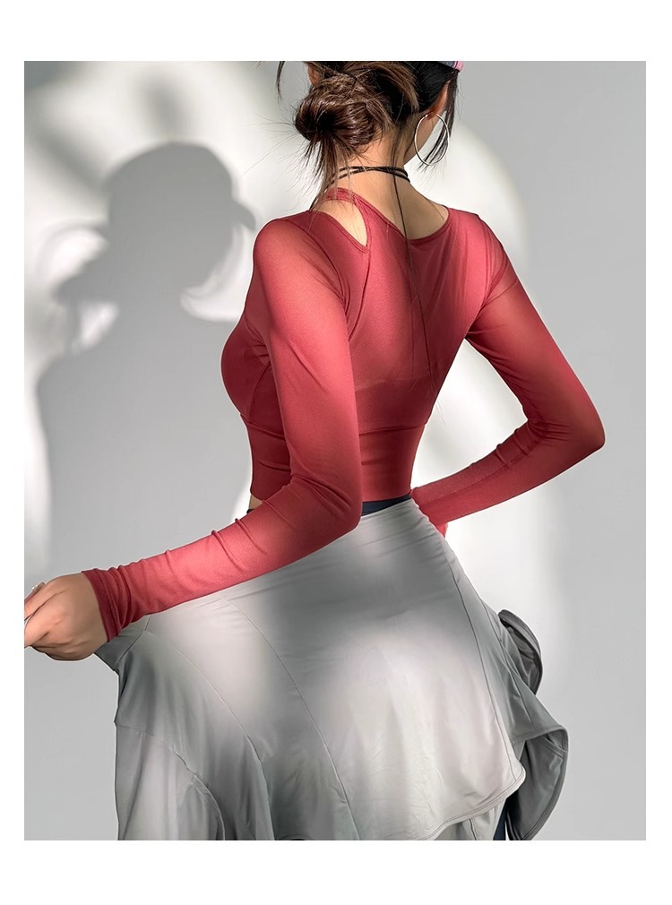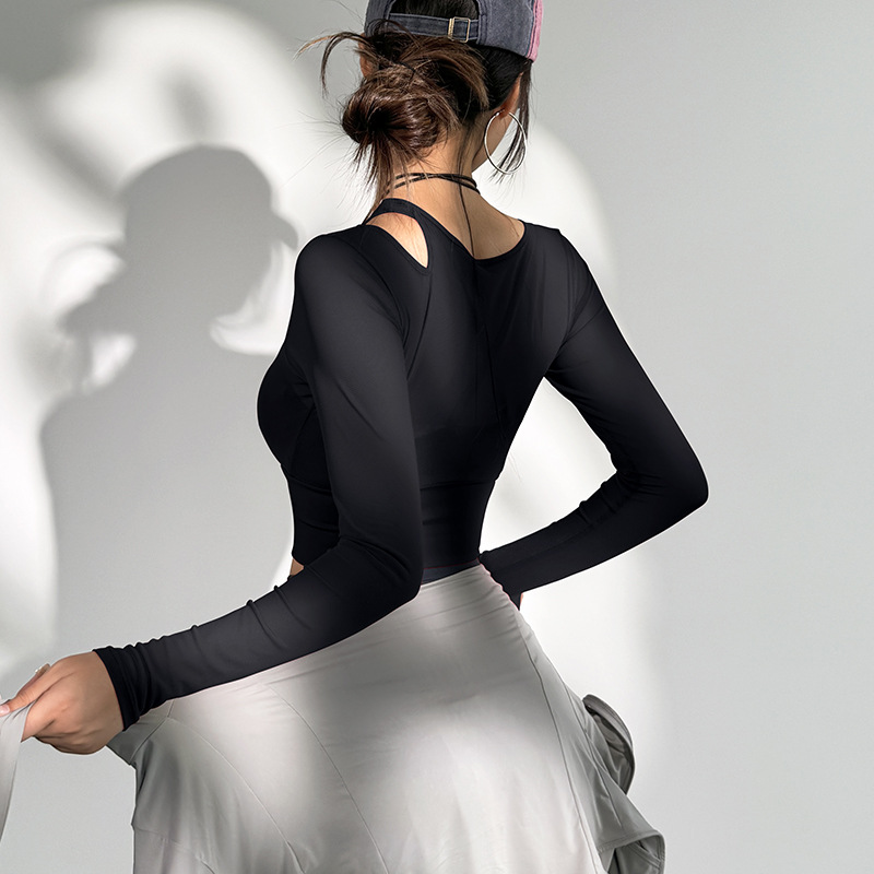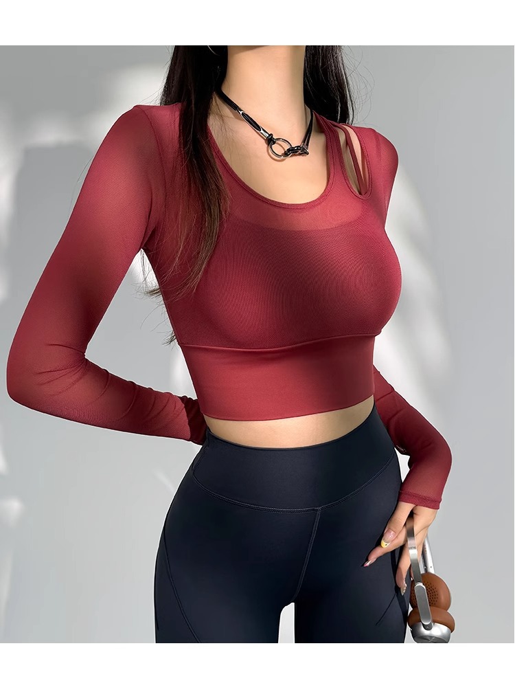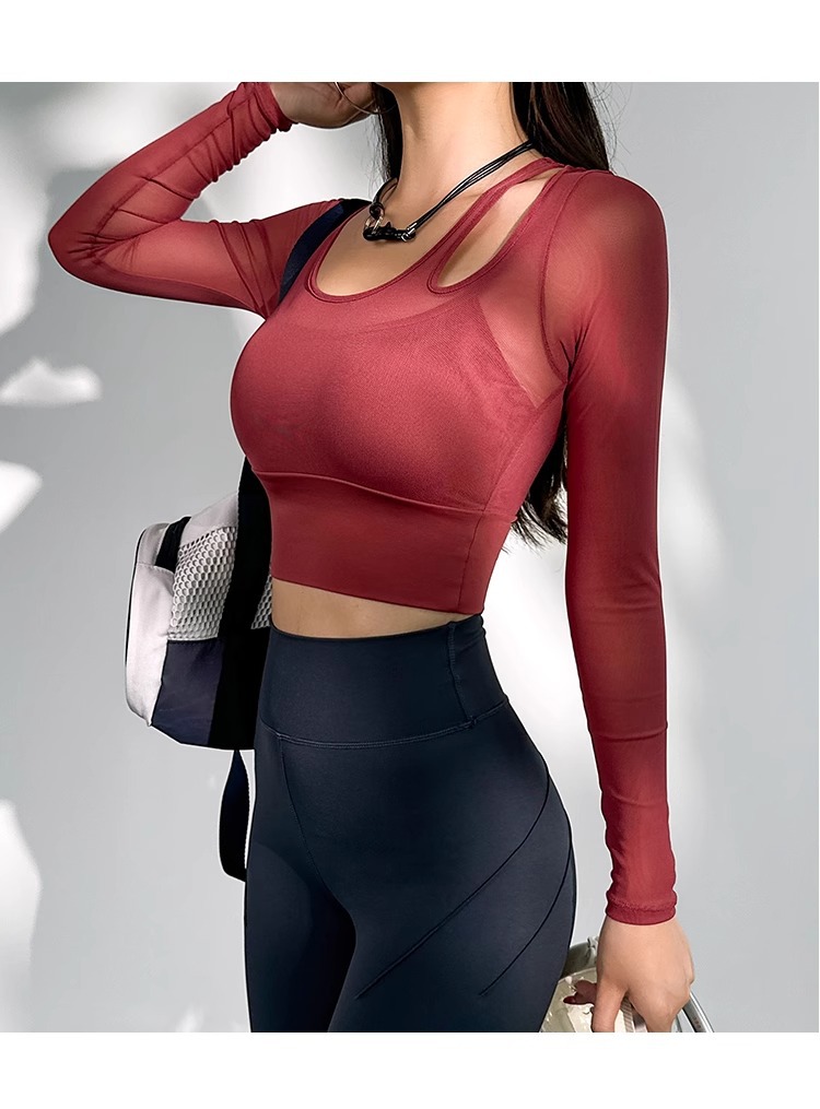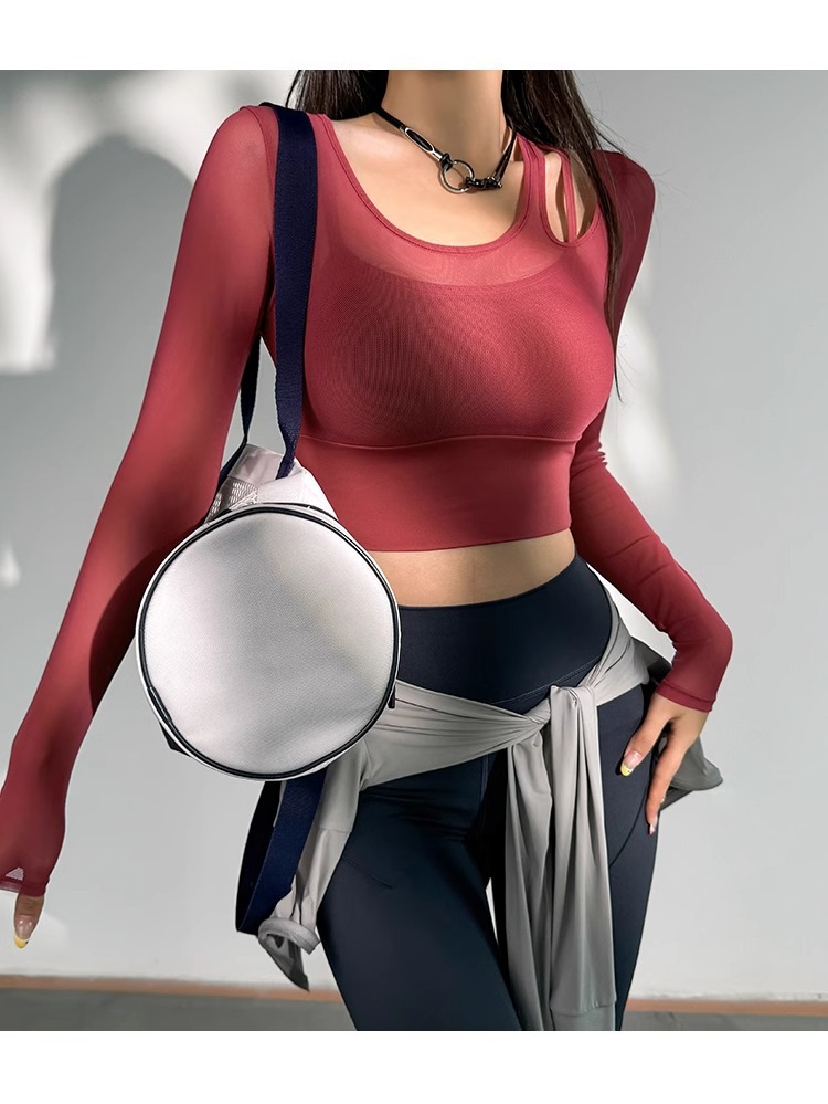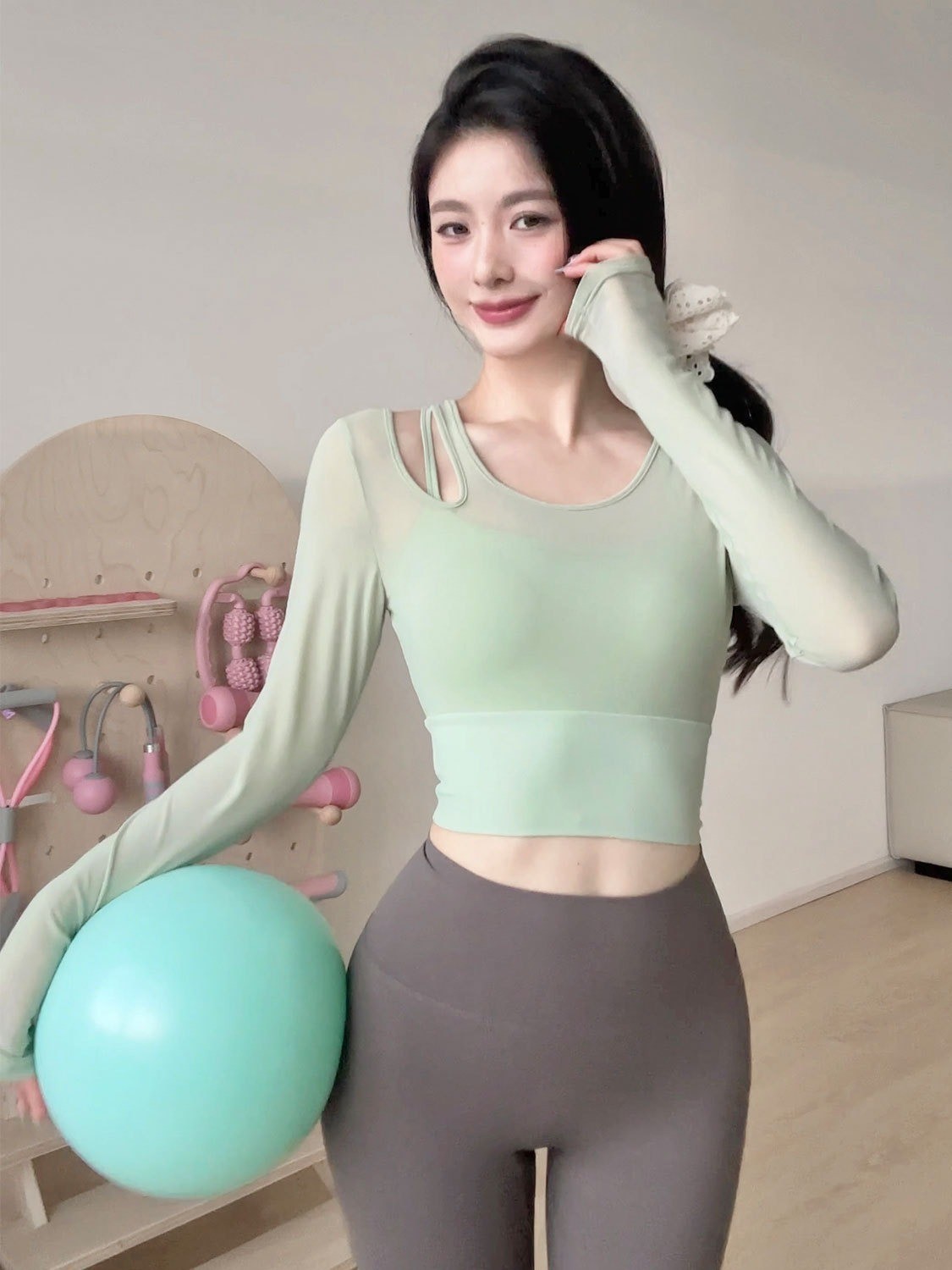 2025 이른 봄 요가 착용 여자 새로운 스타일 스포츠 탑 가슴 패드 우아한 메쉬 긴 소매 러닝 트레이닝 피트니스 착용