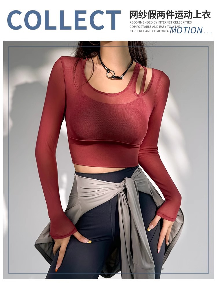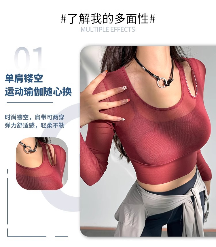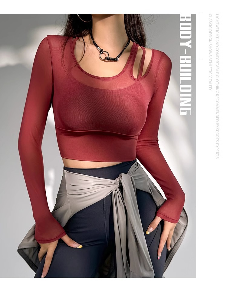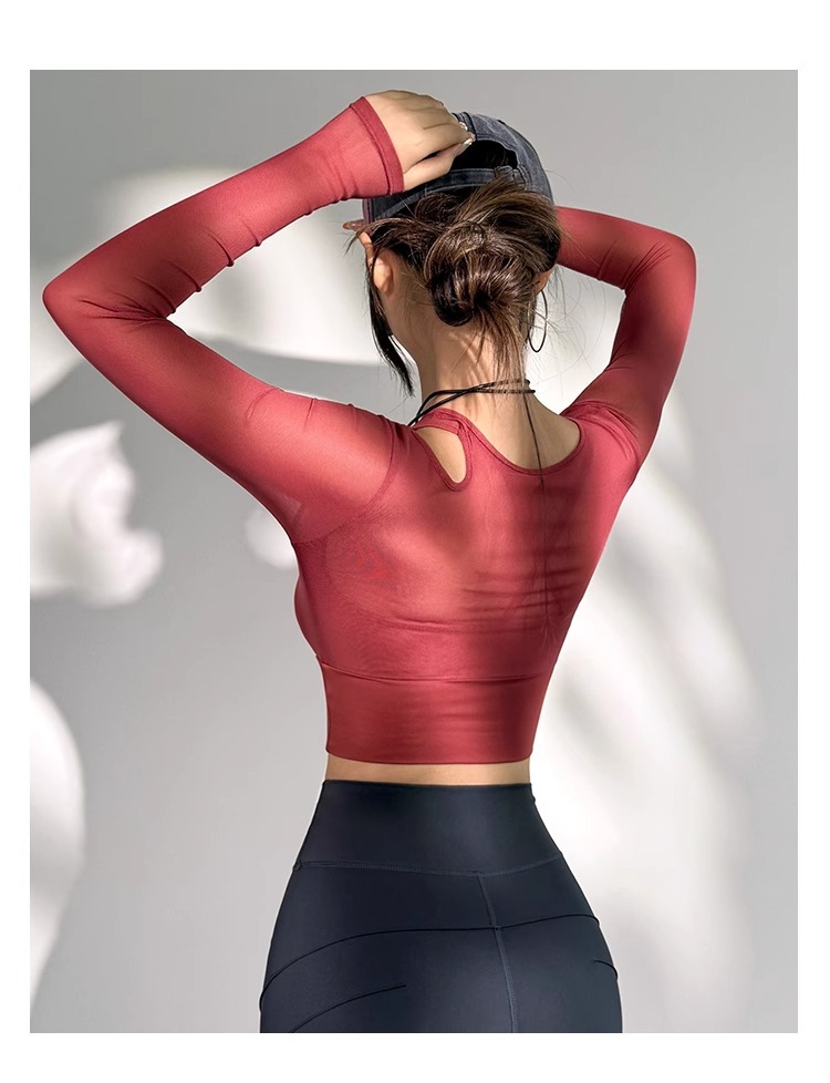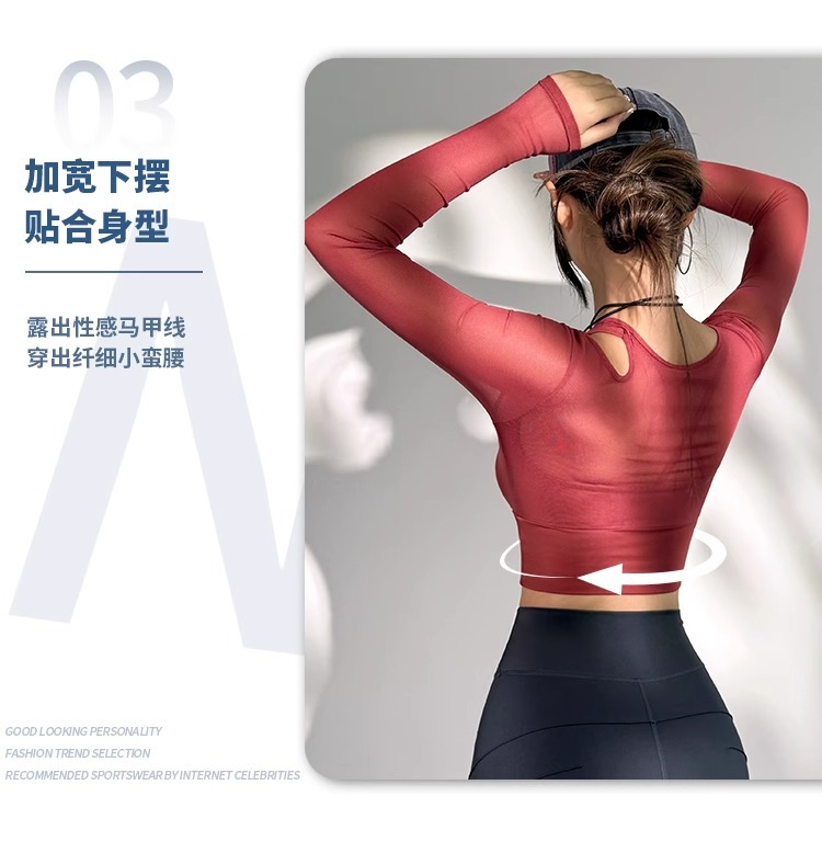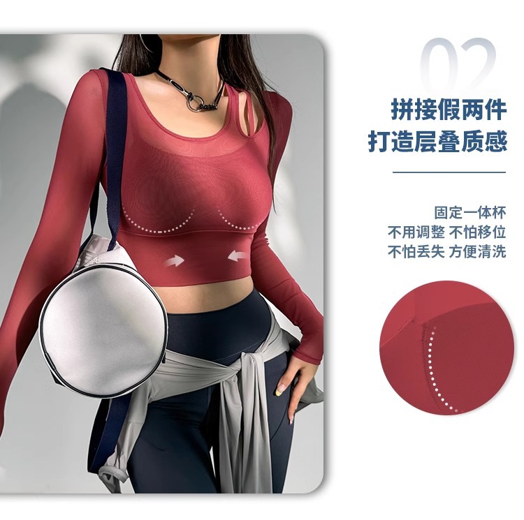 2025 이른 봄 요가 착용 여자 새로운 스타일 스포츠 탑 가슴 패드 우아한 메쉬 긴 소매 러닝 트레이닝 피트니스 착용스토어 가기