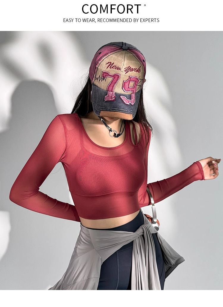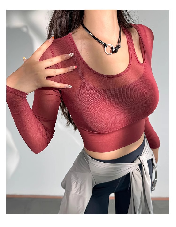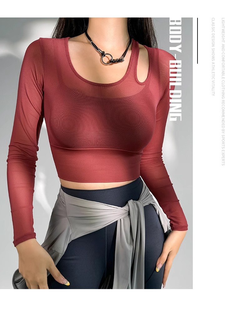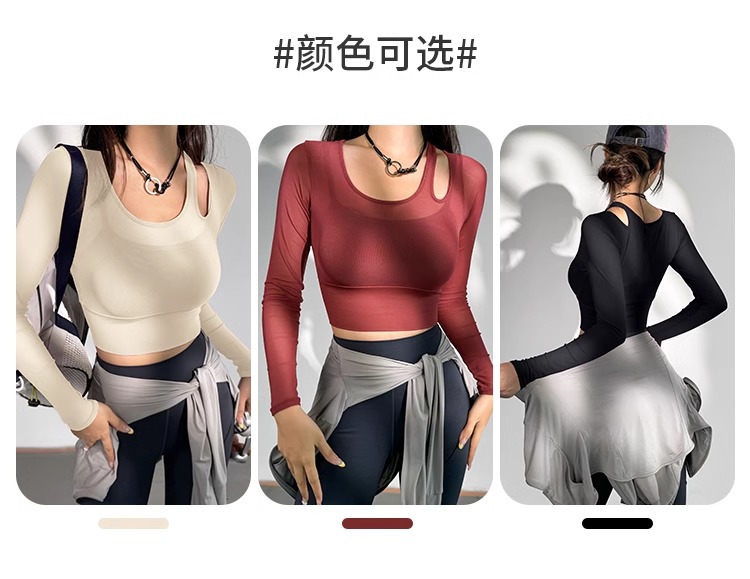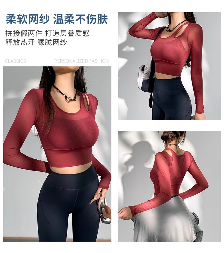 2025 이른 봄 요가 착용 여자 새로운 스타일 스포츠 탑 가슴 패드 우아한 메쉬 긴 소매 러닝 트레이닝 피트니스 착용스토어 가기