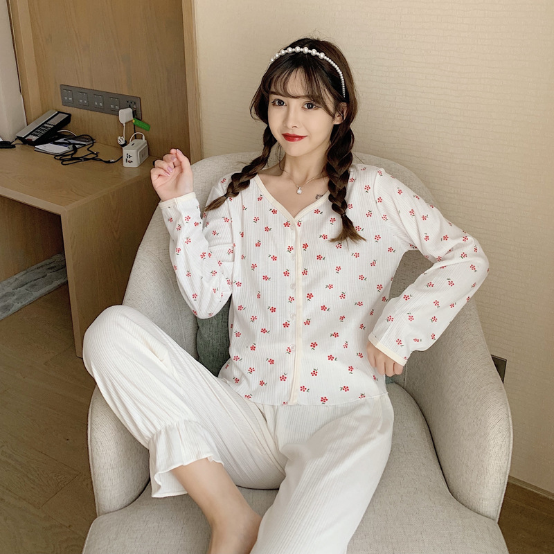 2026년 신상 여성용 잠옷 봄, 가을 6535 면 긴팔 한국 스타일 달콤한 인스타 스타일 홈웨어 세트 외부에서 착용 가능