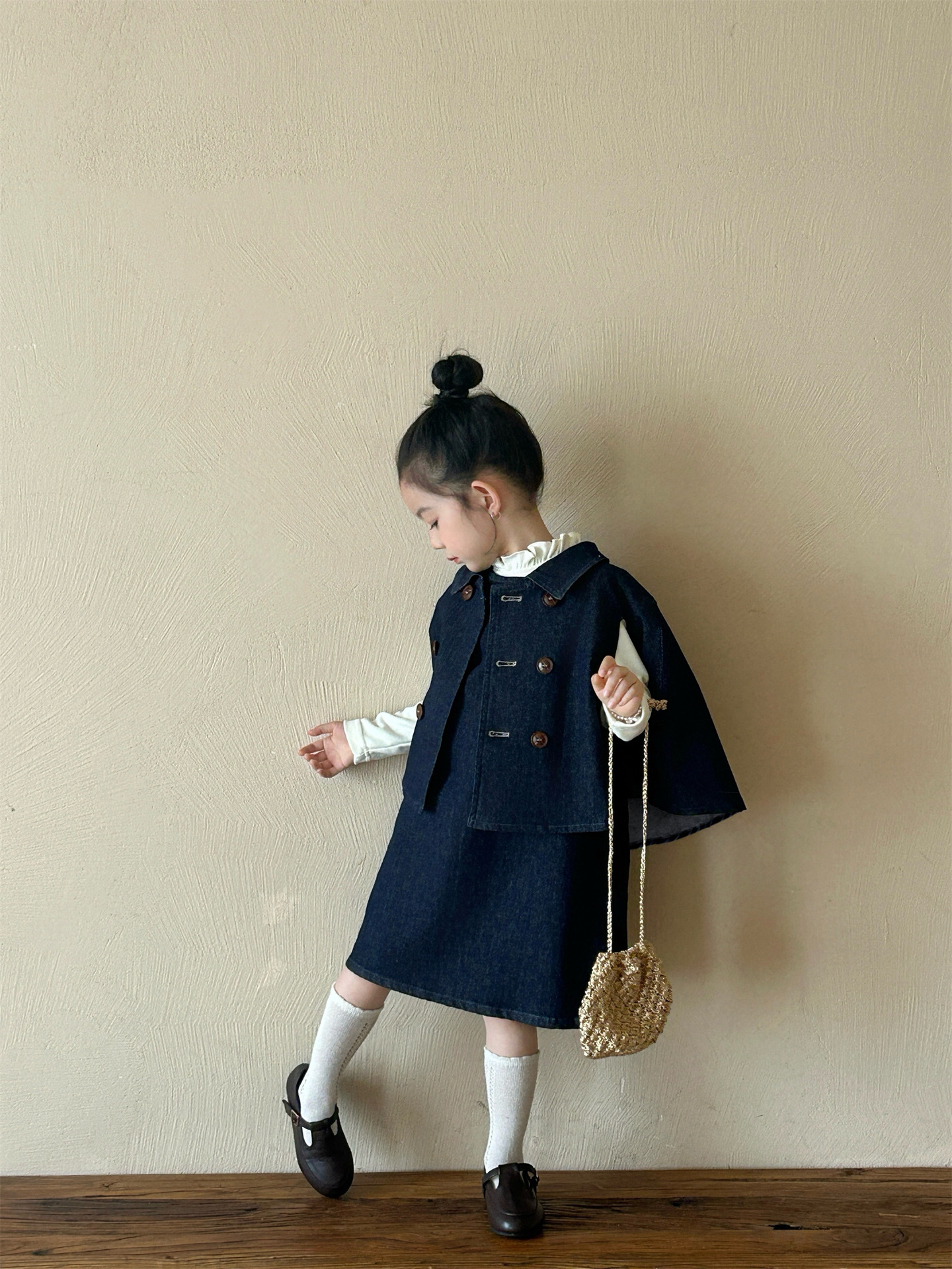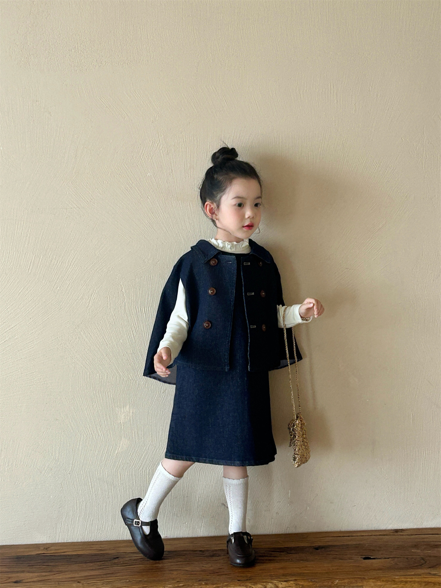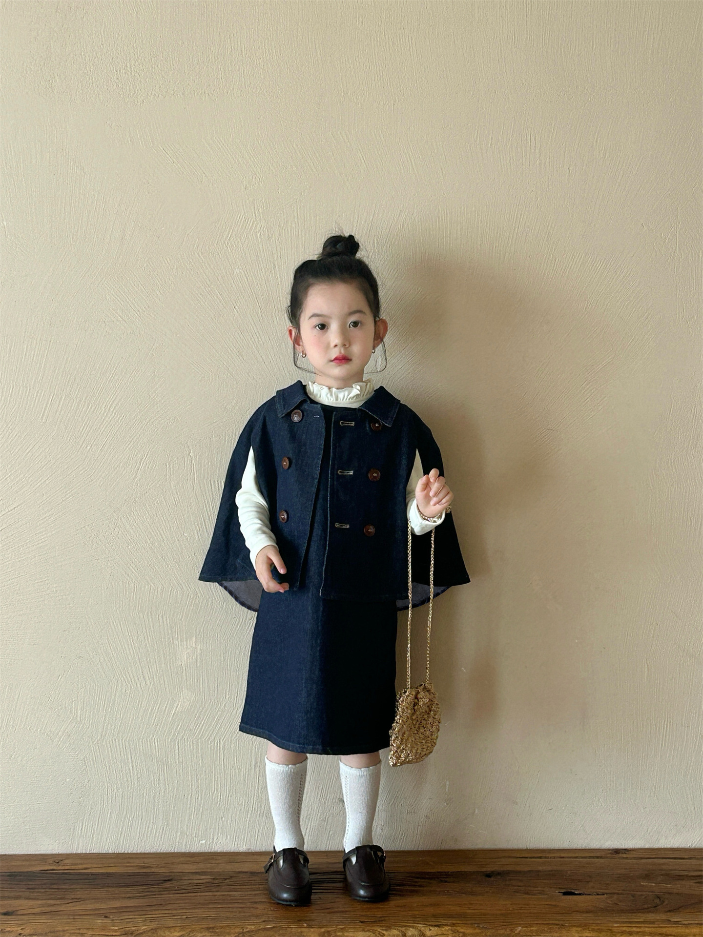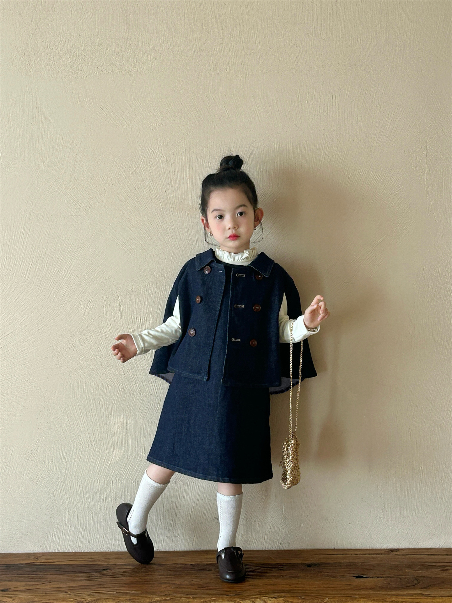 2025 봄 새 소녀 유행 데님 세트 어린이 서양식 케이프 바닥 셔츠 조끼 스커트 3 피스 세트스토어 가기