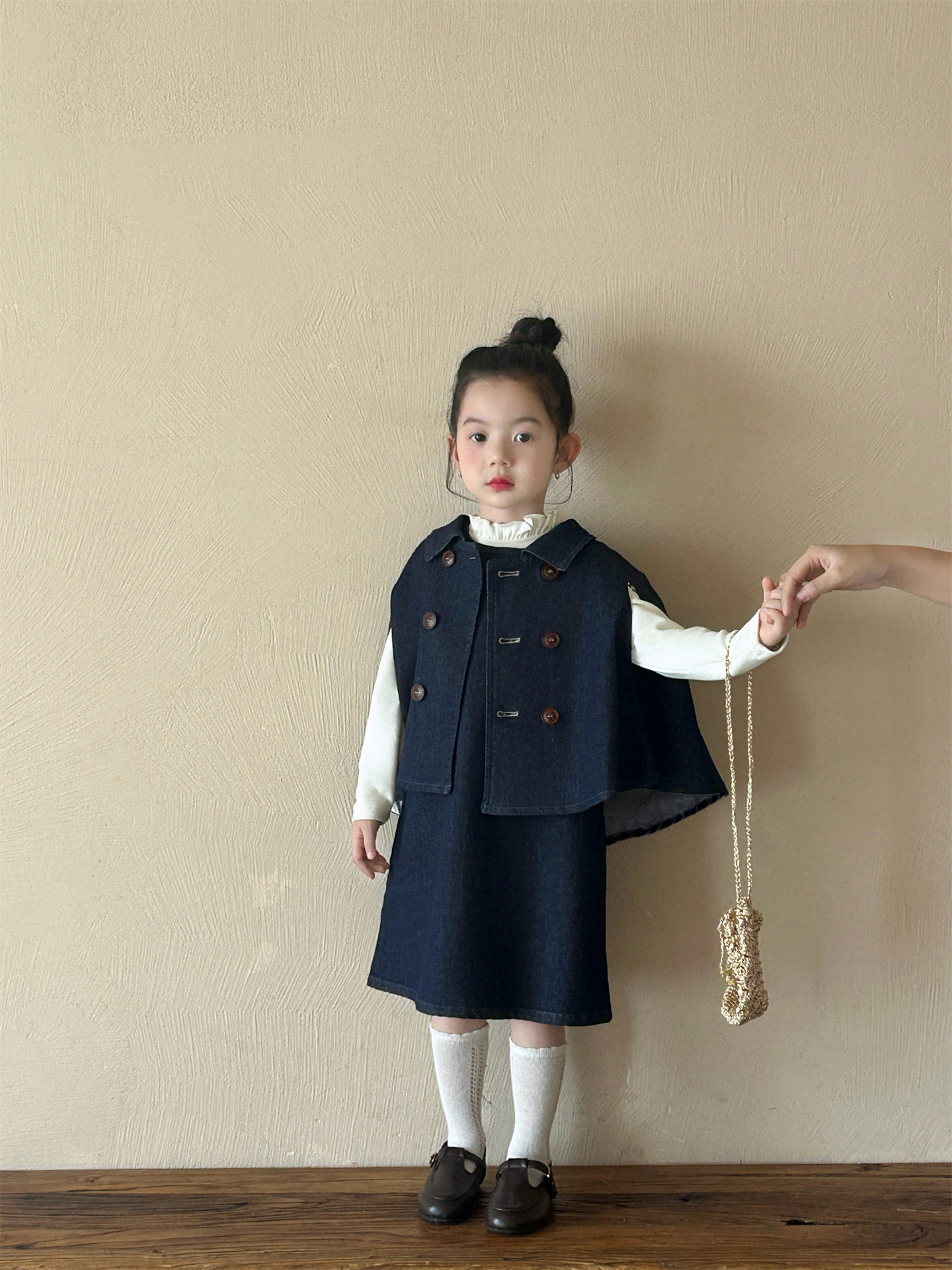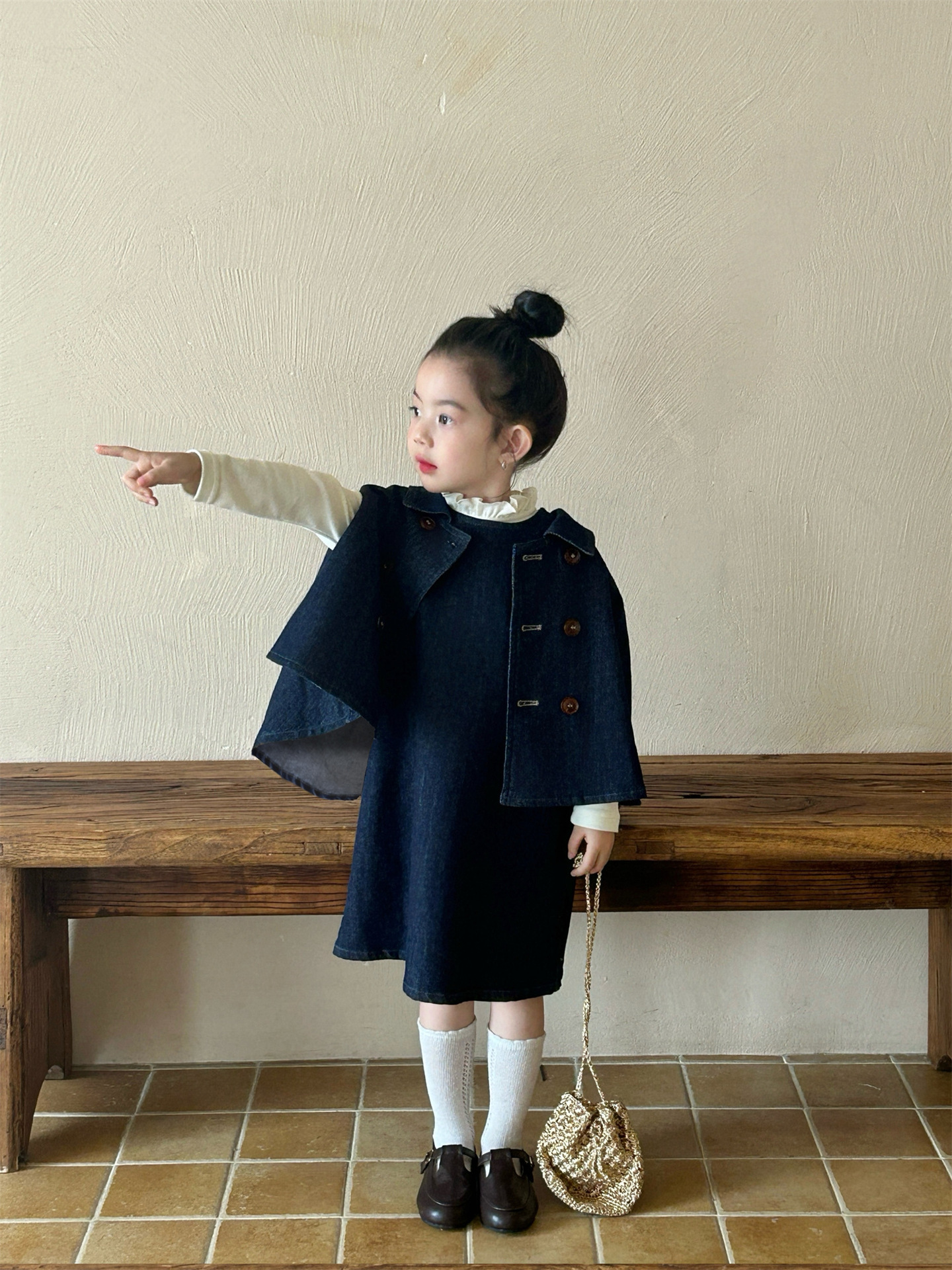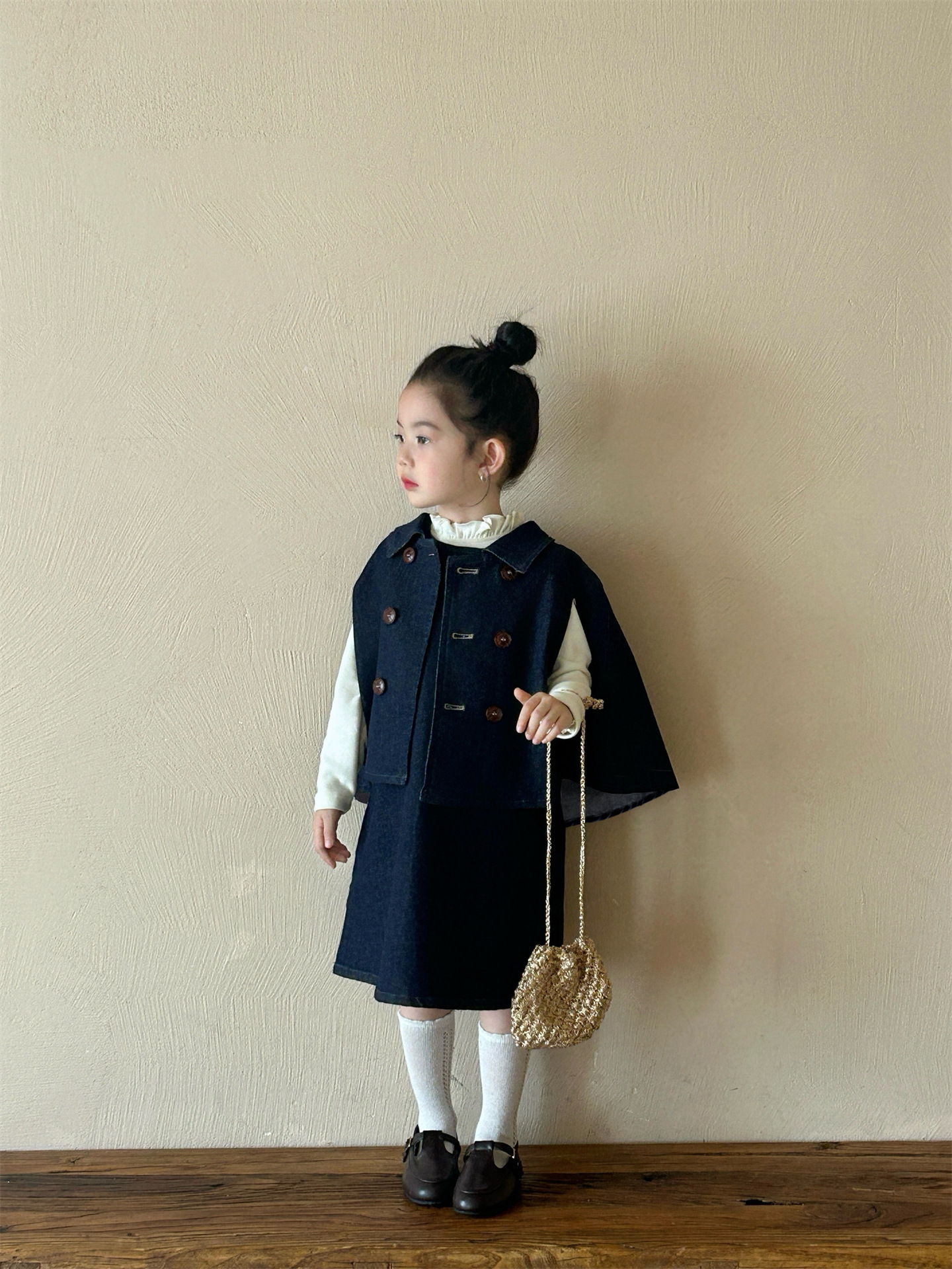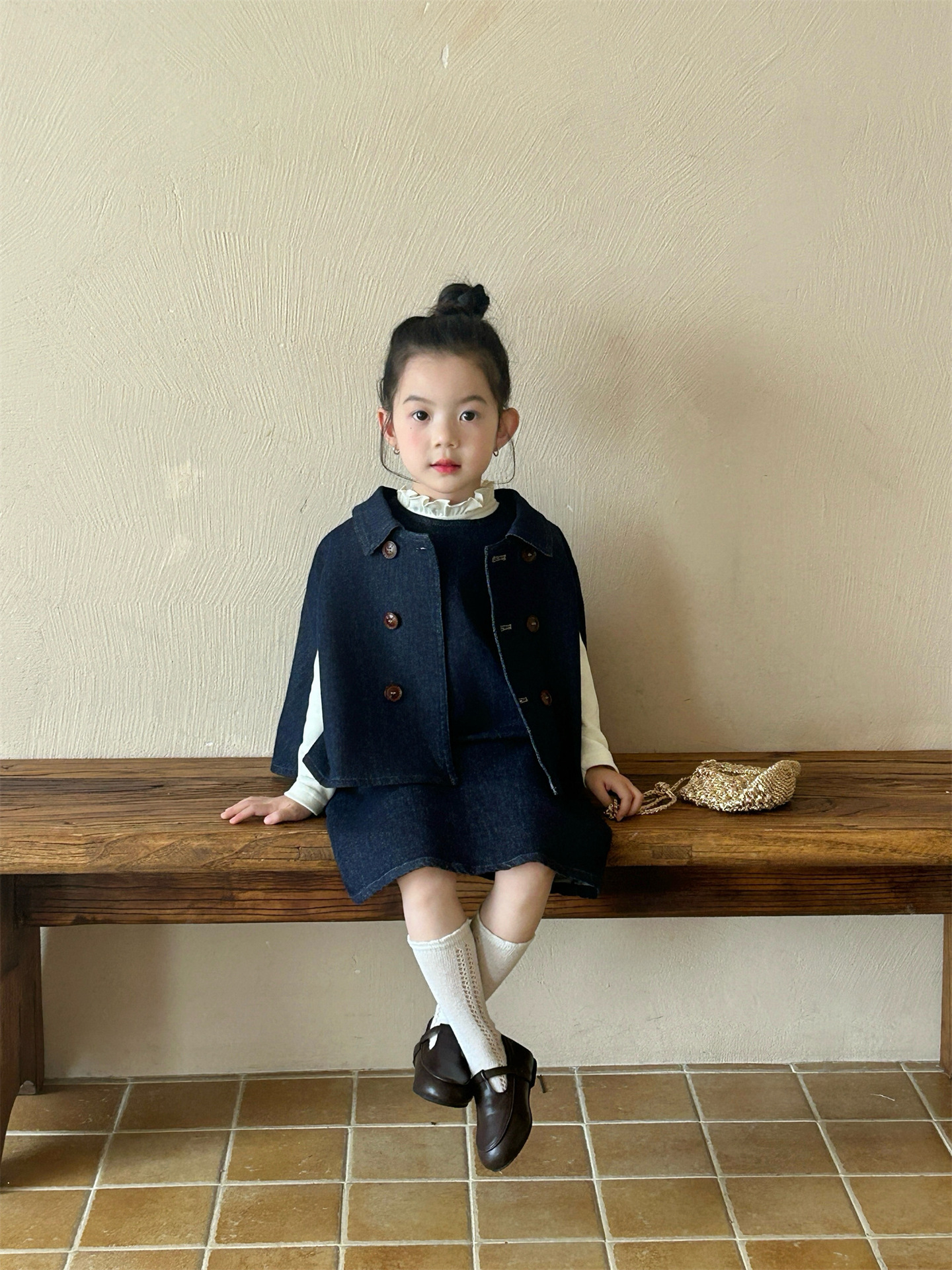 2025 봄 새 소녀 유행 데님 세트 어린이 서양식 케이프 바닥 셔츠 조끼 스커트 3 피스 세트스토어 가기