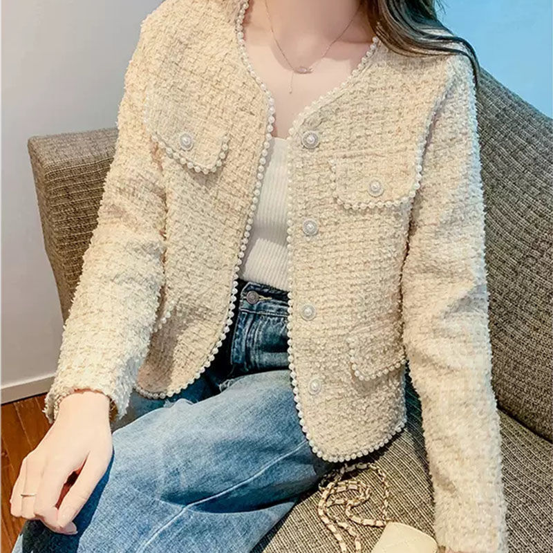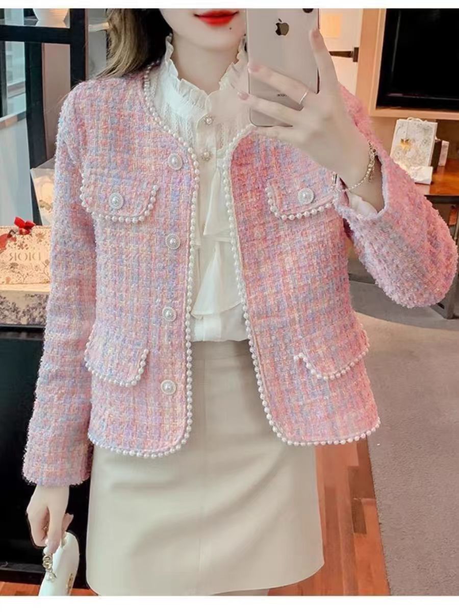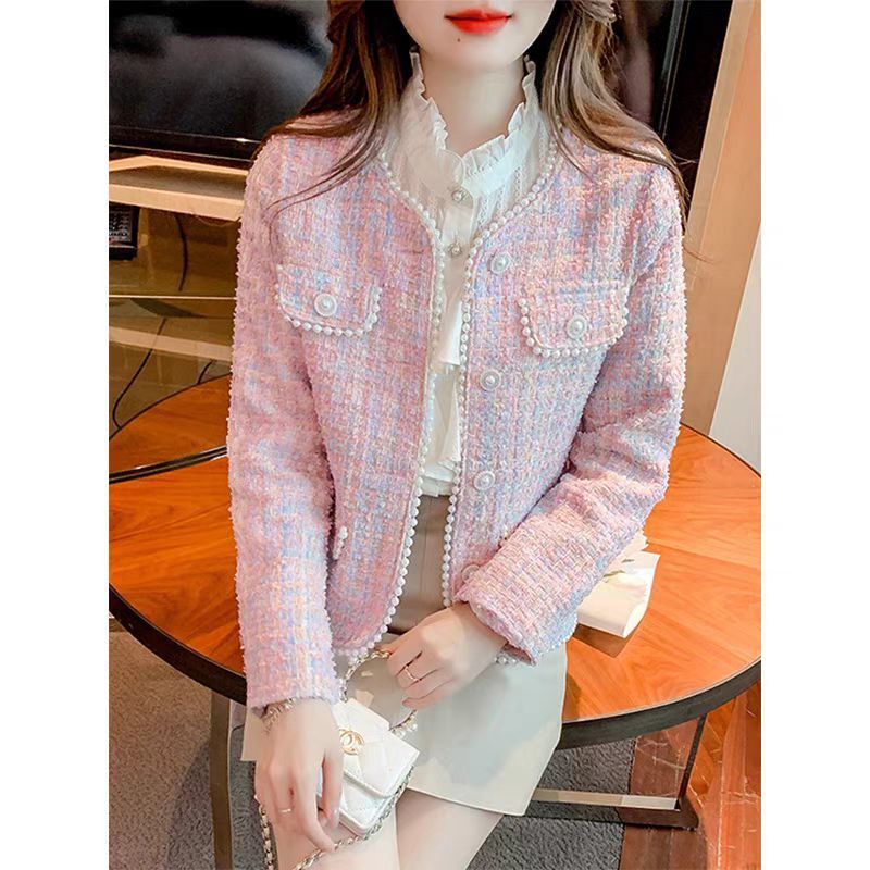 핑크 사교계 짧은 샤넬 스타일 코트 여성의 봄과 가을 새로운 스타일 쁘띠 프랑스 하이 엔드 비즈 탑 재킷