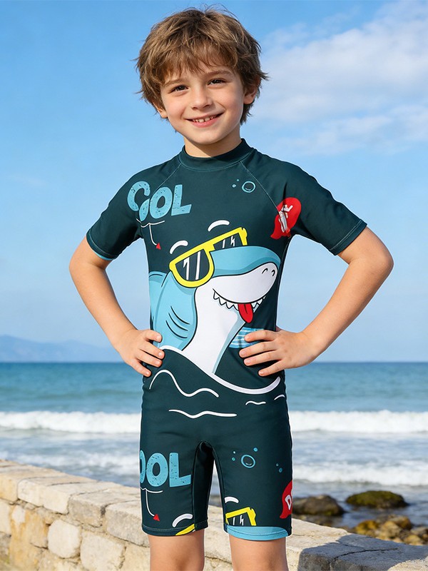소년의 새로운 원피스 반팔 수영복 어린이 작은, 중간 및 큰 어린이 학생 수영복 만화 아기 서핑 옷 도매
