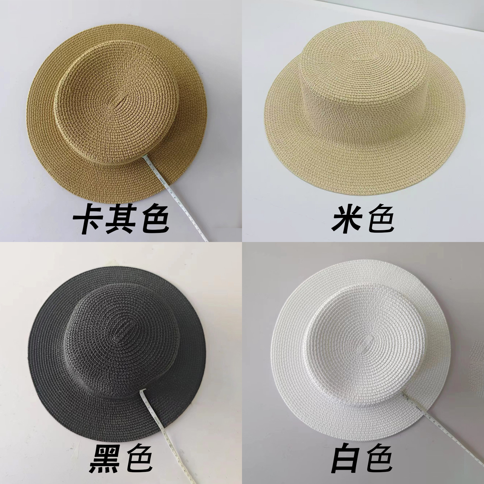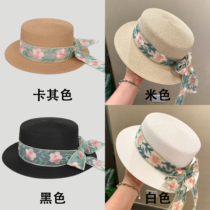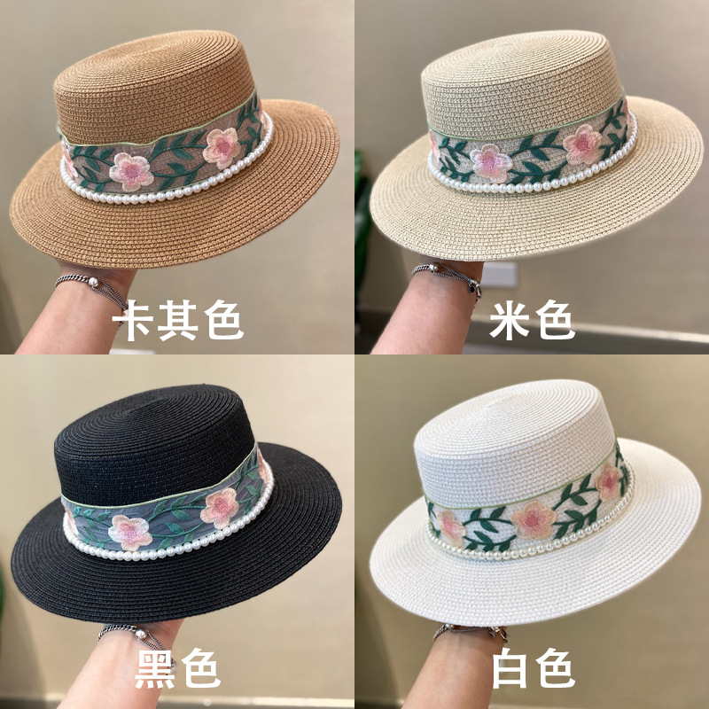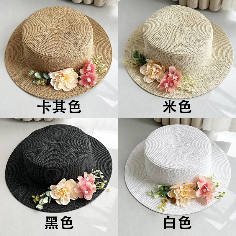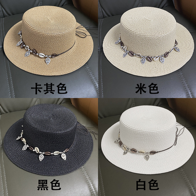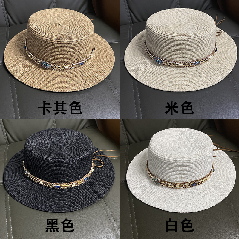 플랫 탑 밀짚 모자 여성의 프랑스 밀짚 탑 모자 2025 새로운 여름 큰 브림 햇빛 모자 해변 휴일 태양 모자스토어 가기