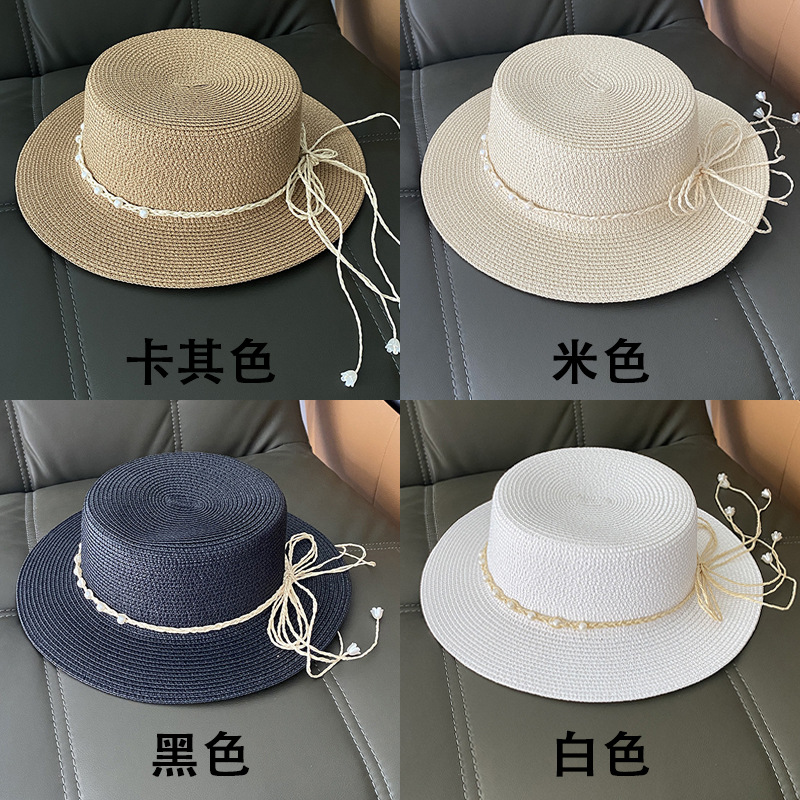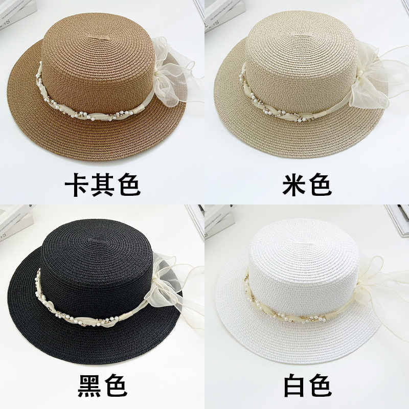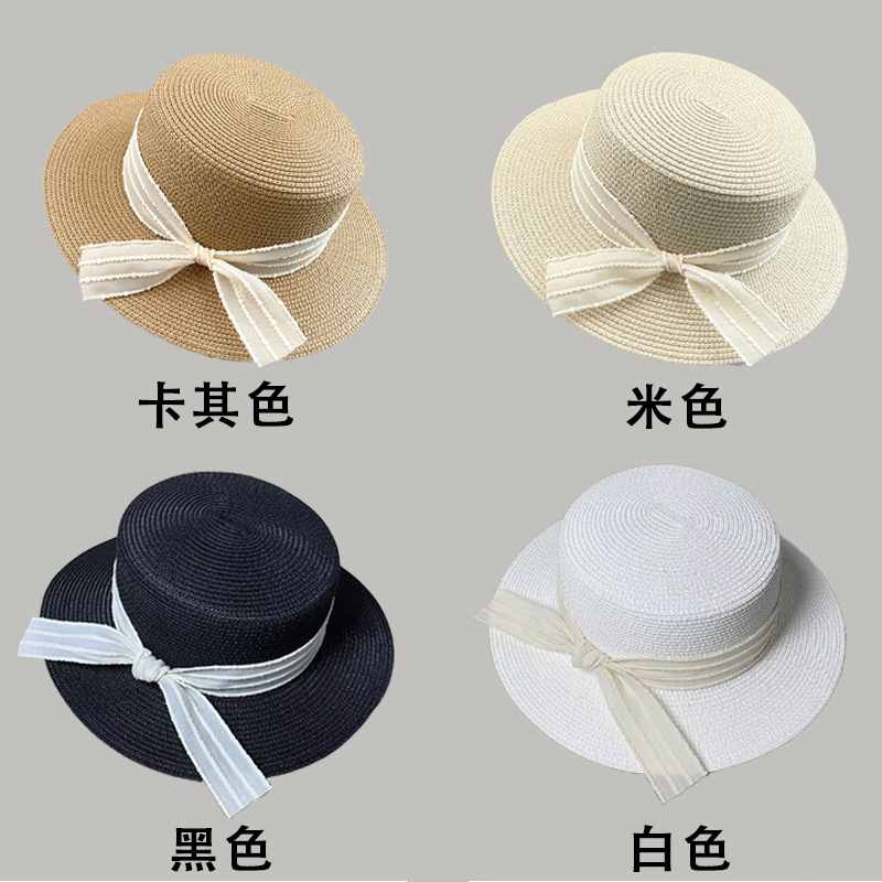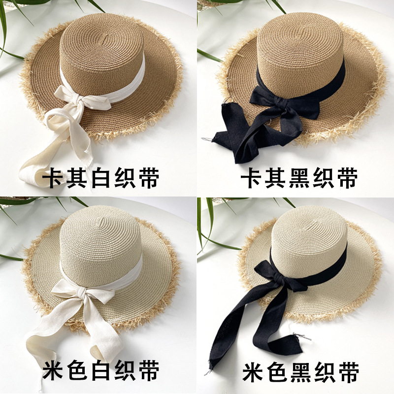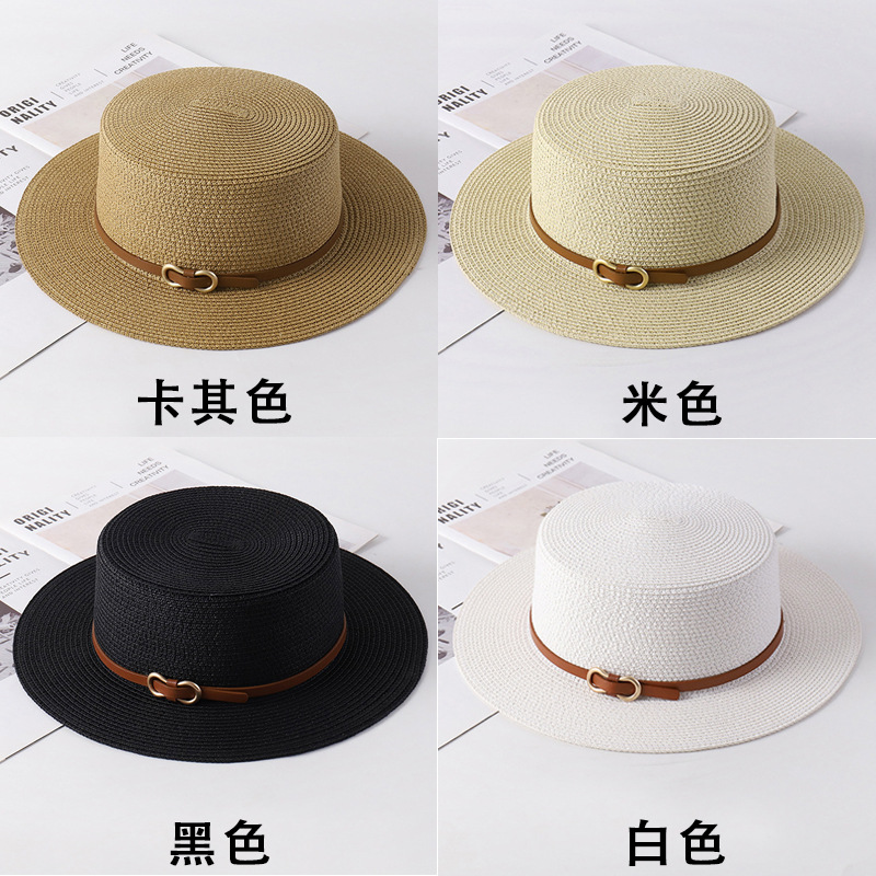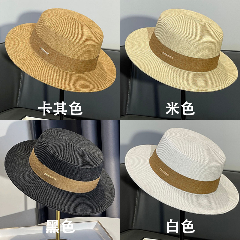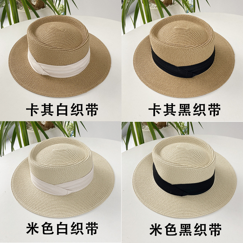 플랫 탑 밀짚 모자 여성의 프랑스 밀짚 탑 모자 2025 새로운 여름 큰 브림 햇빛 모자 해변 휴일 태양 모자