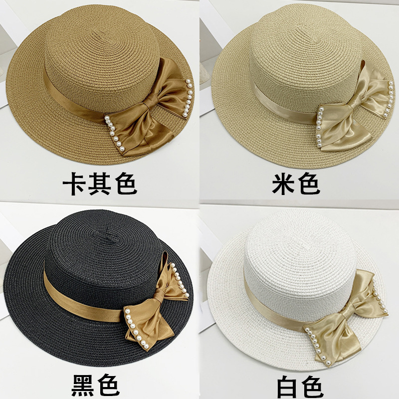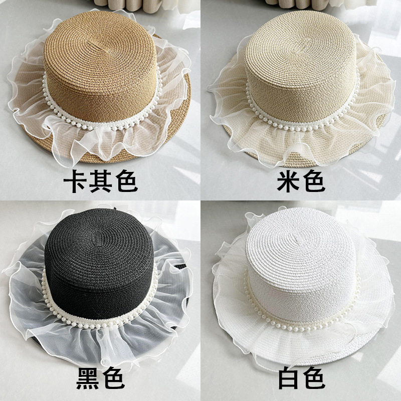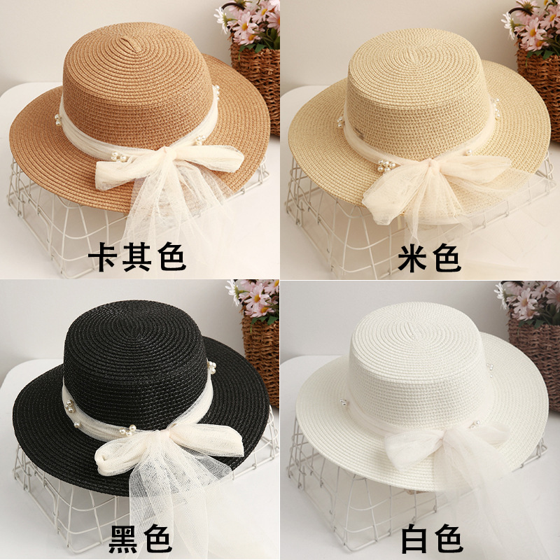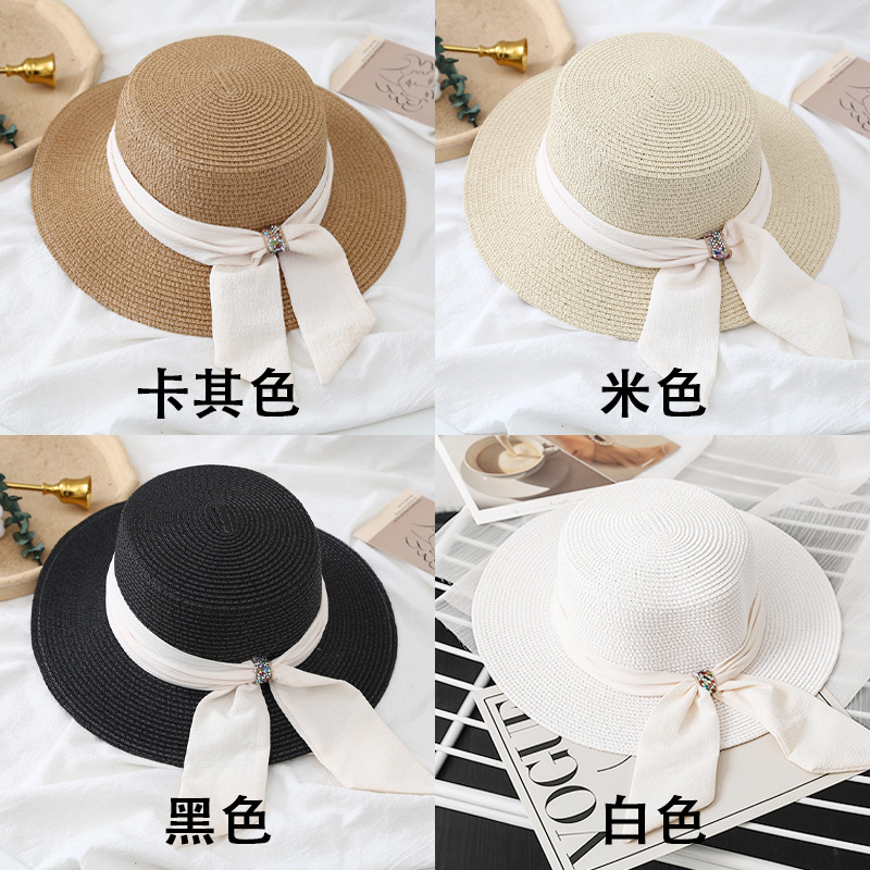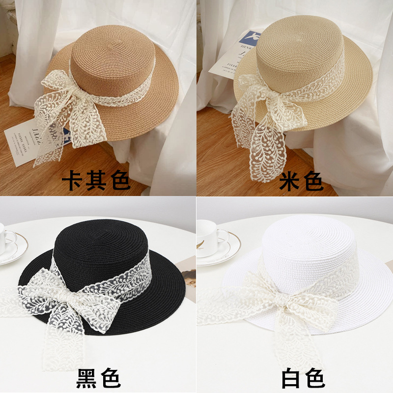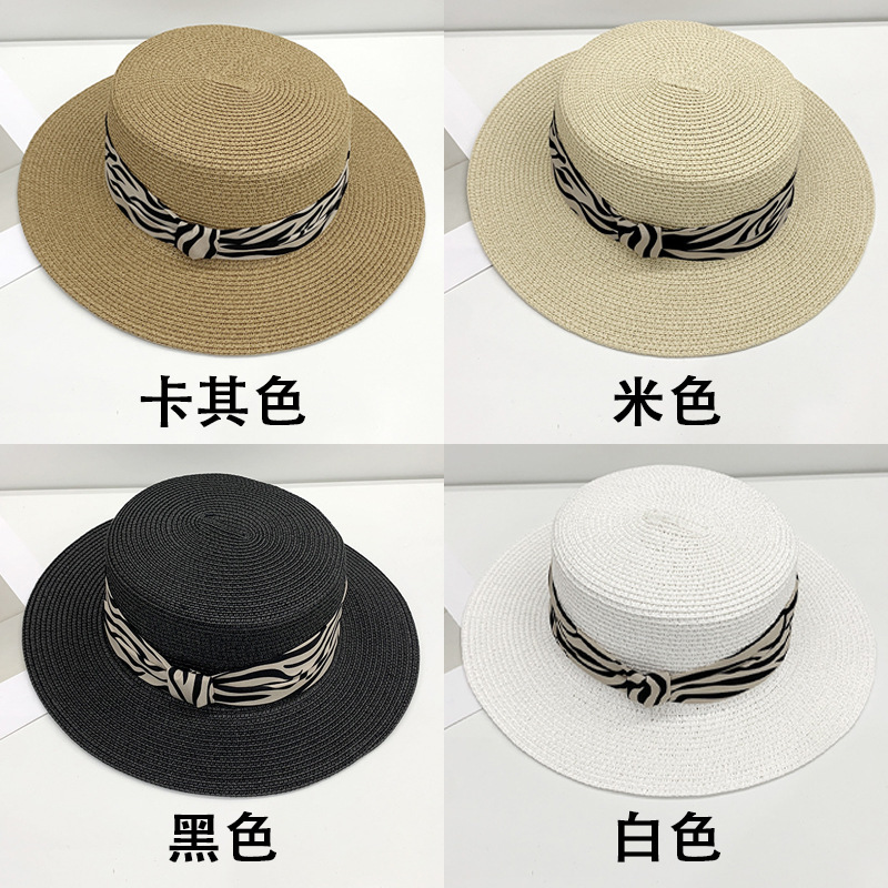 플랫 탑 밀짚 모자 여성의 프랑스 밀짚 탑 모자 2025 새로운 여름 큰 브림 햇빛 모자 해변 휴일 태양 모자
