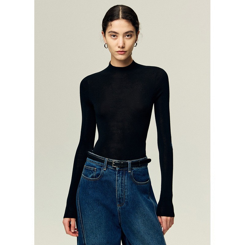 [Yangzi 원사] 심리스 100% 울 스웨터, 하프 터틀넥 스웨터, 긴팔 바닥 미드 칼라, 가을 겨울 여성용 다용도 탑스토어 가기