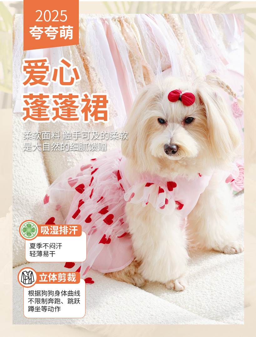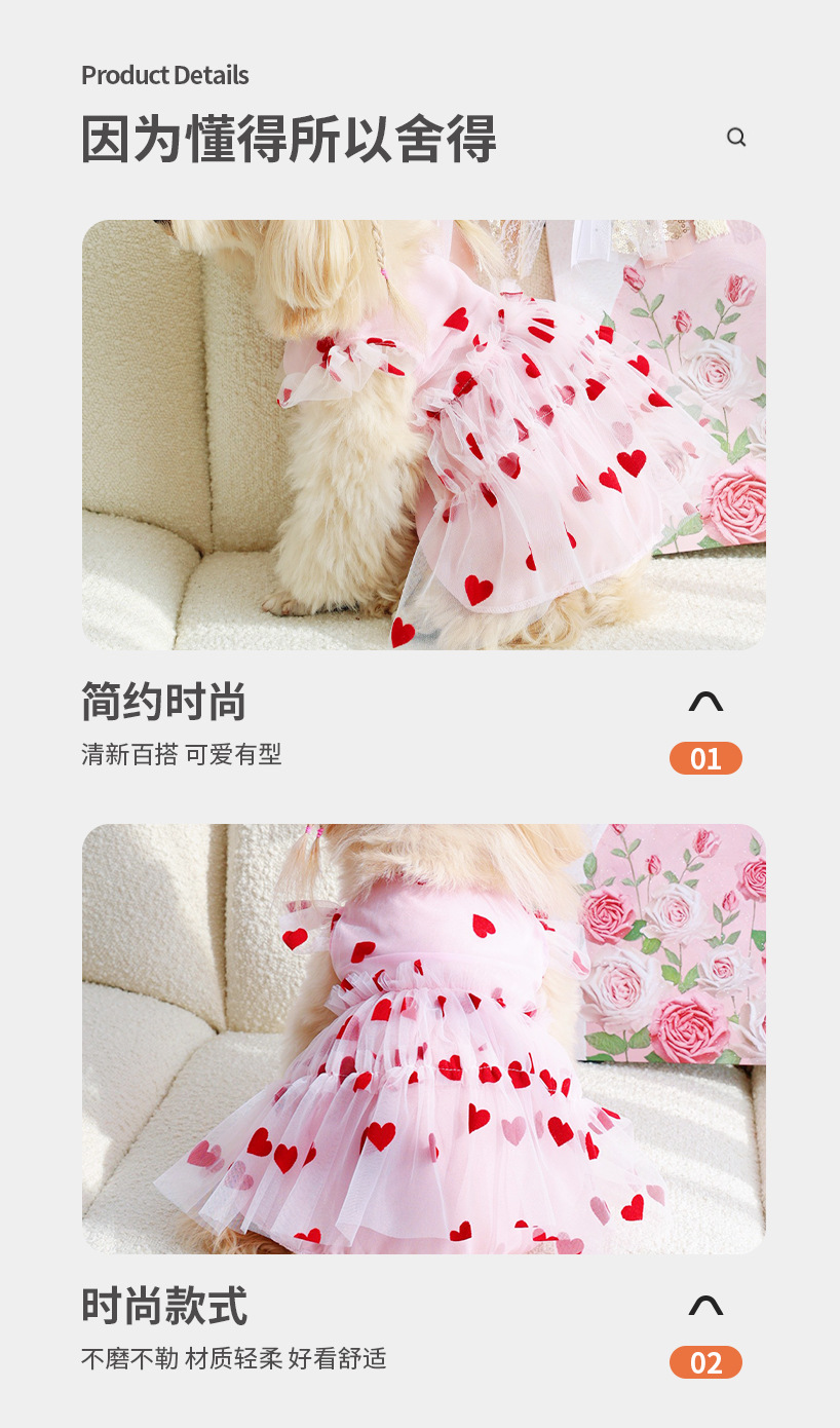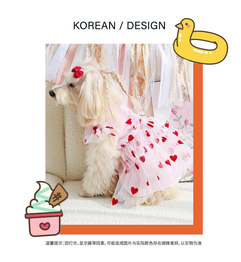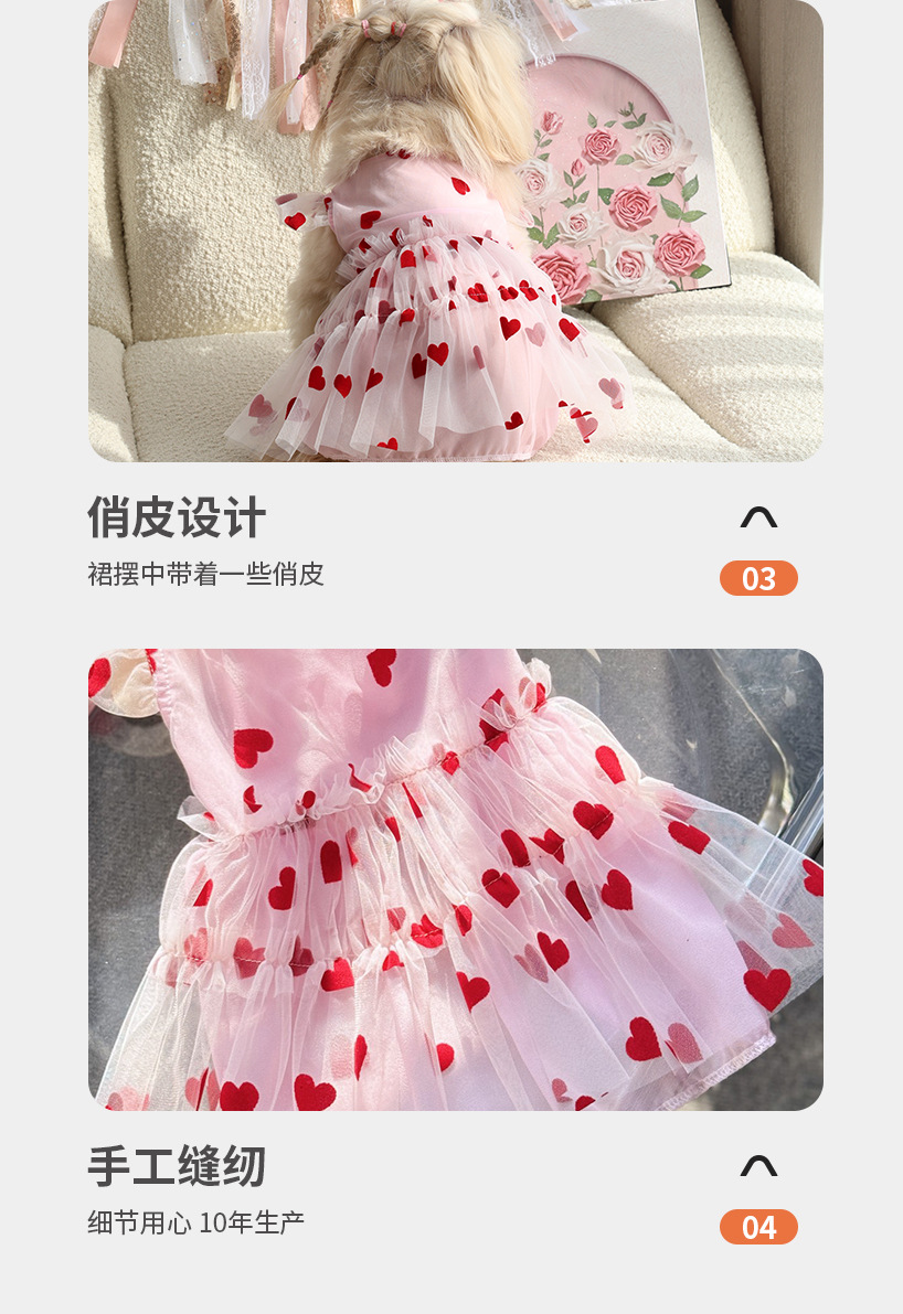 플로킹 하트 메쉬 원단 강아지 드레스, 봄, 가을 야외 착용에 적합, 고양이와 강아지 의류, 애완견 의류, 후드형스토어 가기