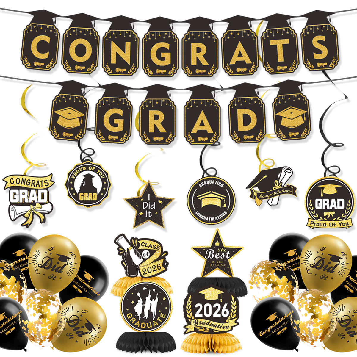 品名:毕业黑金拉旗螺旋气球蜂窝套装