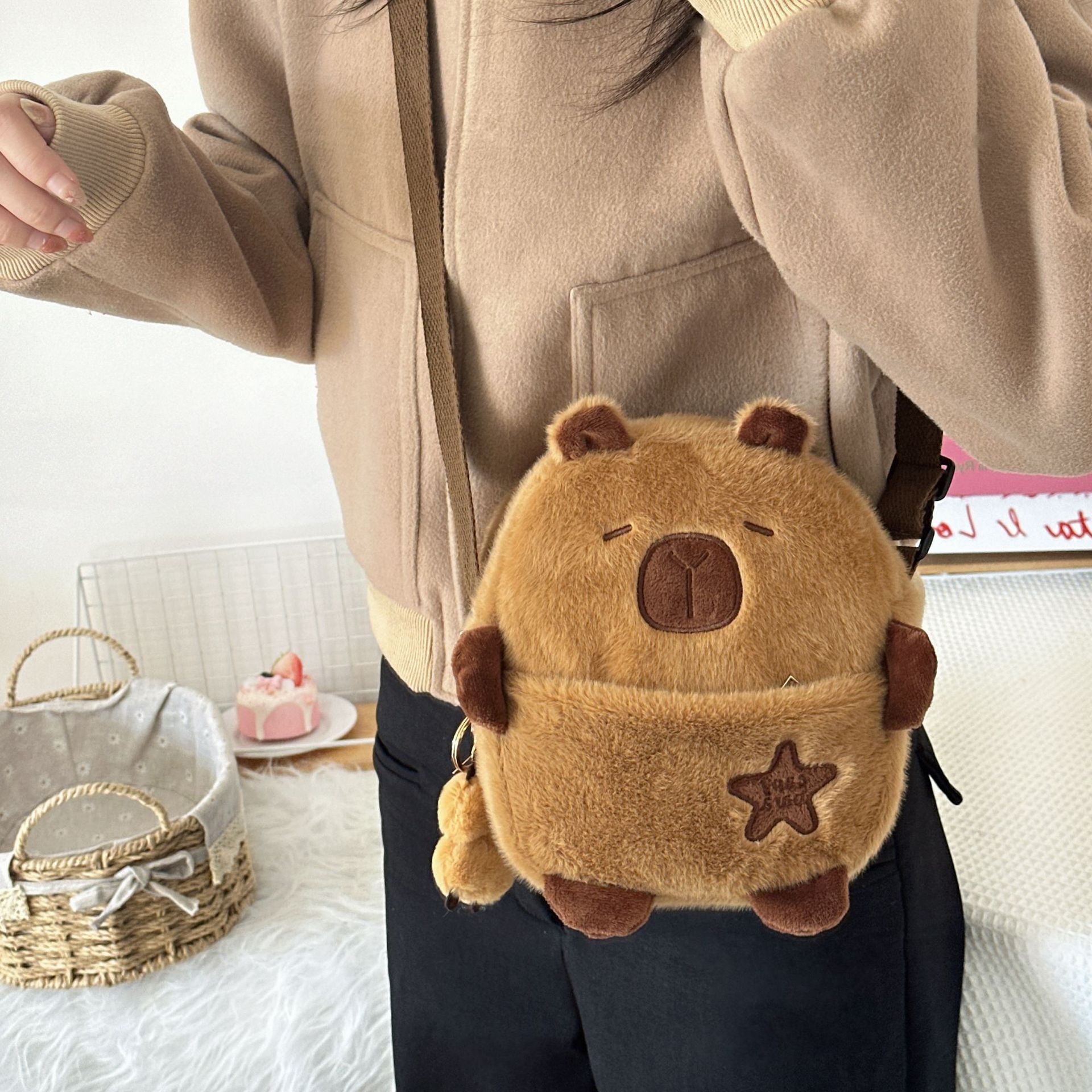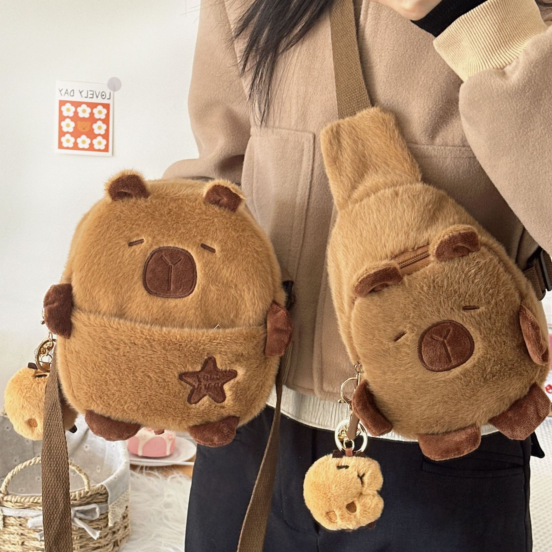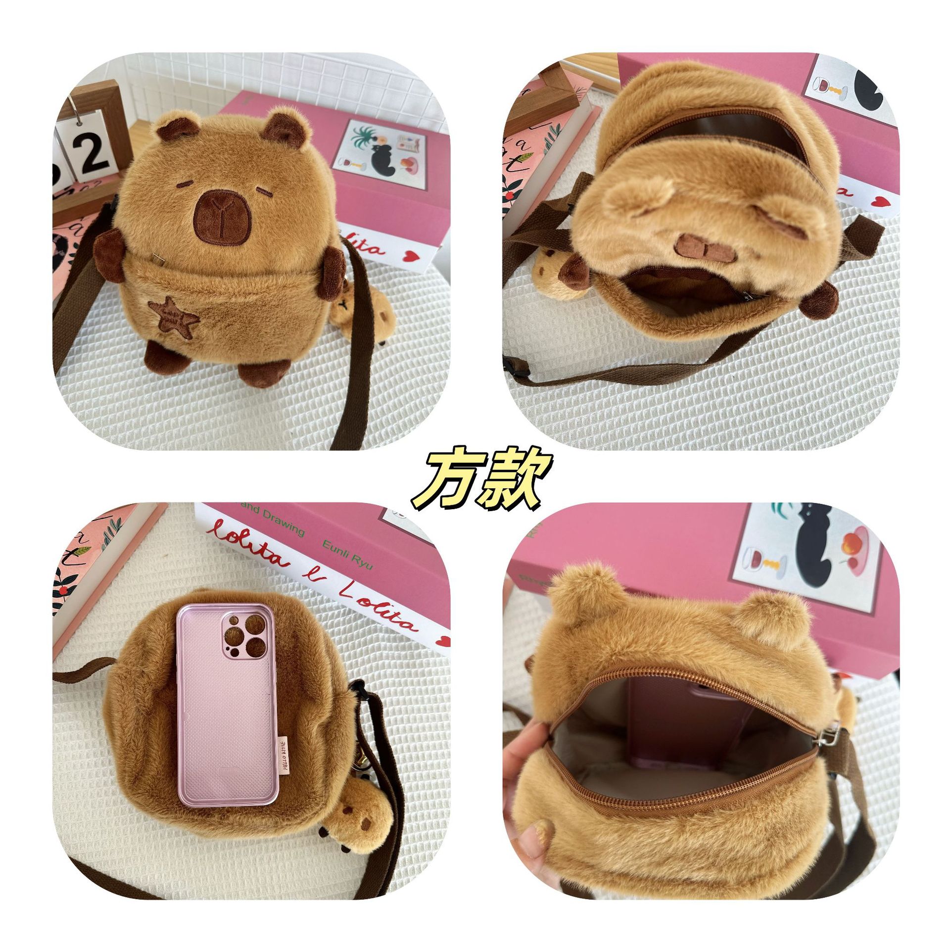 귀여운 플러시 물 기니피그 작은 어깨 가방 만화 귀여운 카피라라 보관 휴대 전화 가방 소녀 크로스 바디 작은 가슴 가방