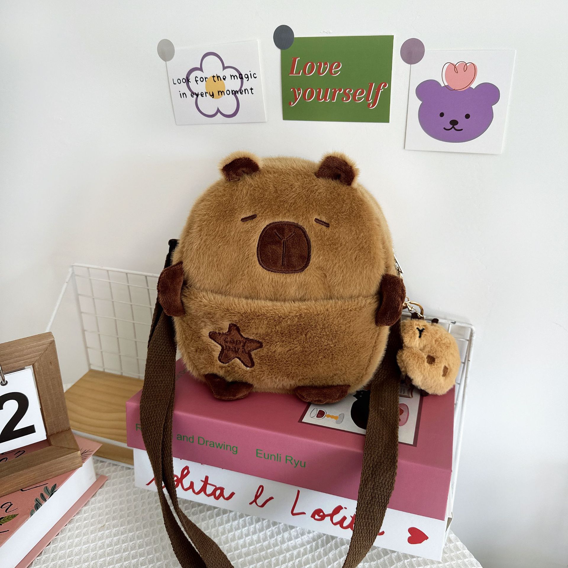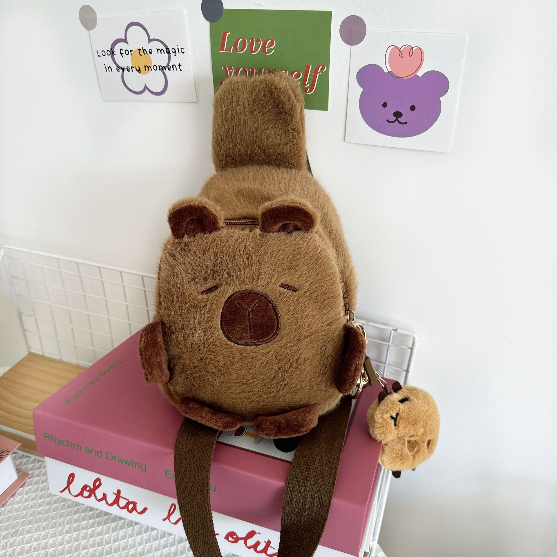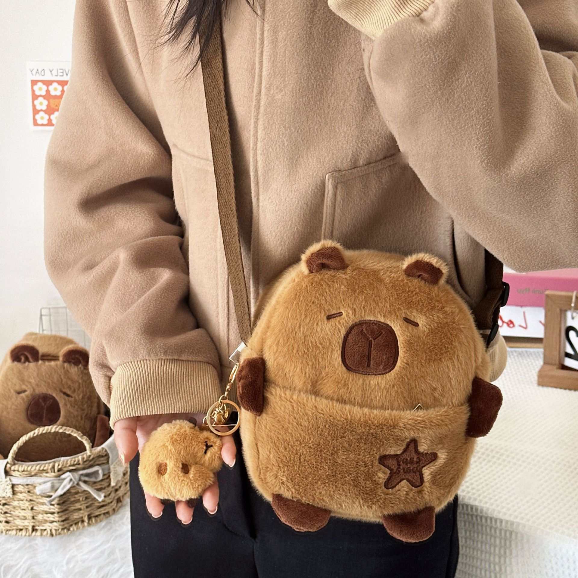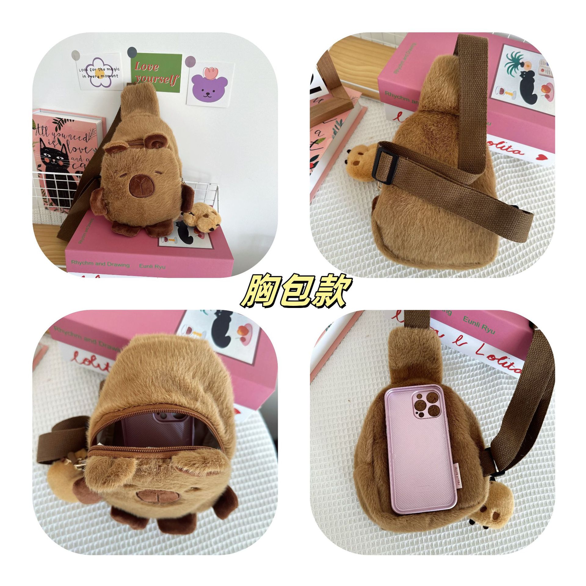 귀여운 플러시 물 기니피그 작은 어깨 가방 만화 귀여운 카피라라 보관 휴대 전화 가방 소녀 크로스 바디 작은 가슴 가방