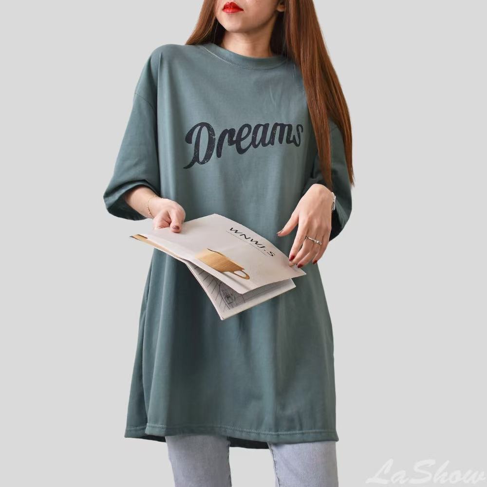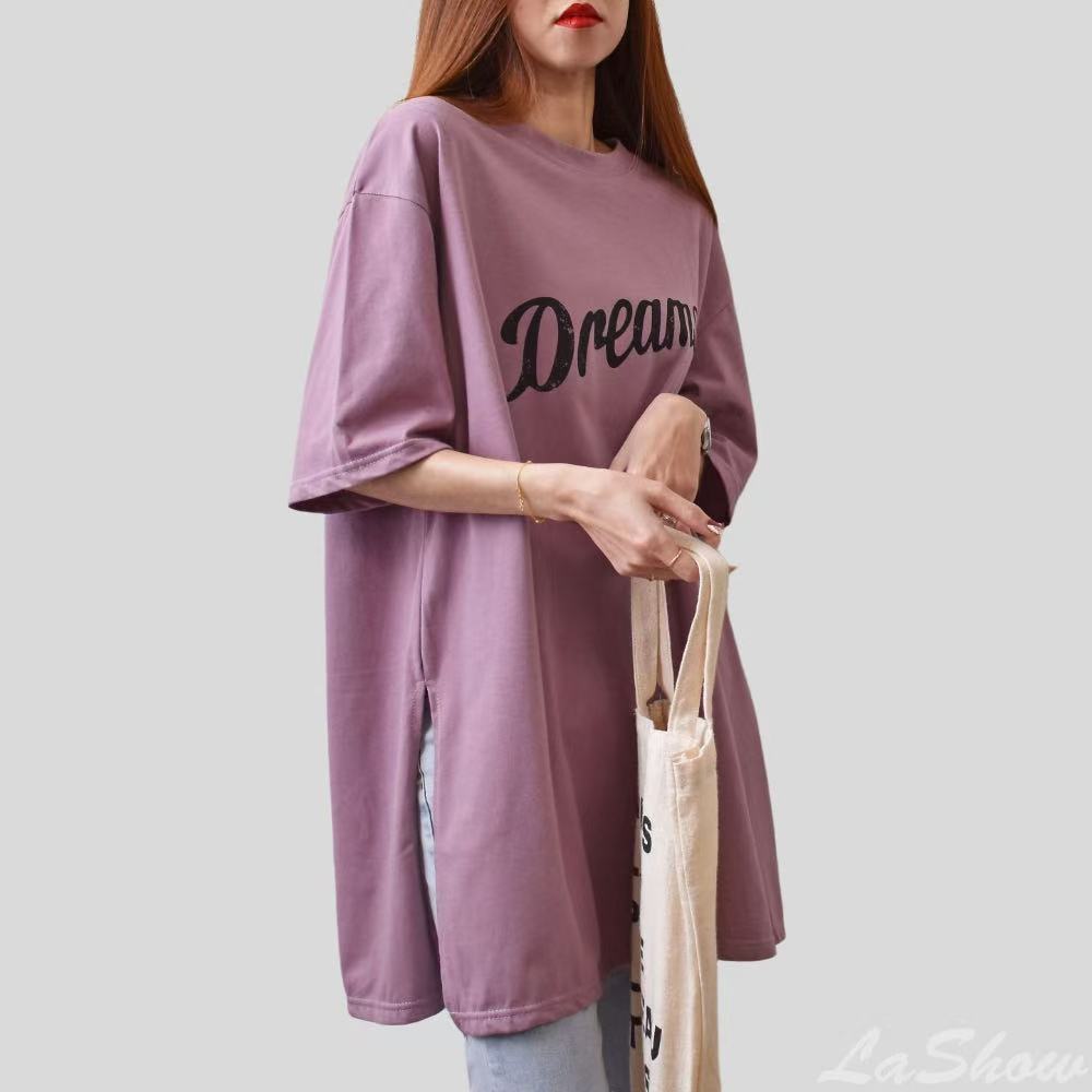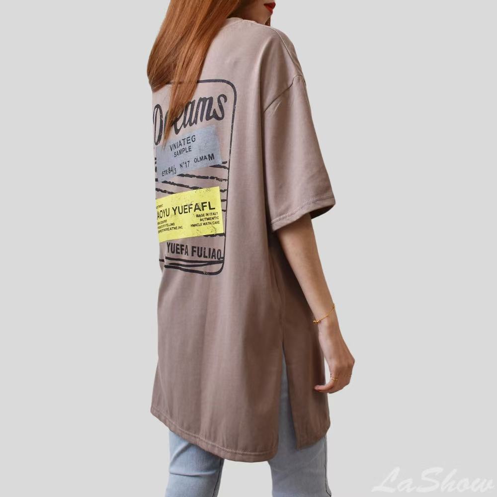 2025 여름 새로운 느슨한 플러스 사이즈 올 매치 여자 탑 인쇄 중간 길이의 유행 티셔츠 나이 감소 슬리밍