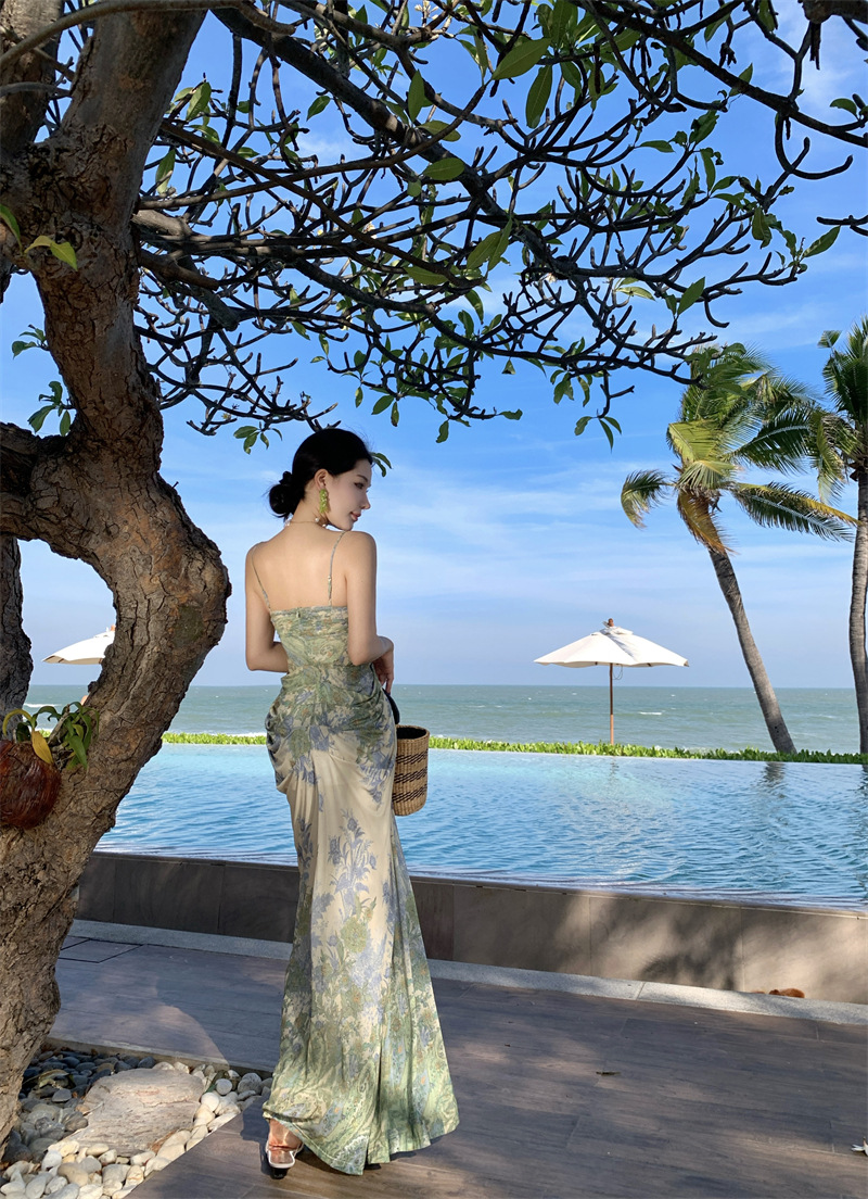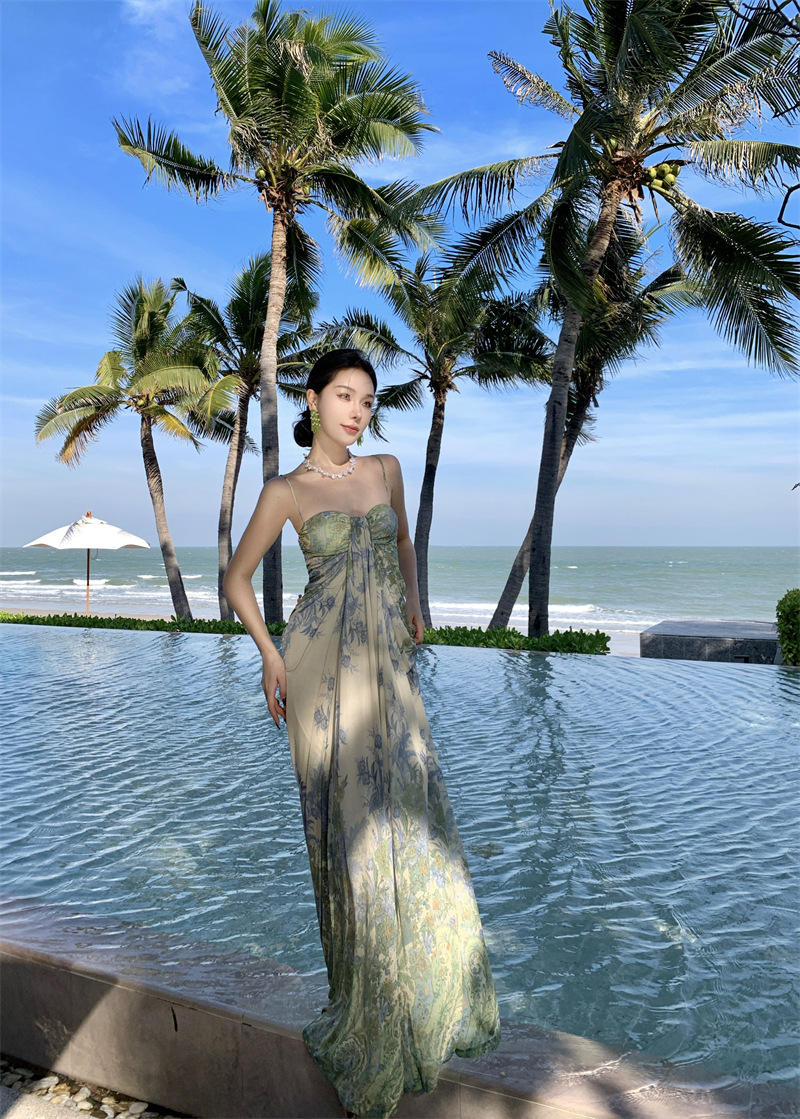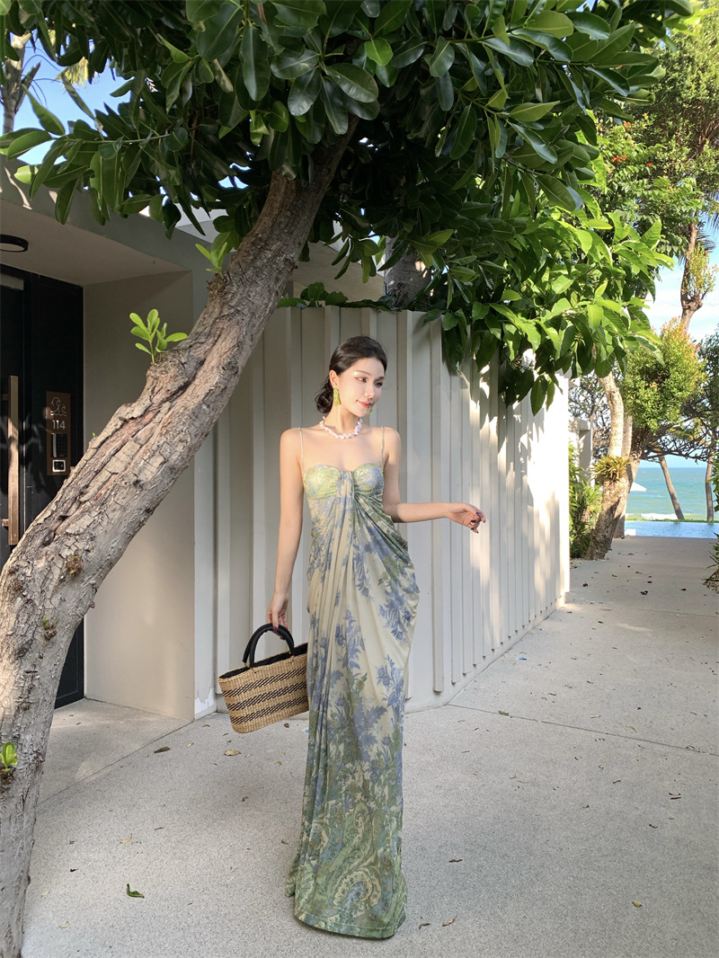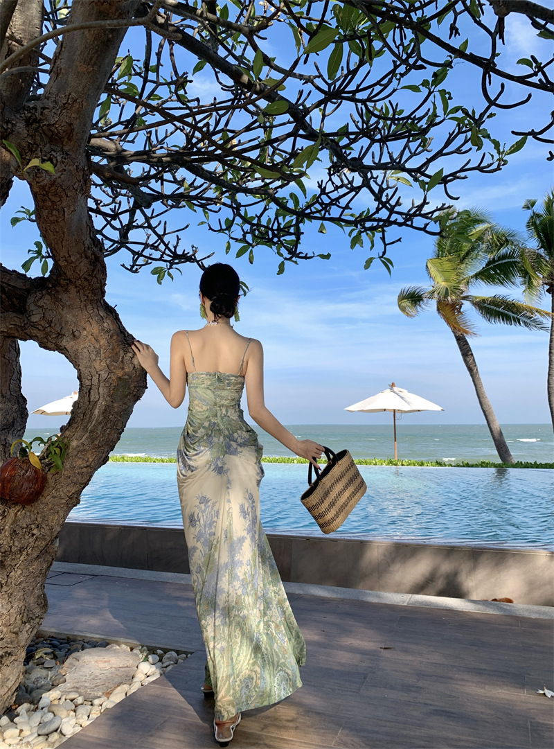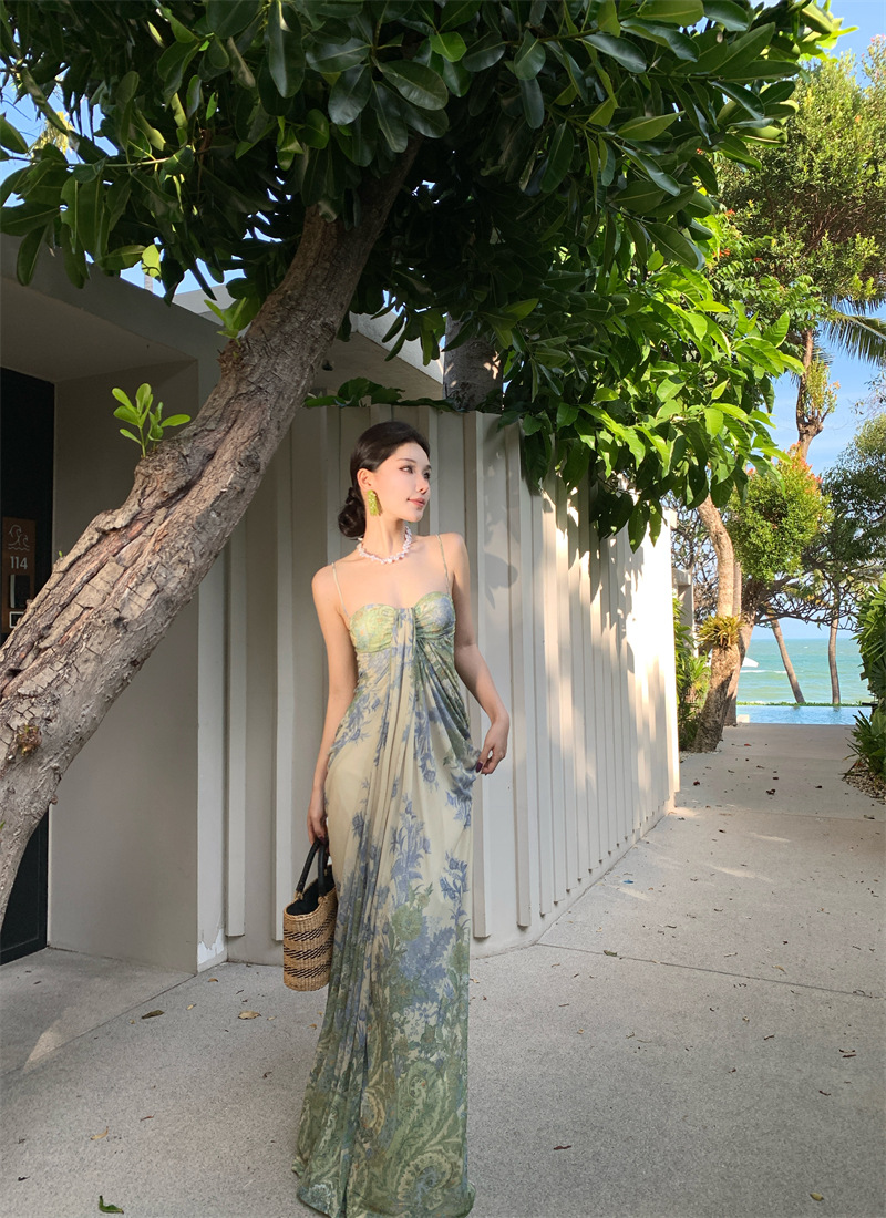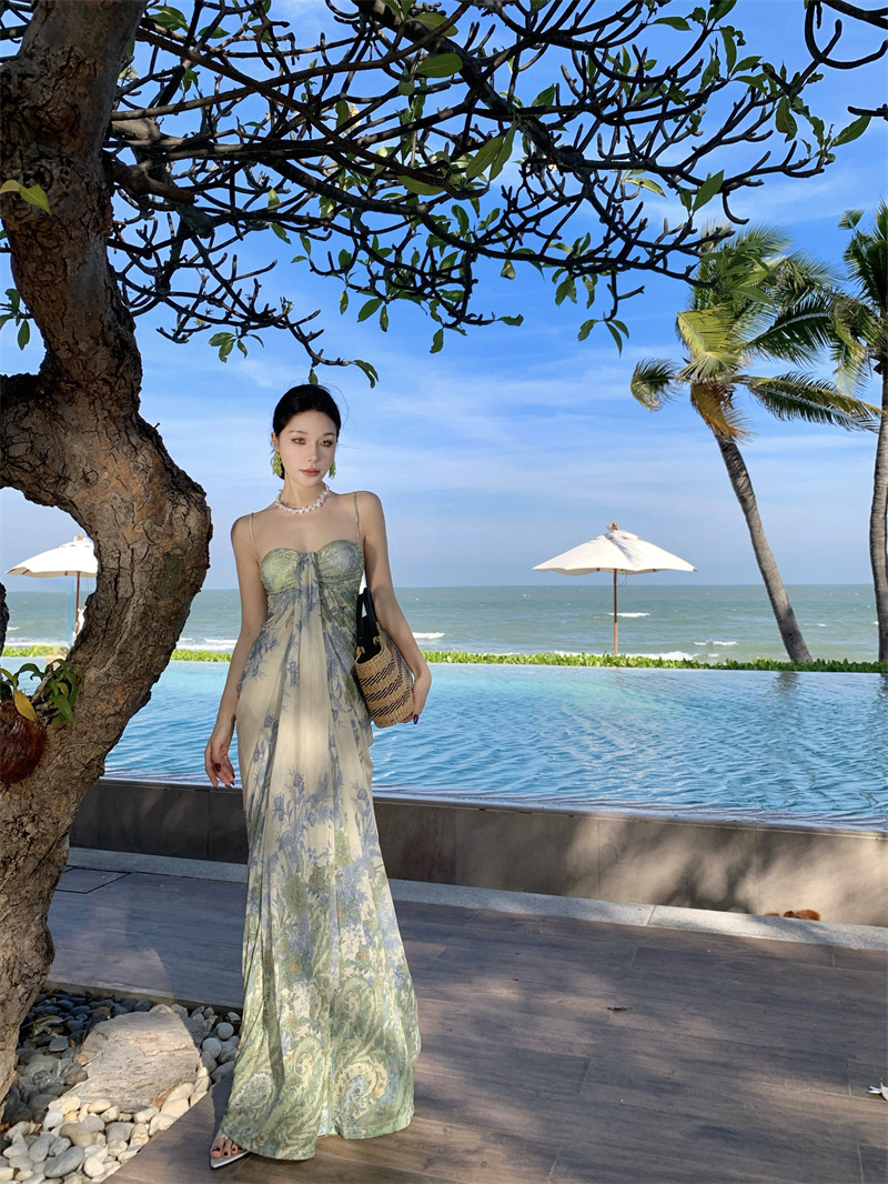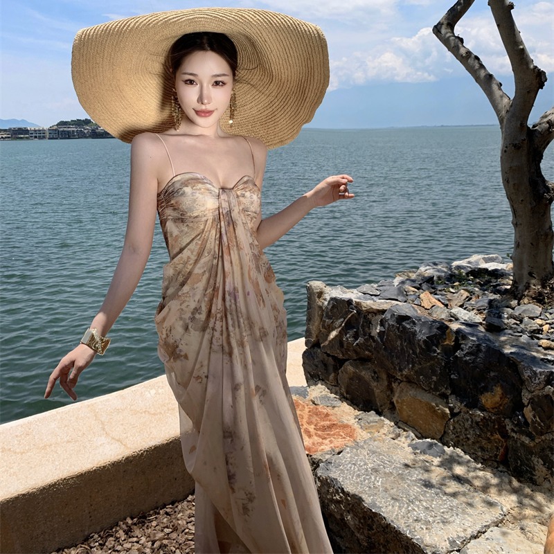 프랑스 스타일 아름다운 끈이없는 슬링 원피스 여름 요정 메쉬 인쇄 우아한 스키니 긴 해변 휴일 원피스