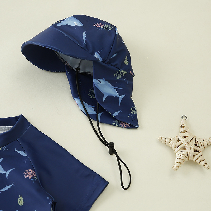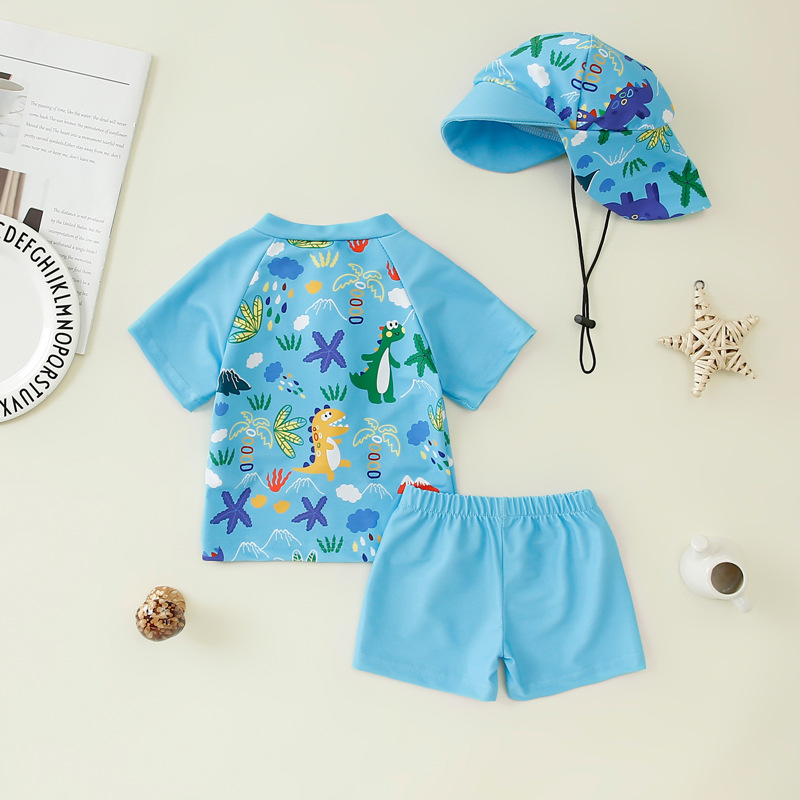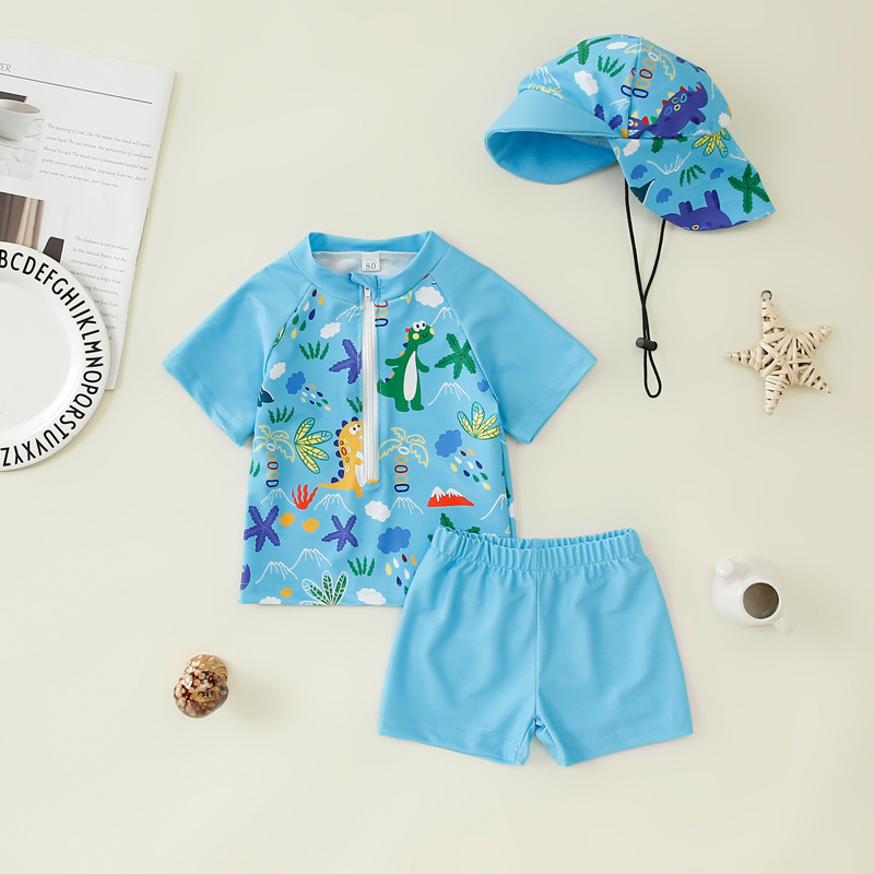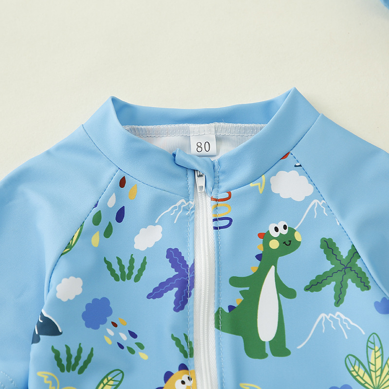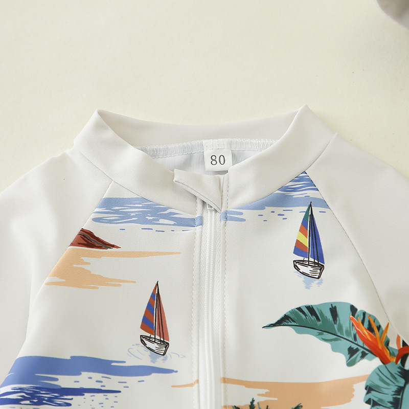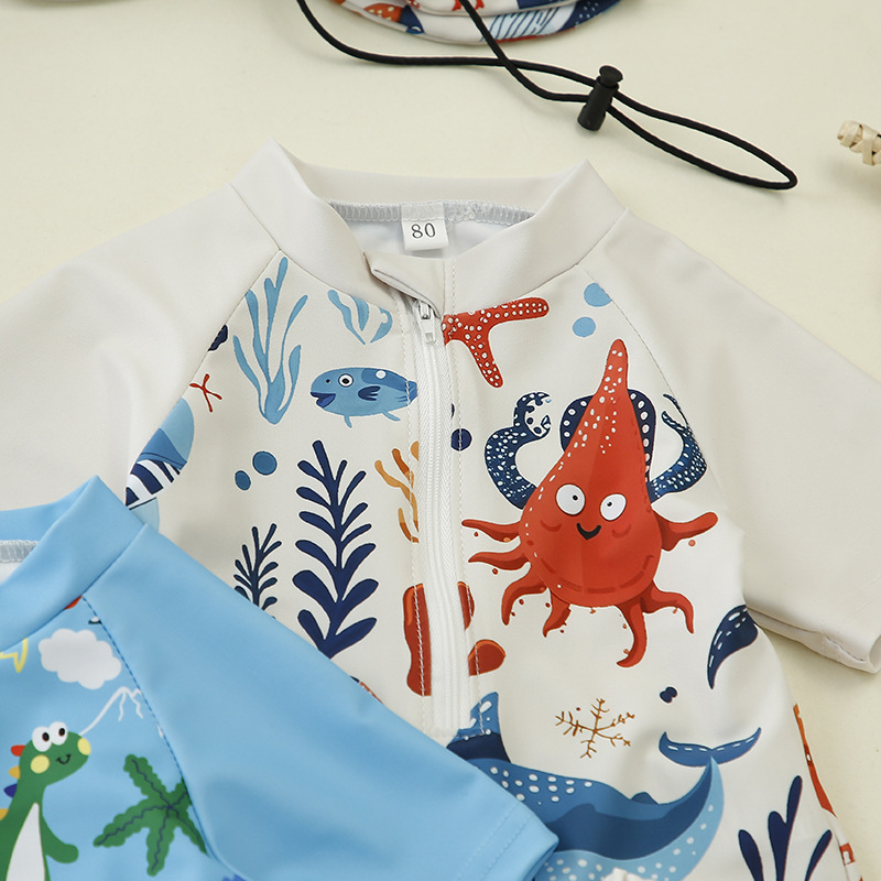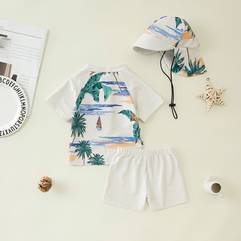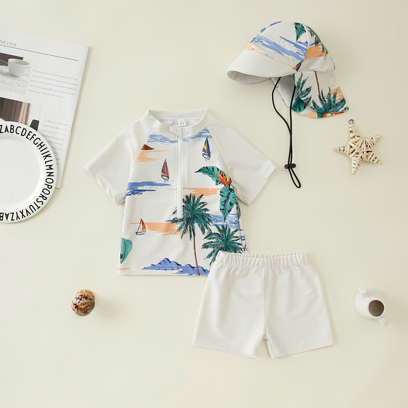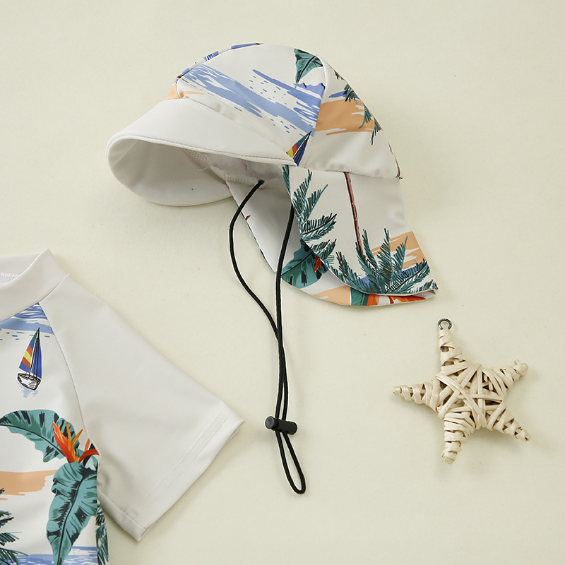 국경 간 아동복 소년의 풀 프린트 원피스 수영복 소년 아기의 반 오픈 원피스 수영복 어린이 수영복 모자