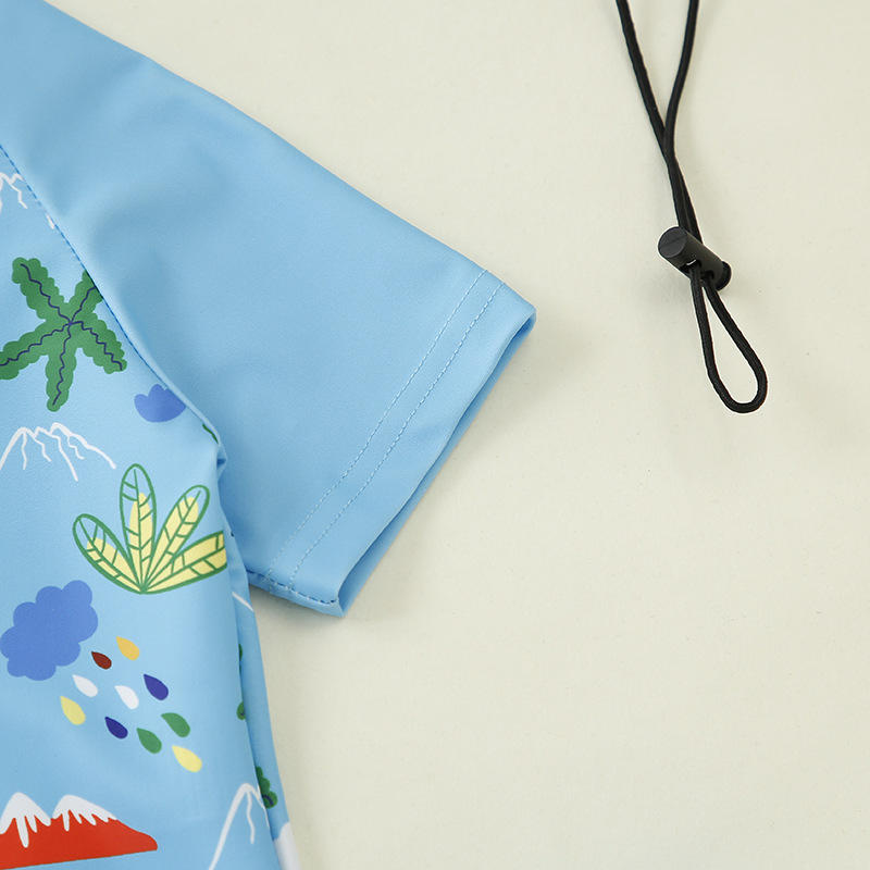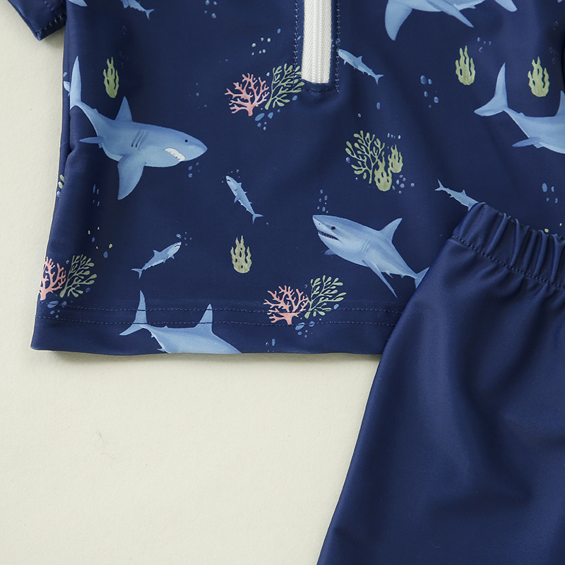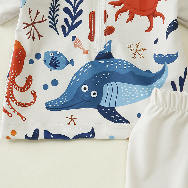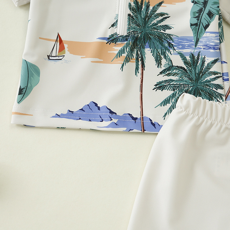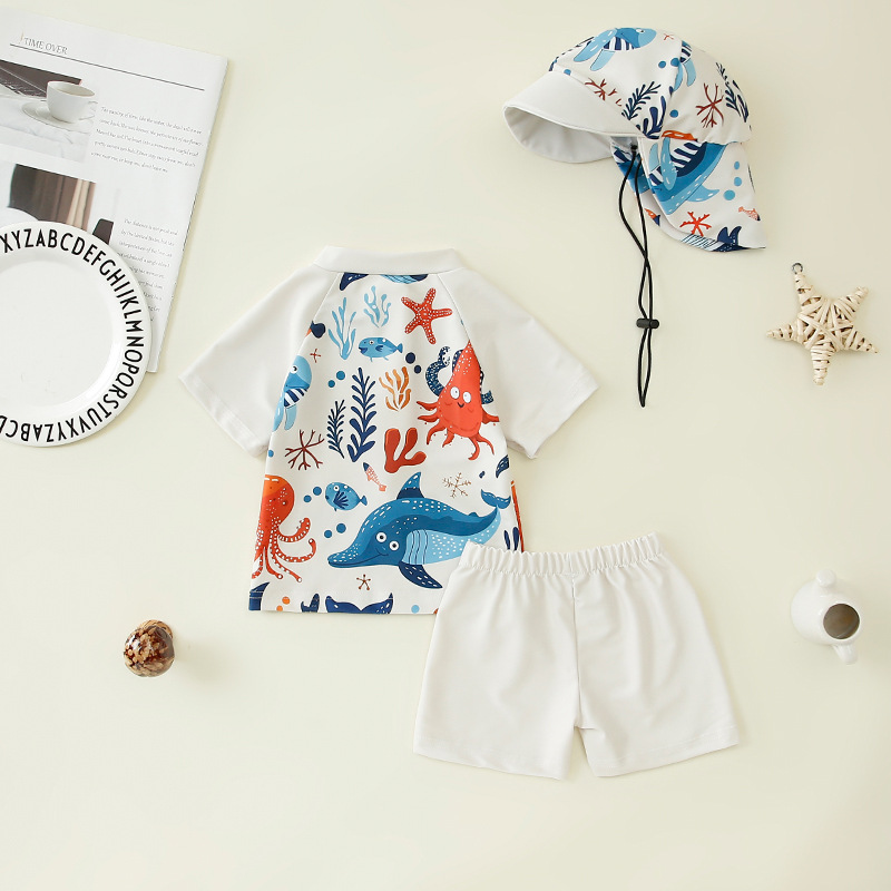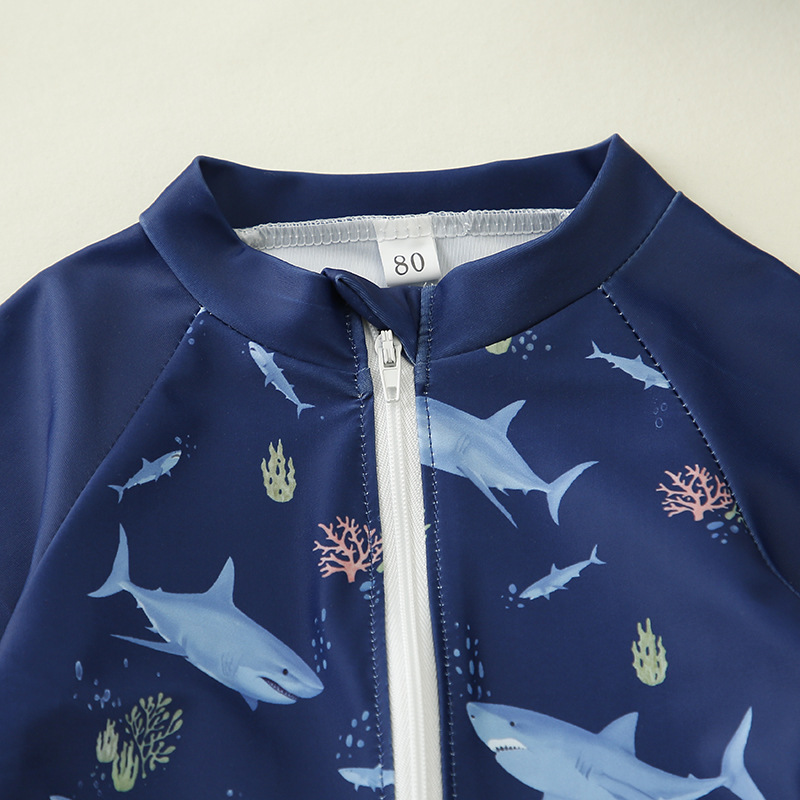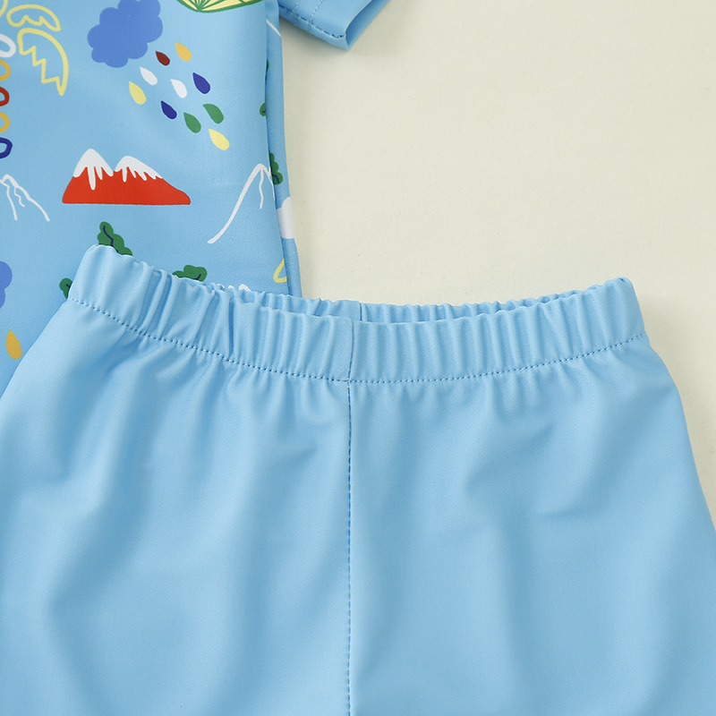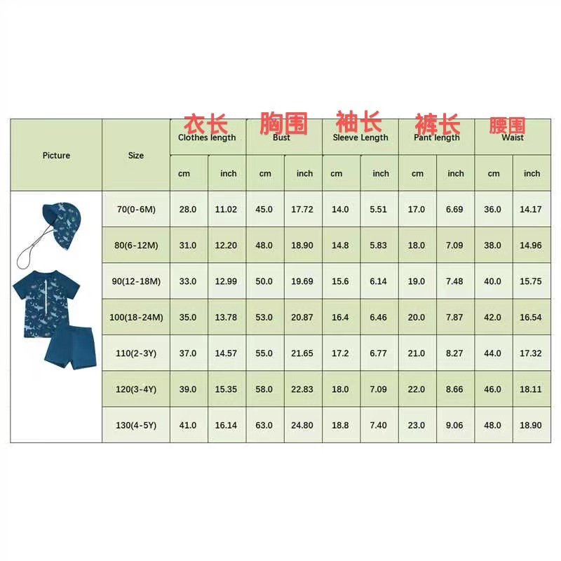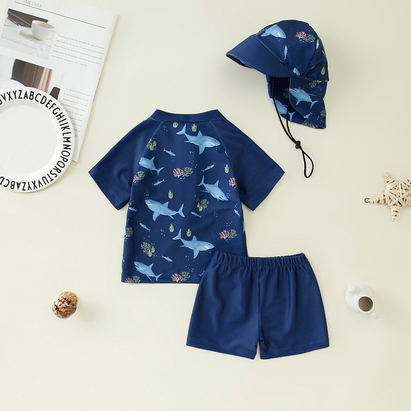 국경 간 아동복 소년의 풀 프린트 원피스 수영복 소년 아기의 반 오픈 원피스 수영복 어린이 수영복 모자