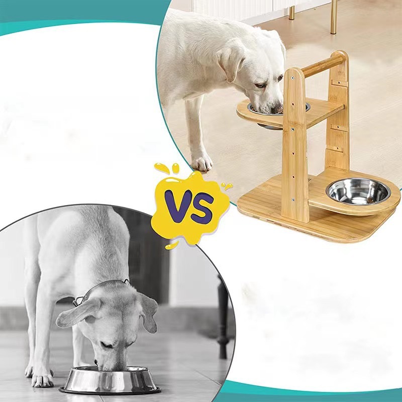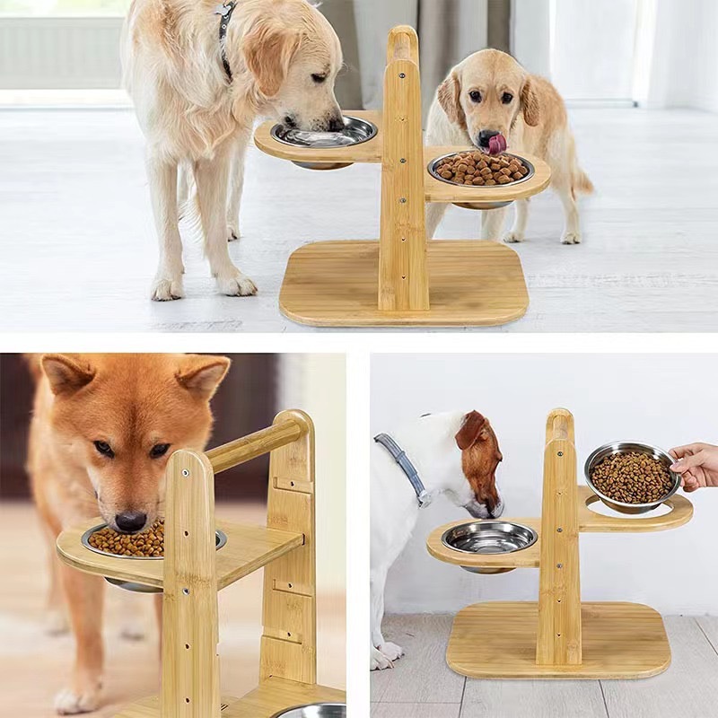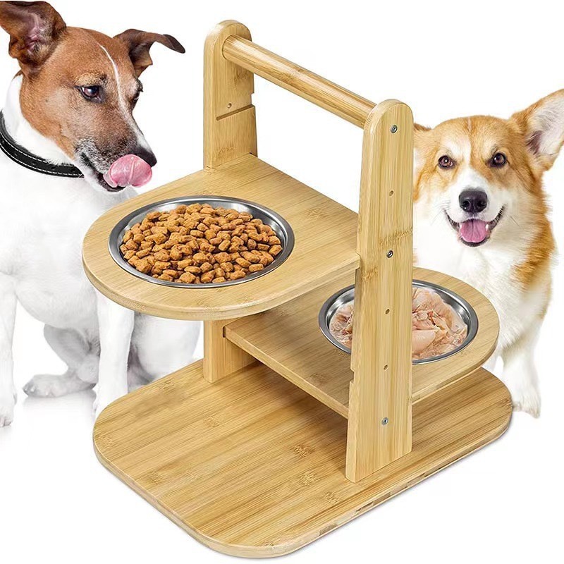 나무 조절 가능한 애완 동물 그릇 랙 더블 레이어 개 피더 휴대용 고양이 그릇 랙 개 그릇 홀더 개 식품 기구스토어 가기