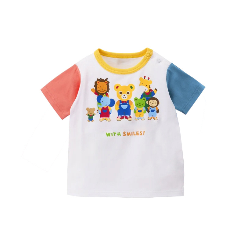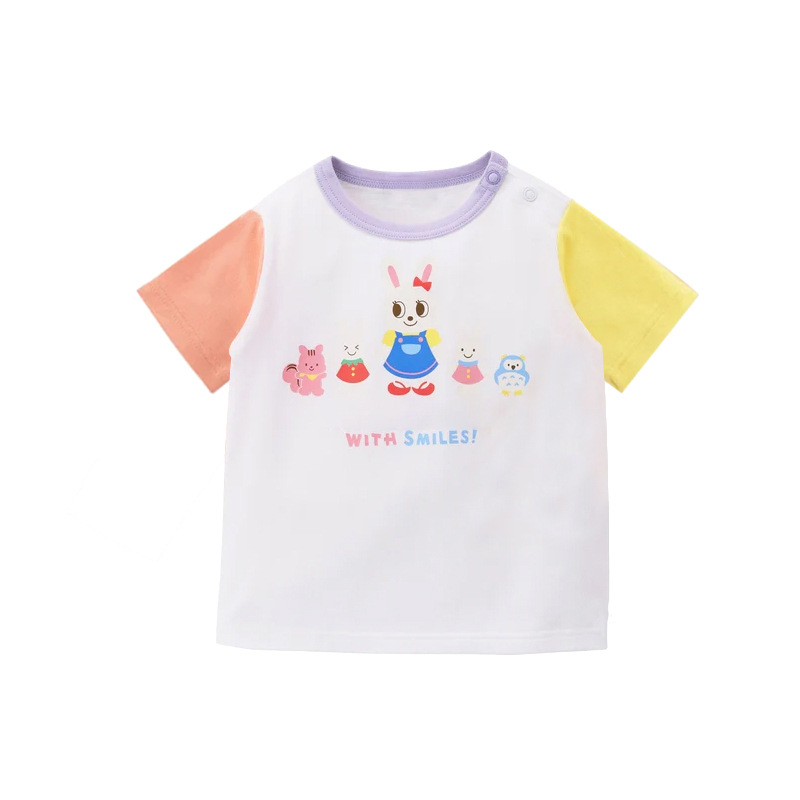 可可爱爱的熊兔好朋友印花拼色袖T恤