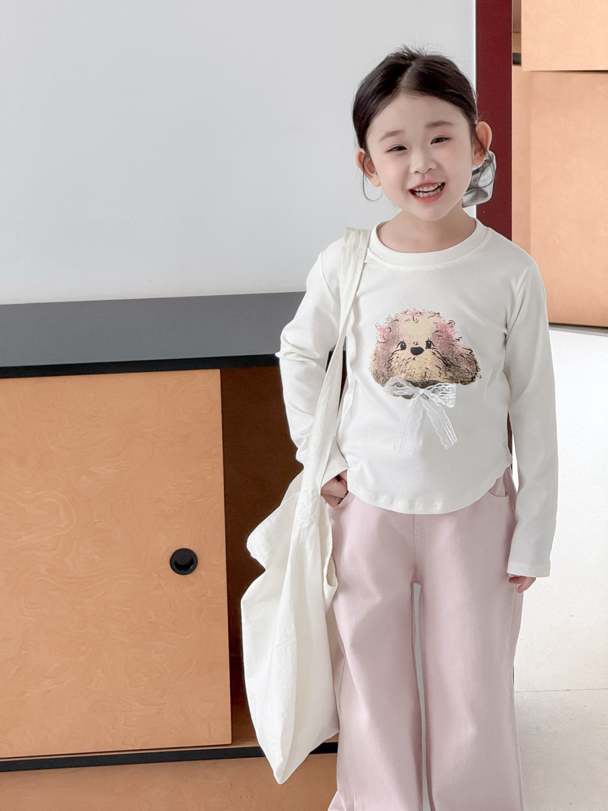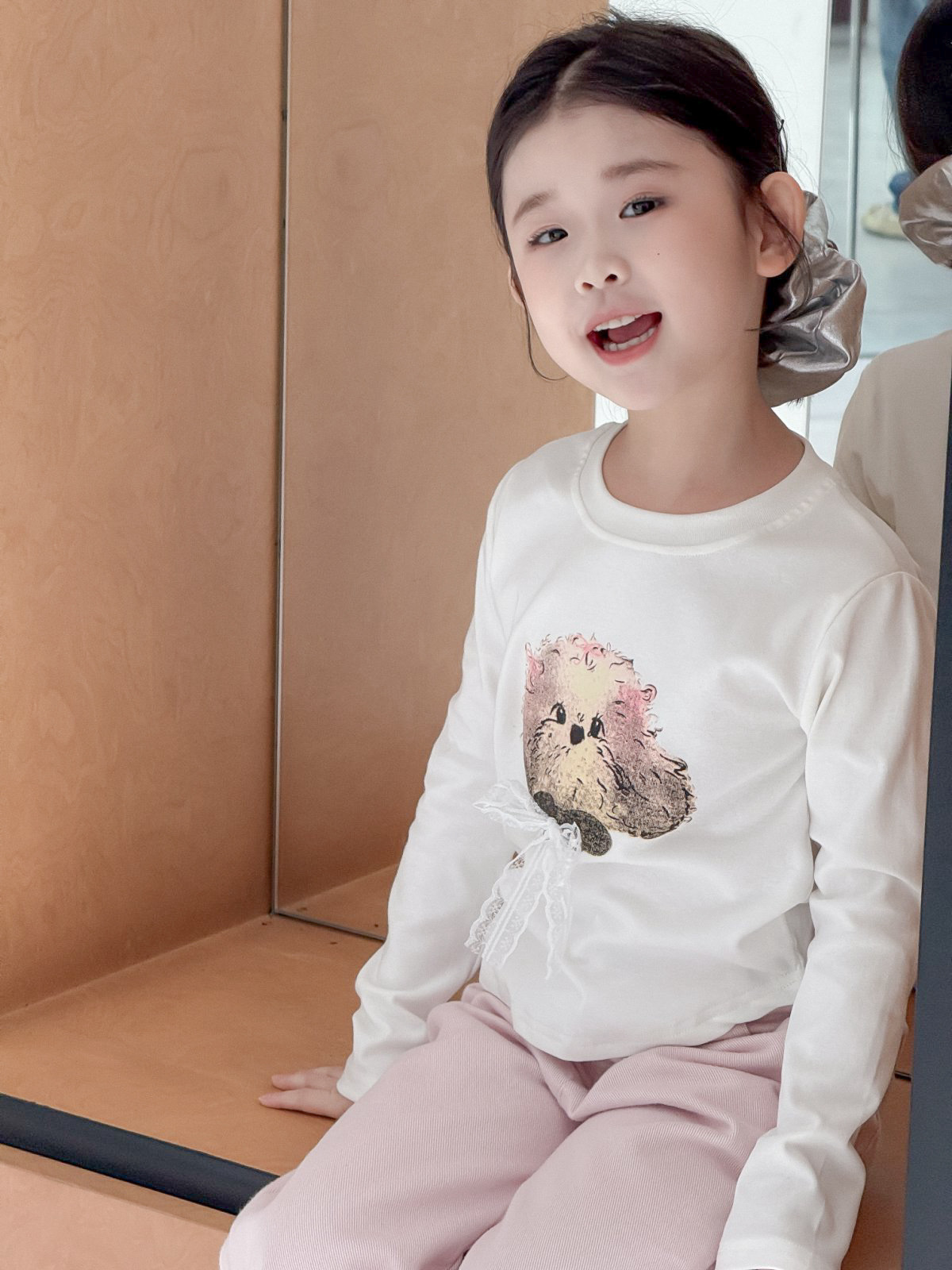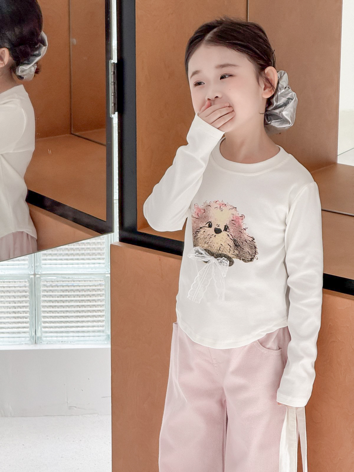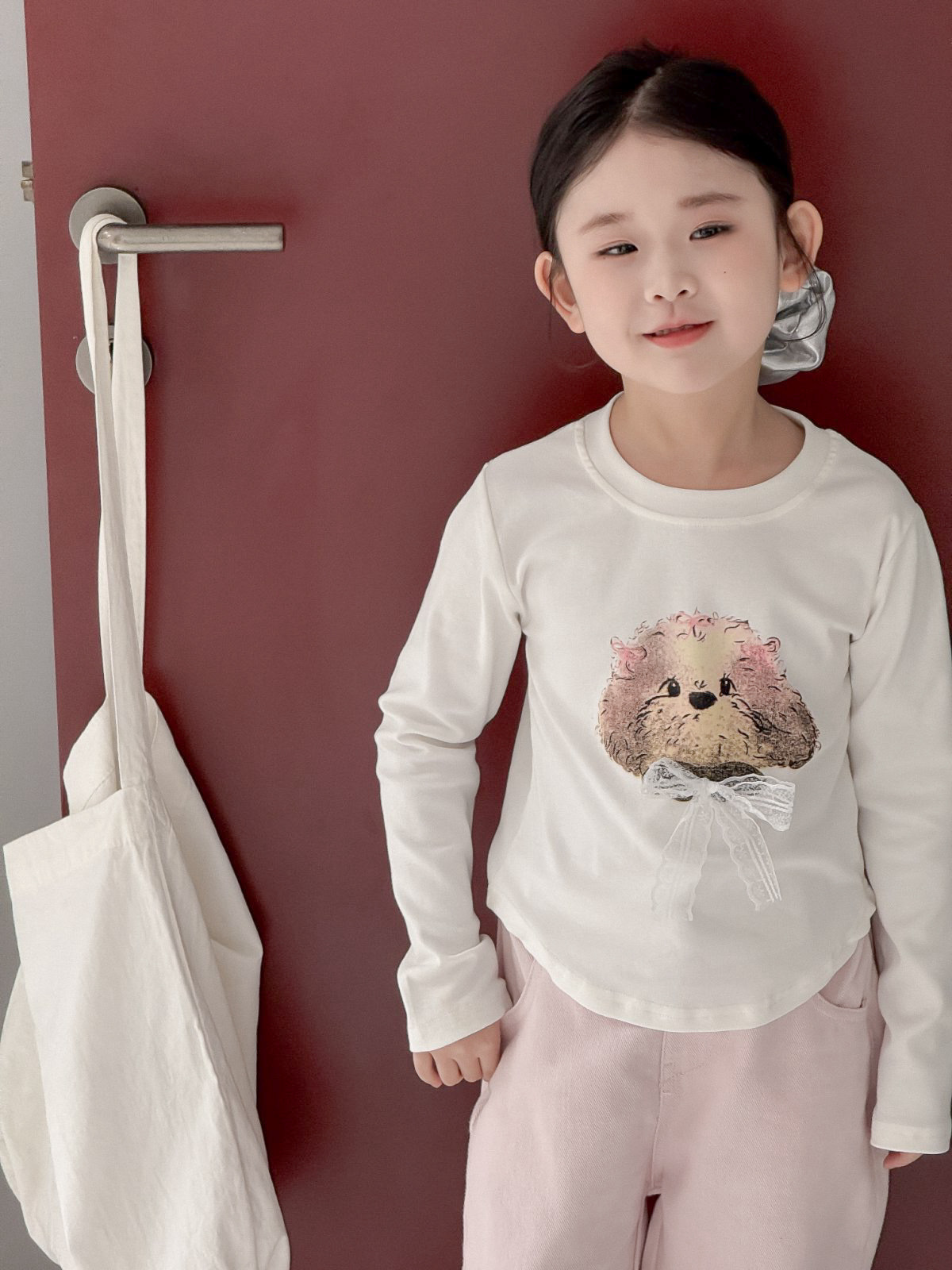 아동 의류 소녀 봄 의류 2025 새로운상의 요크셔 강아지 프린트 보우 긴팔 아동 티셔츠 유행스토어 가기