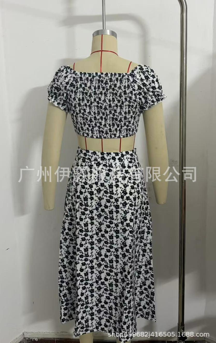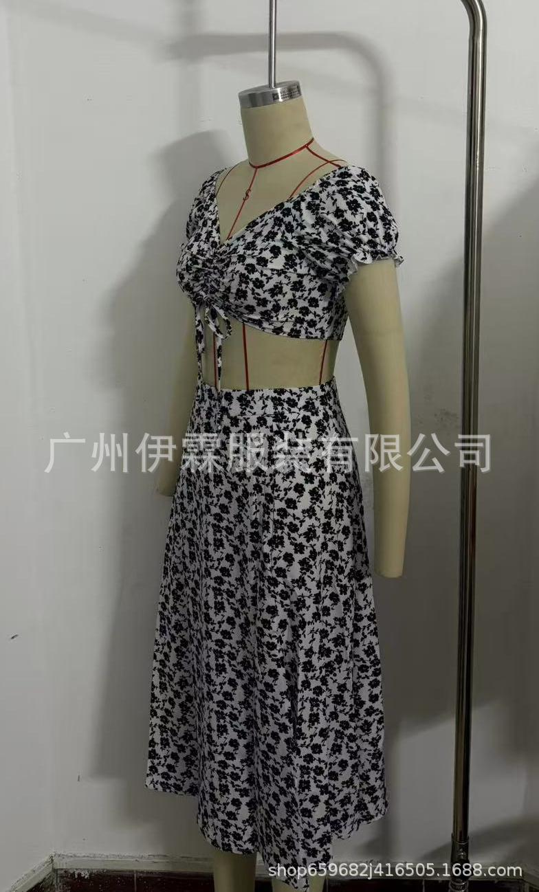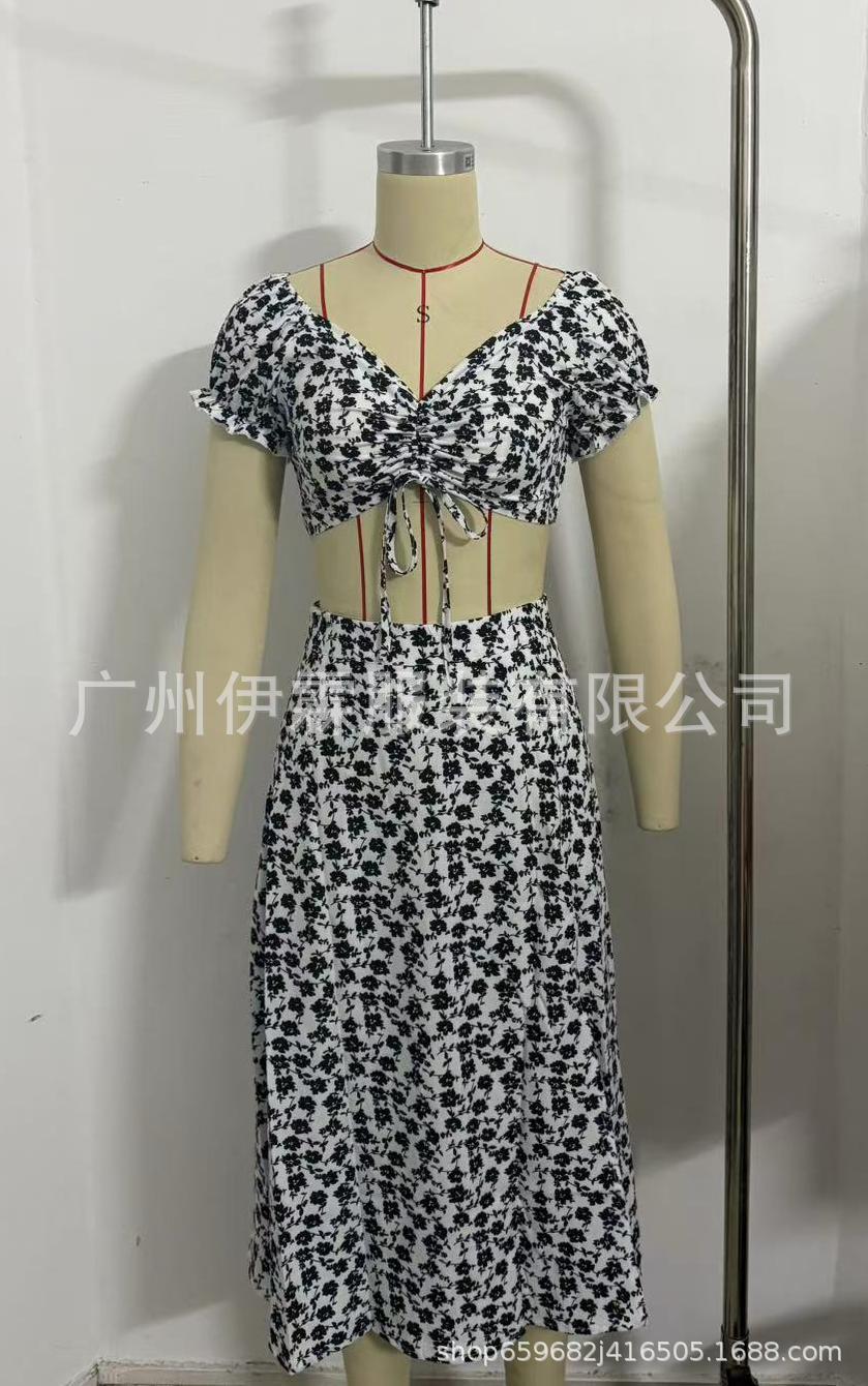2025 국경 새로운 V 넥 우아한 꽃 프랑스 레트로 퍼프 슬리브 레이스 업 탑 스커트 세트 여성