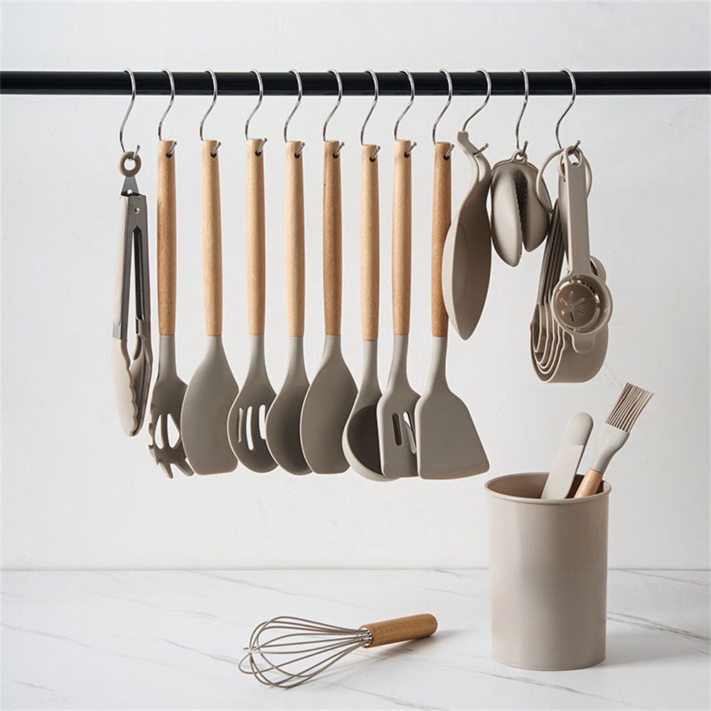 유백색 나무 손잡이가 있는 실리콘 주방용품 보관통, 28종 세트, 요리용 주걱 및 스푼, 주방 도구 세트, 붙지 않는 팬