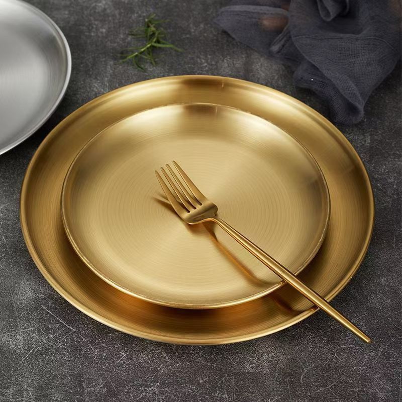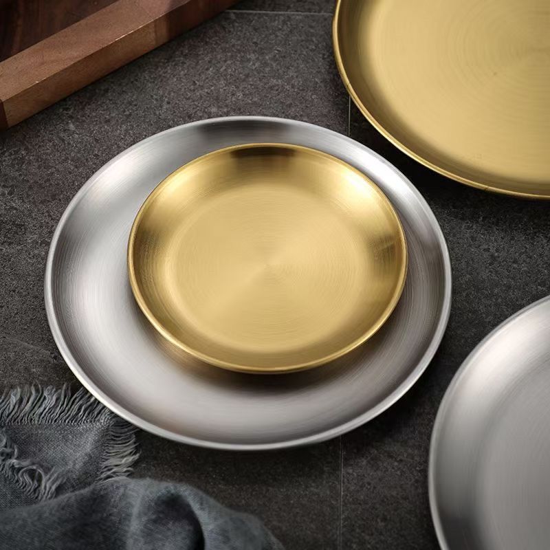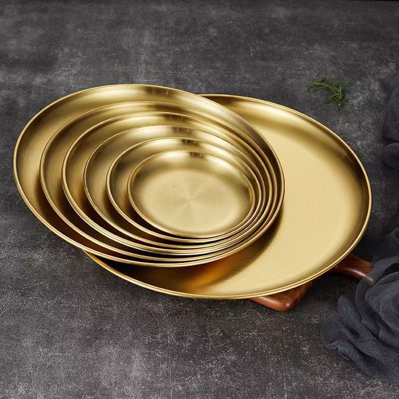 과일 접시 케이크 접시 한국 스테인레스 스틸 골드 원형 접시 상업용 뼈 접시 바베큐 접시 얕은 접시 두꺼운 트레이스토어 가기
