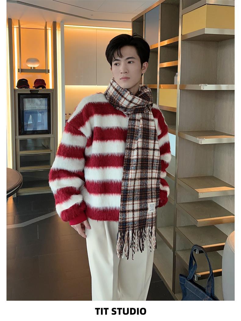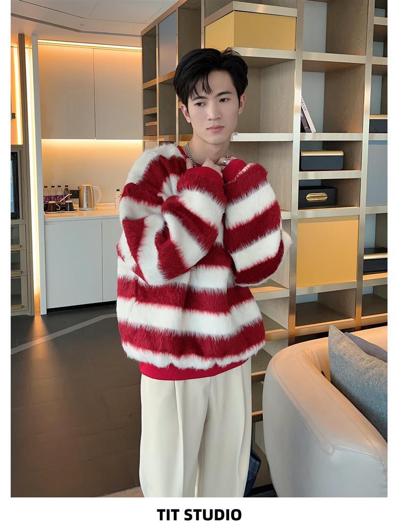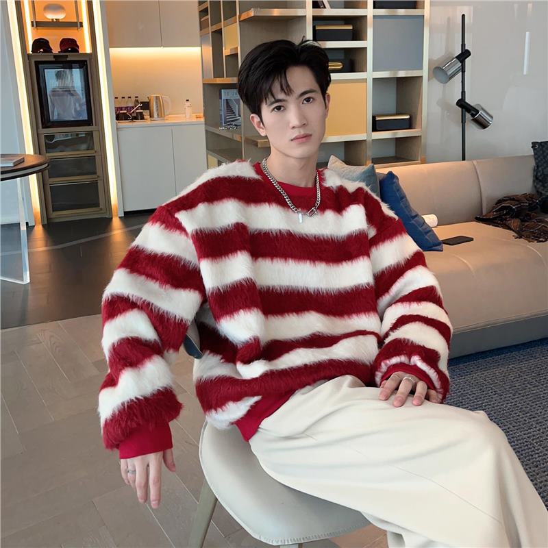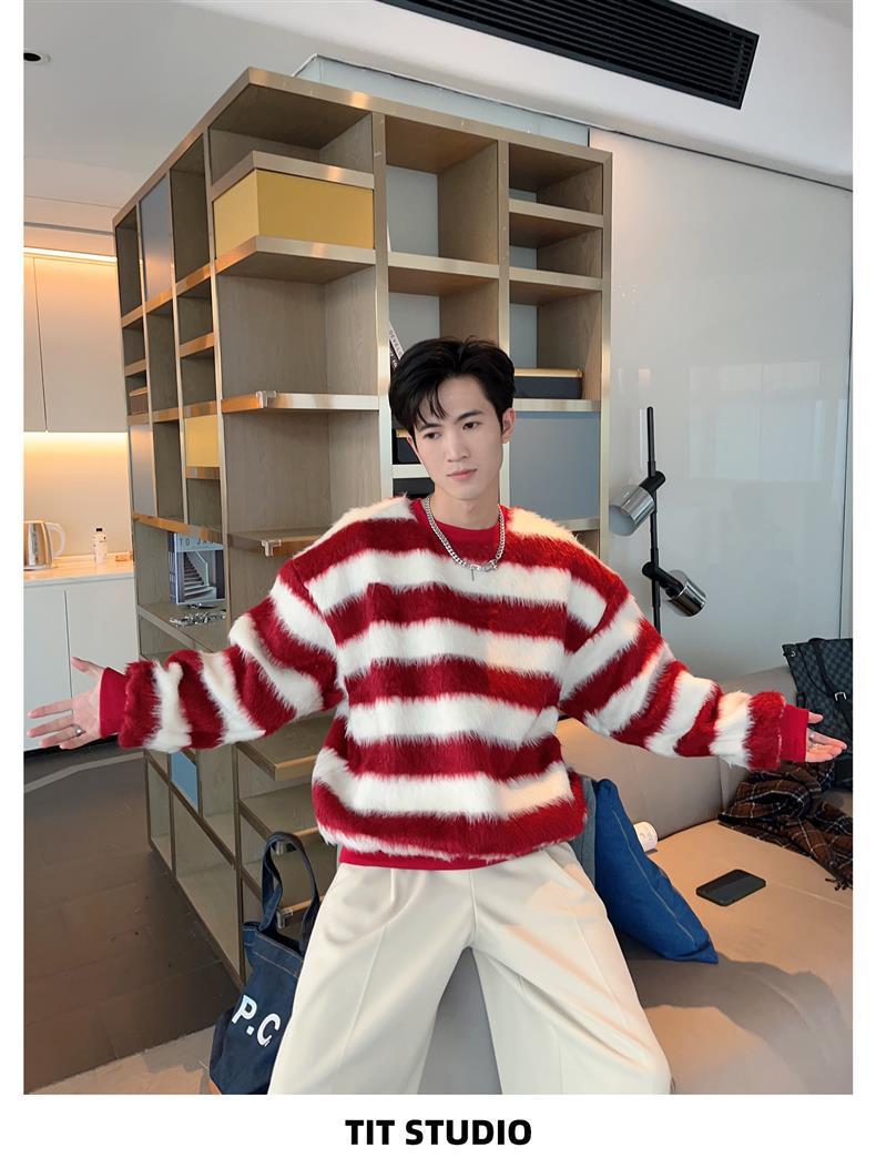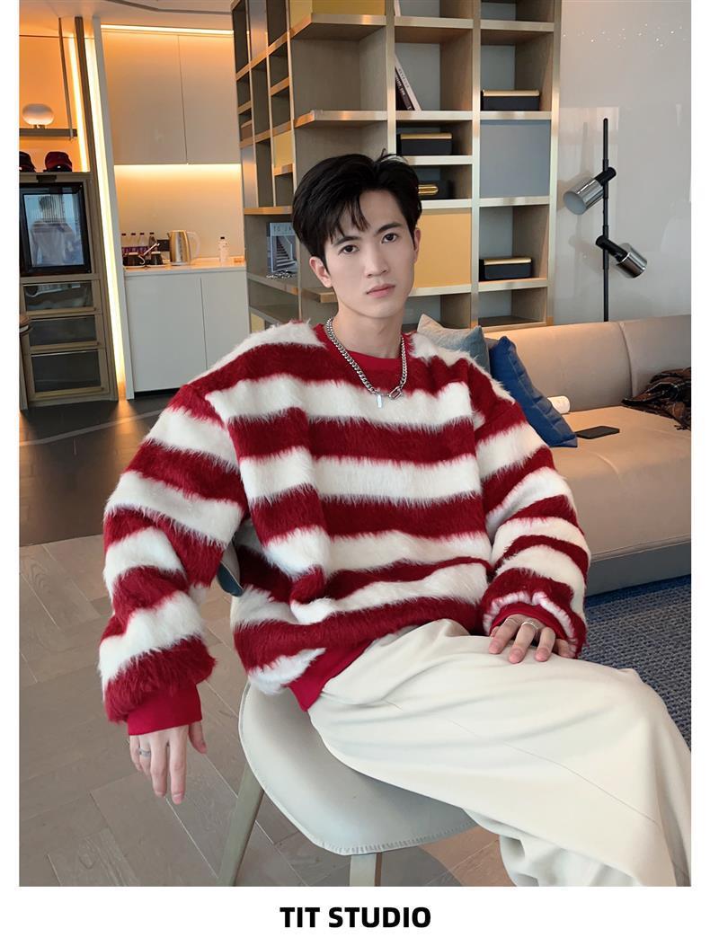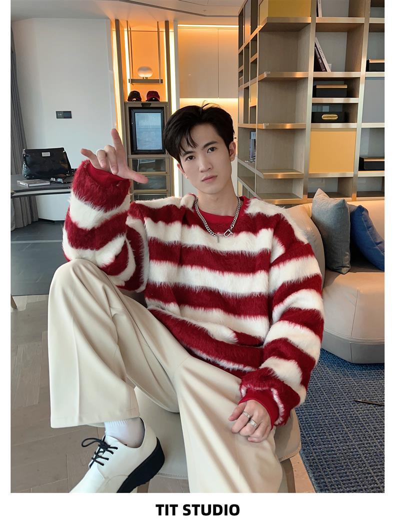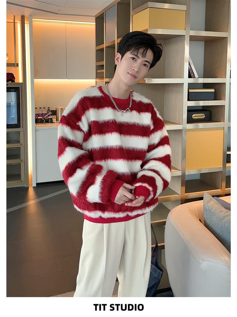 겨울 두꺼운 코튼 모헤어 스트라이프 새해 복 레드 스웨터 남자 한국식 커플 크루 넥 스웨터 탑