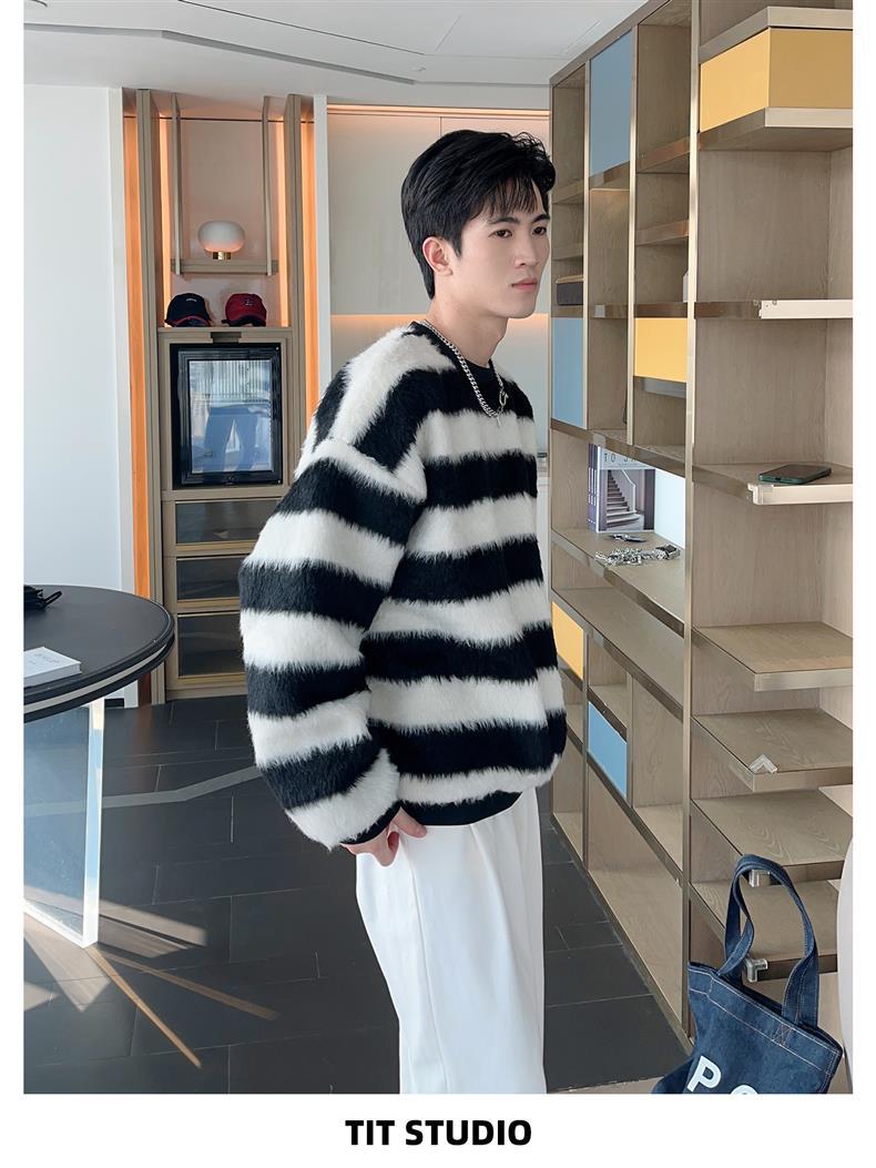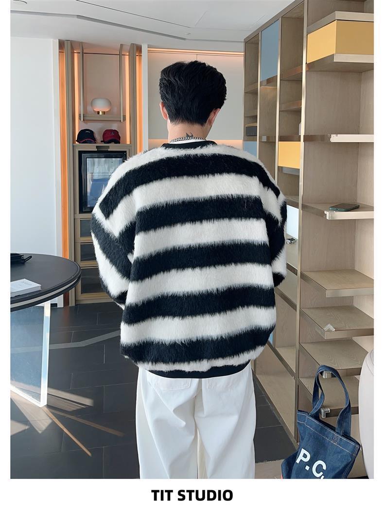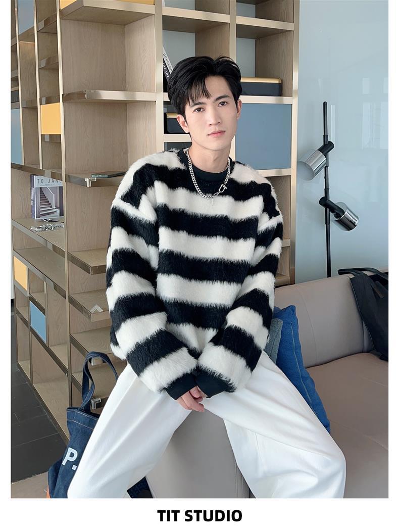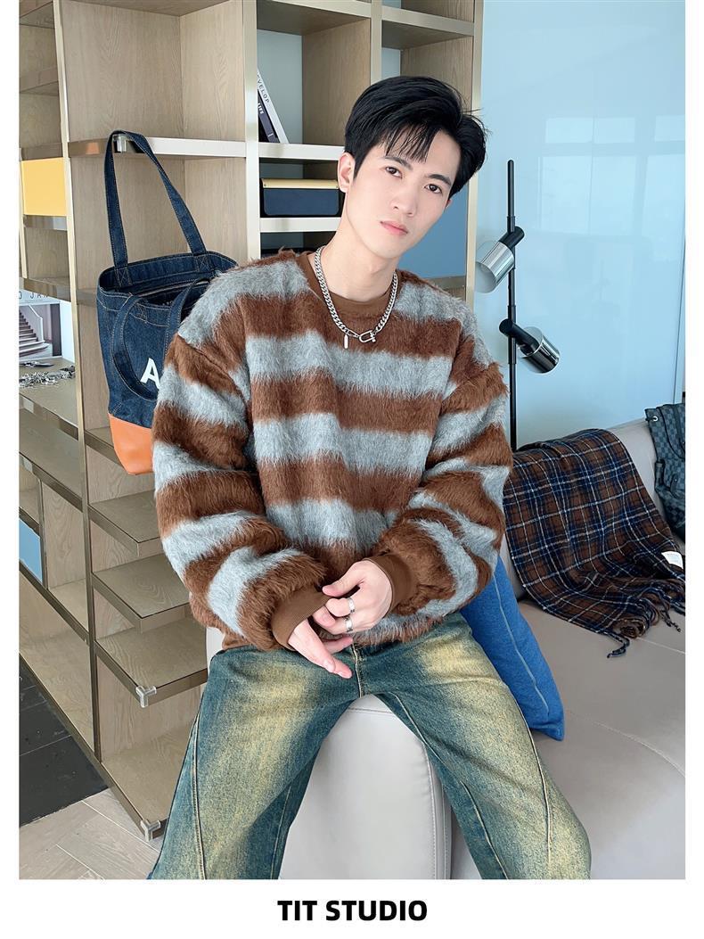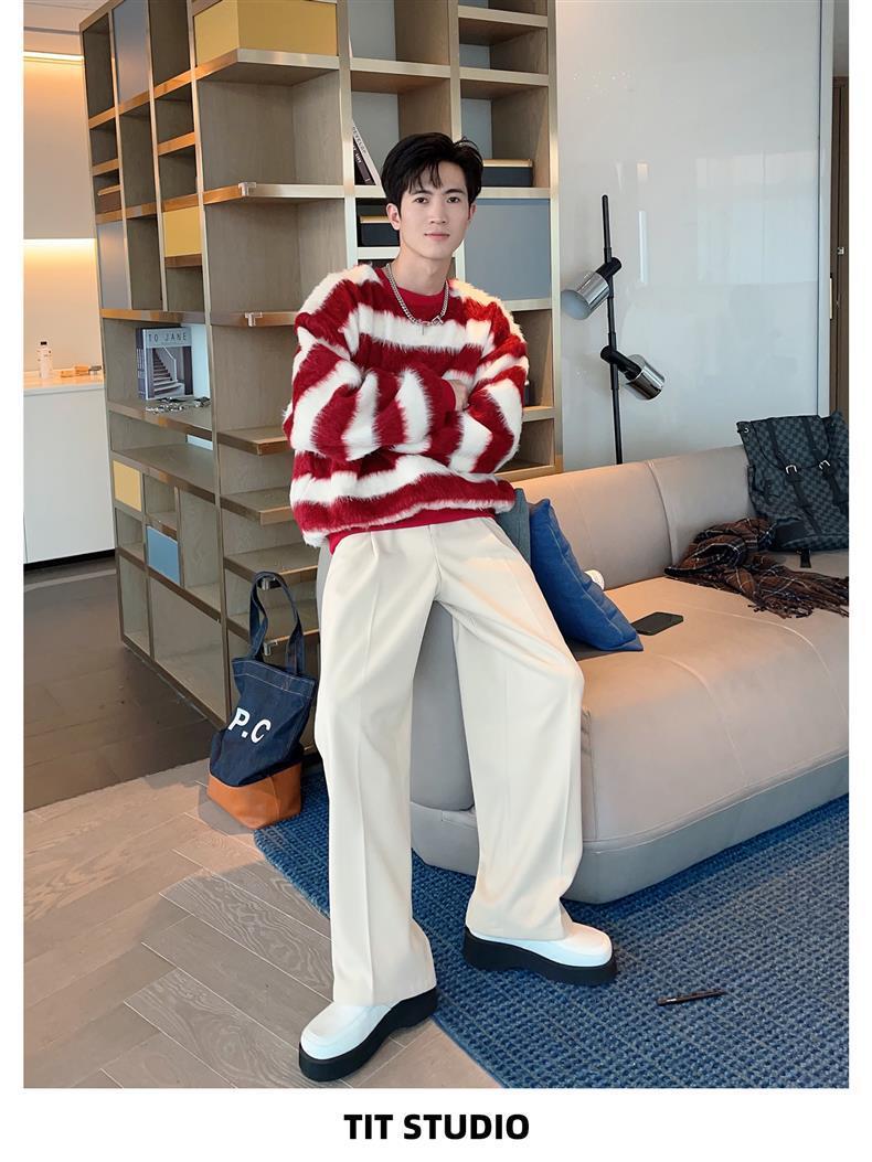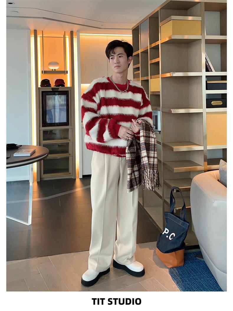 겨울 두꺼운 코튼 모헤어 스트라이프 새해 복 레드 스웨터 남자 한국식 커플 크루 넥 스웨터 탑