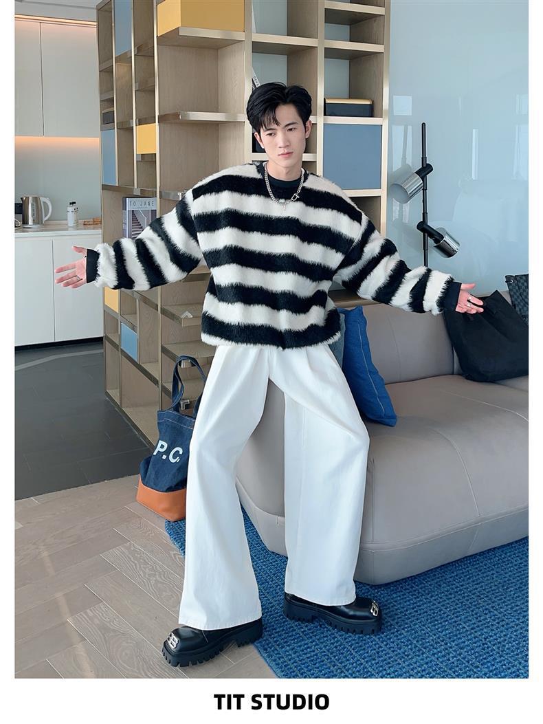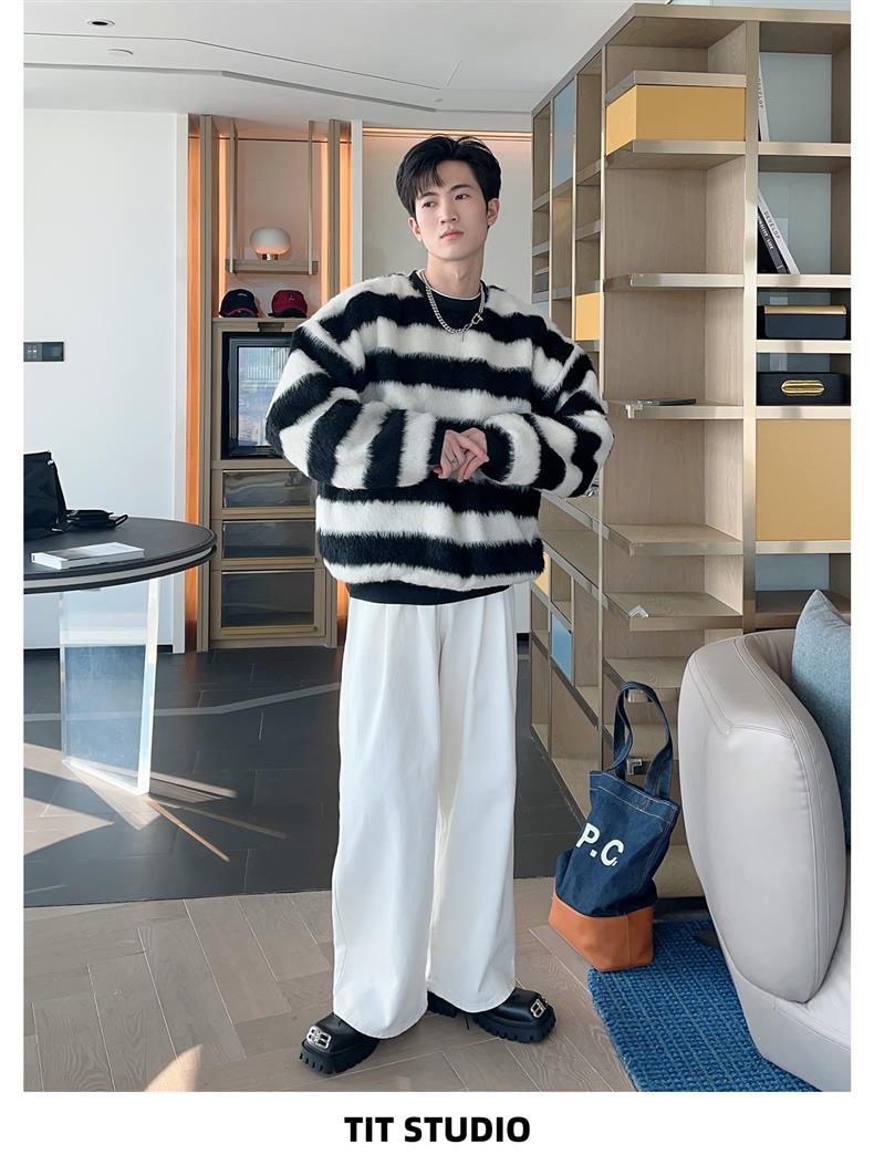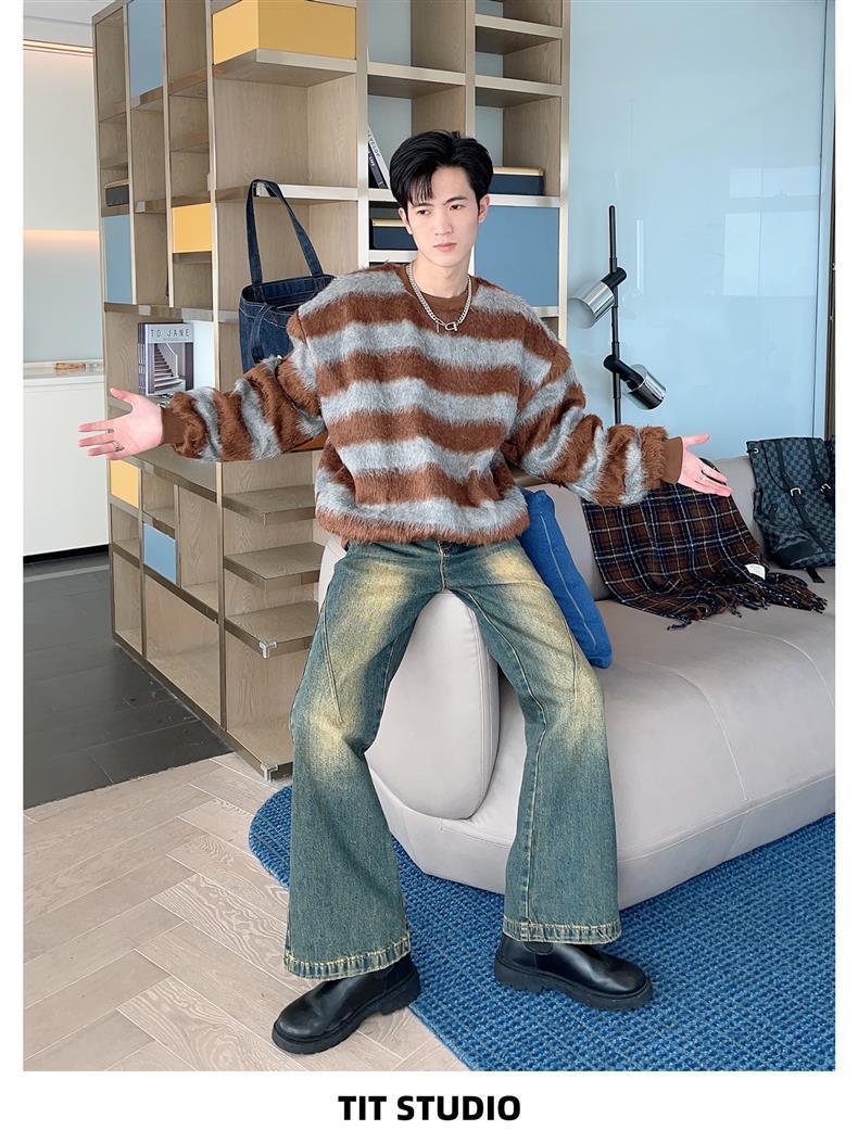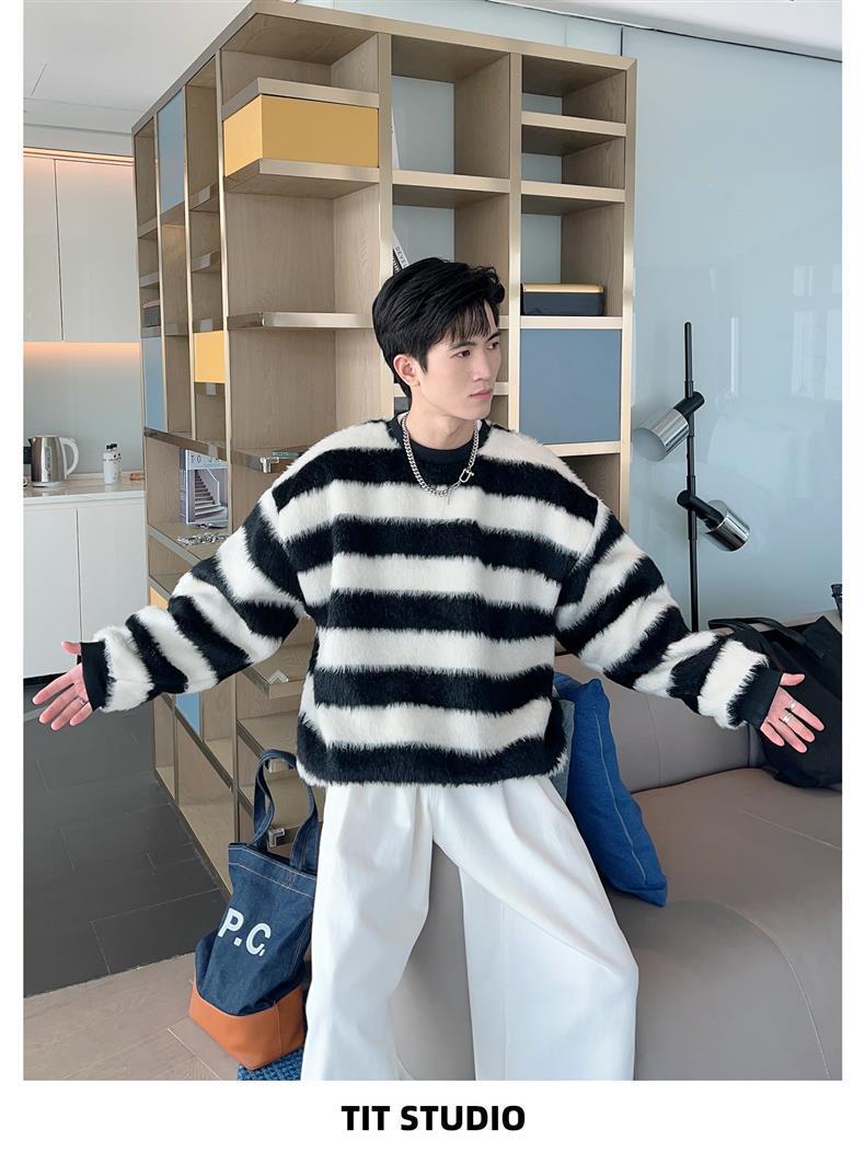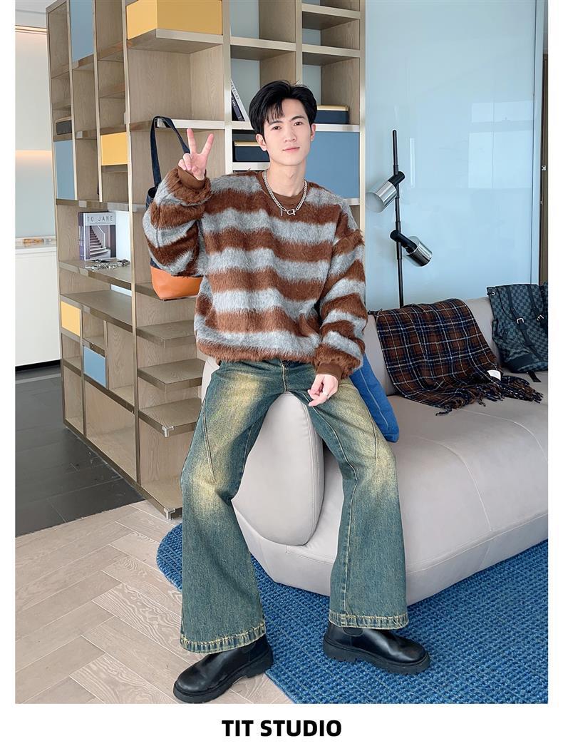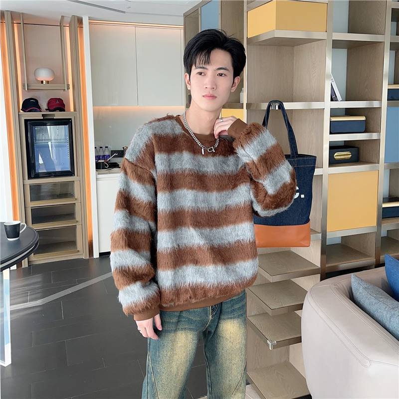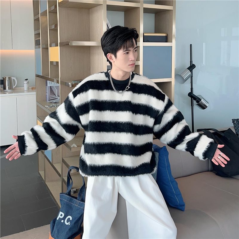 겨울 두꺼운 코튼 모헤어 스트라이프 새해 복 레드 스웨터 남자 한국식 커플 크루 넥 스웨터 탑