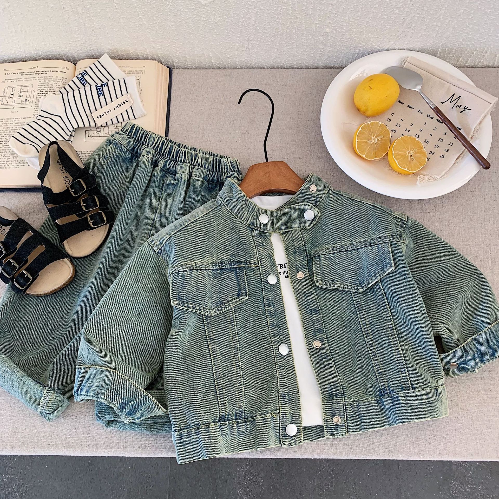 어린이 데님 세트 봄 가을 스타일 여아 패션 남아 캐주얼 다용도 아동 레트로 3피스 세트 레트로 그린스토어 가기