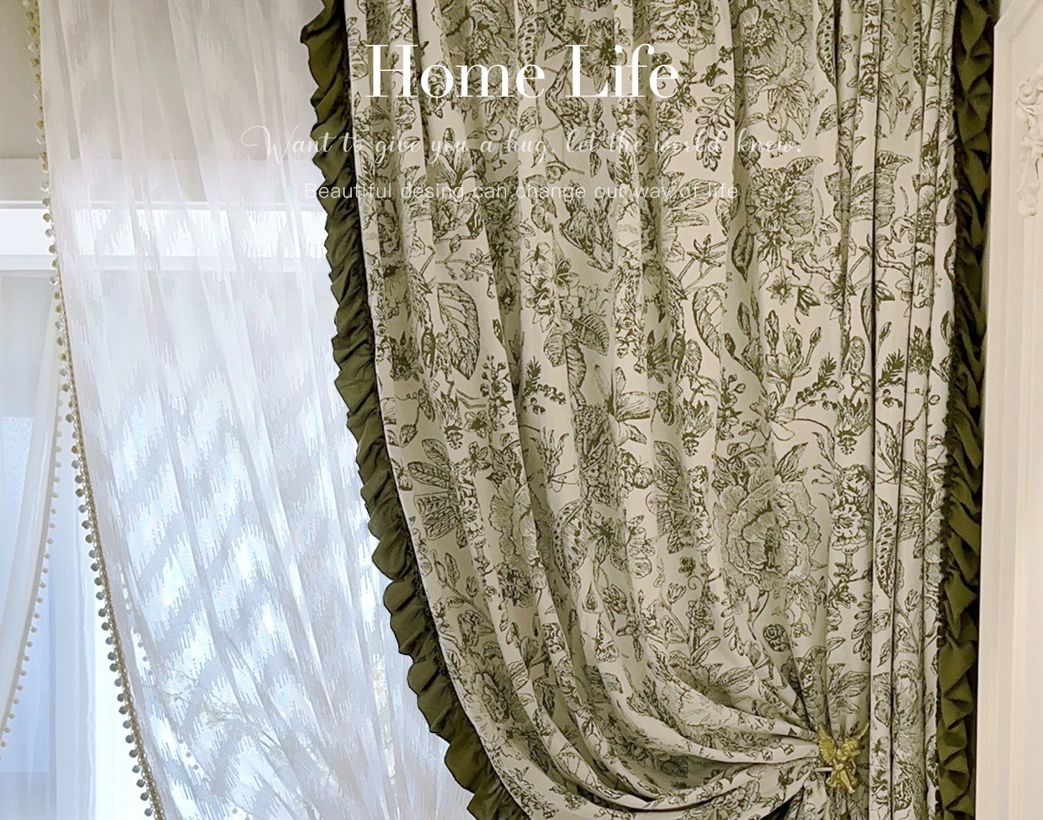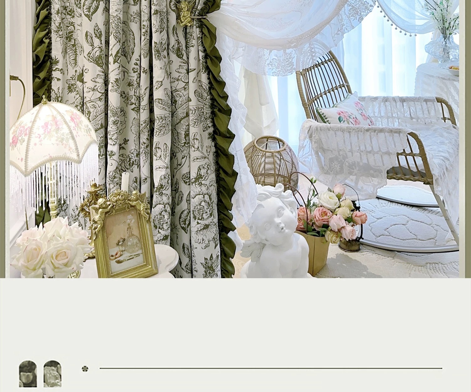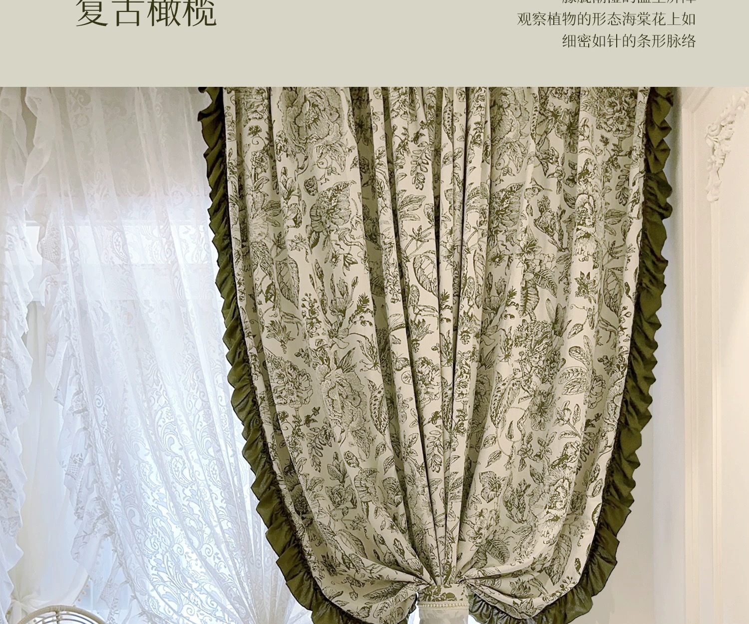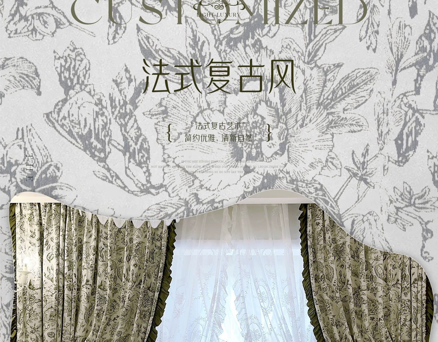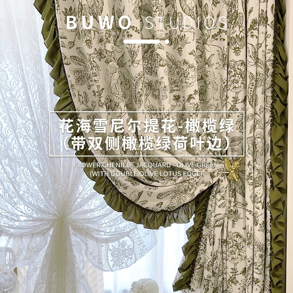 셔닐 올리브 그린 플라워 바다 자카드 커튼 프랑스 복고풍 스타일의 암막 커튼 거실 침실 고급 베이 창스토어 가기