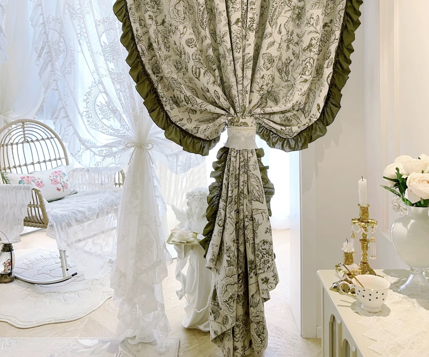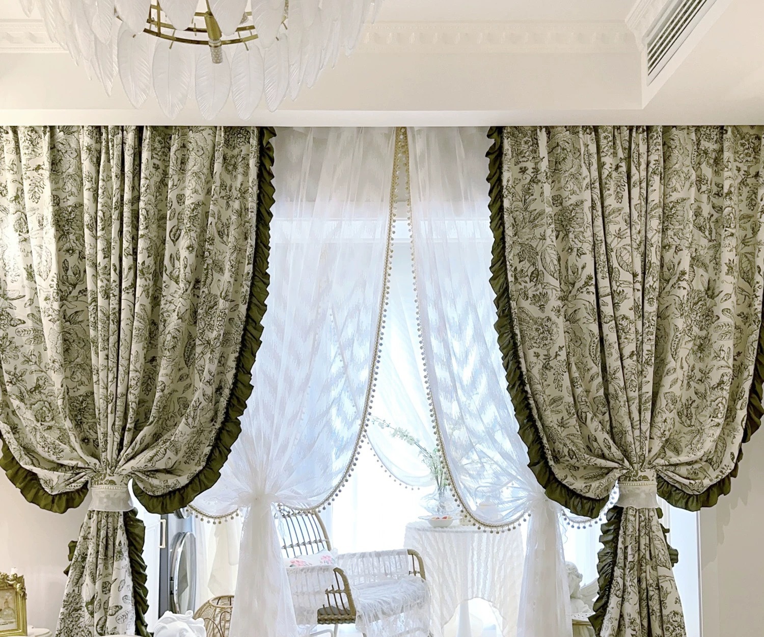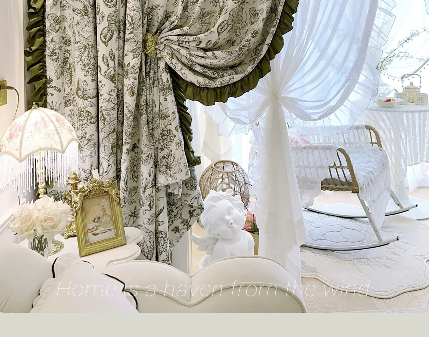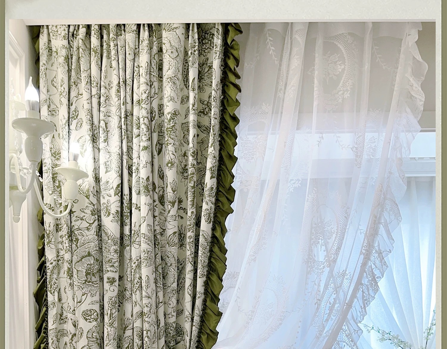 셔닐 올리브 그린 플라워 바다 자카드 커튼 프랑스 복고풍 스타일의 암막 커튼 거실 침실 고급 베이 창