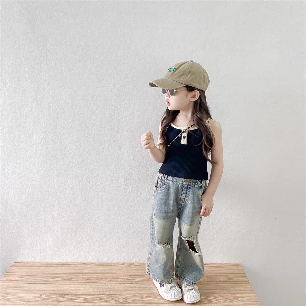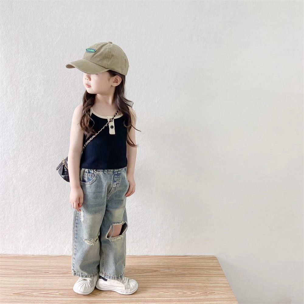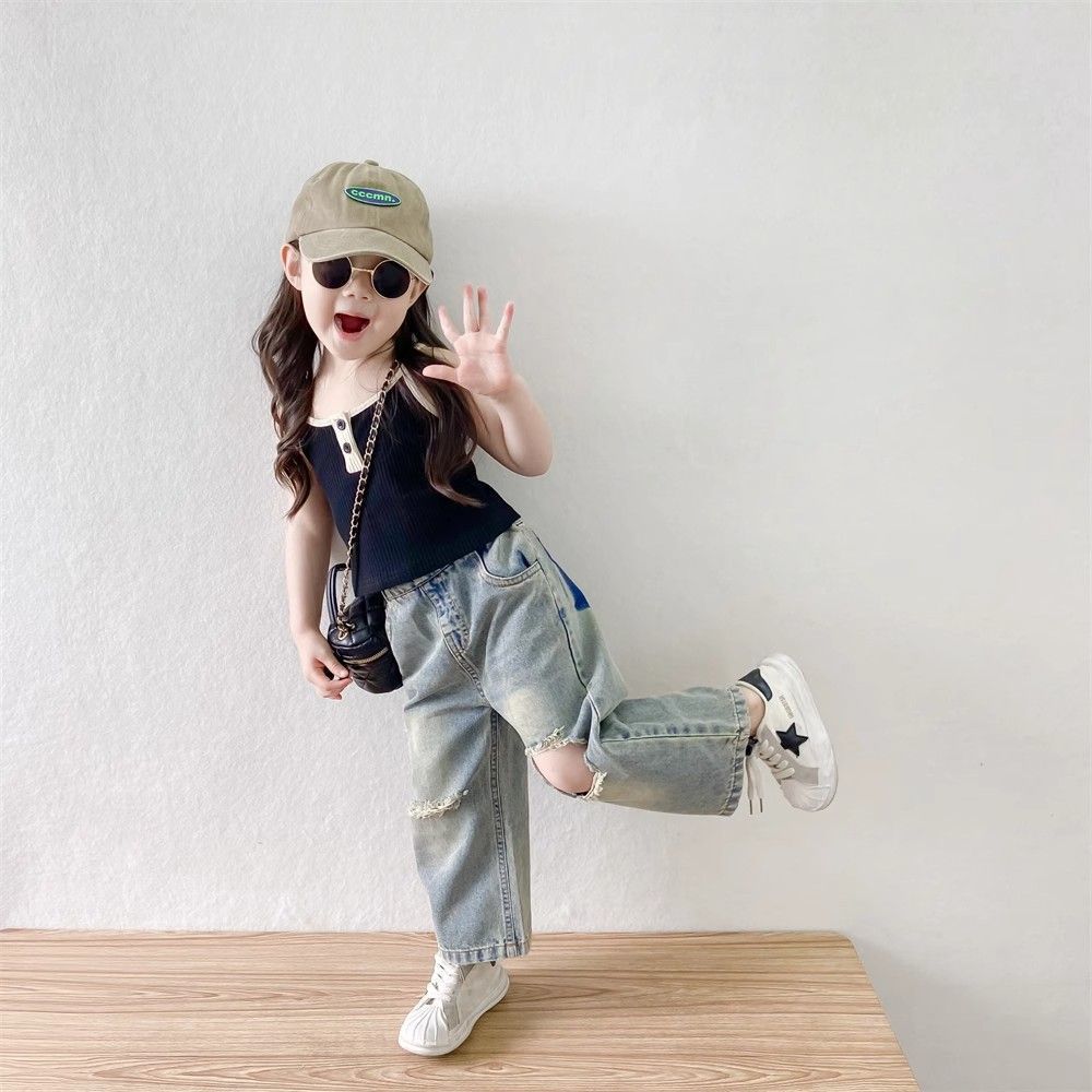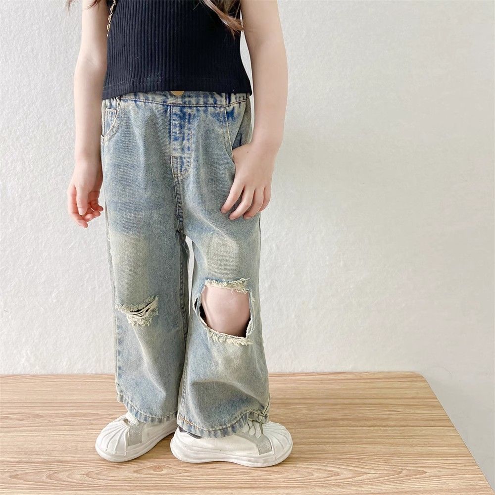 소녀들의 향수를 불러일으키는 찢어진 청바지 2025 여름 새로운 한국 스타일 소년 소녀 트렌디한 복고풍 데님 바지 얇은 스타일