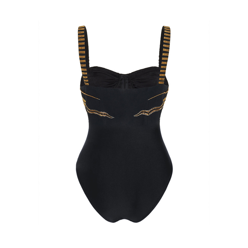 2025 새로운 유럽과 미국의 국경 간 폭발 블랙 골드 플래시 조각 수영복 여성 비치 홀리데이 비키니 롱 스커트 수영복스토어 가기