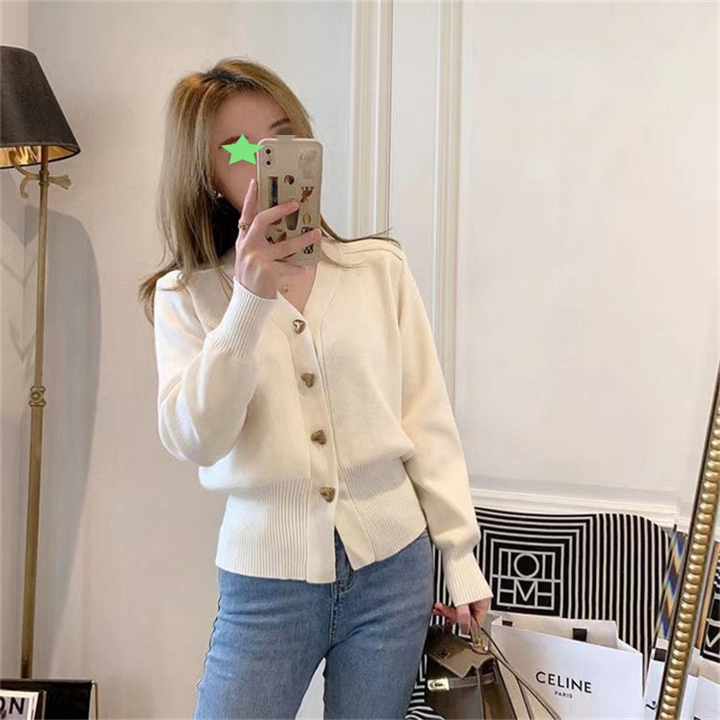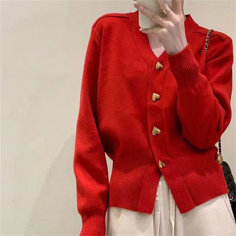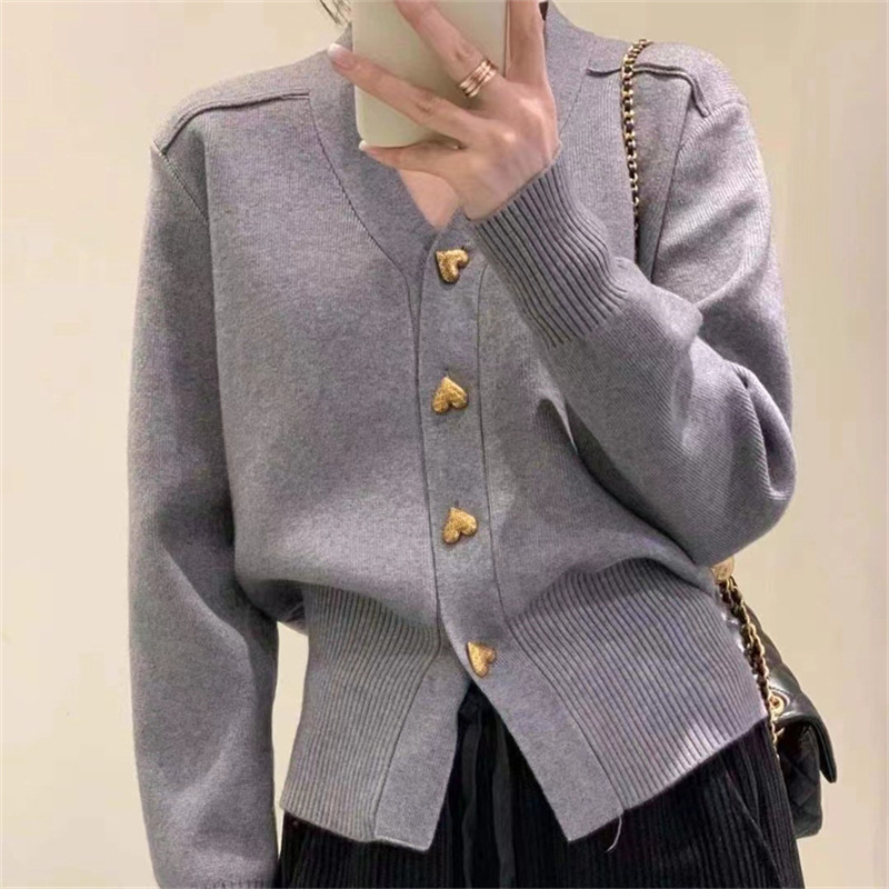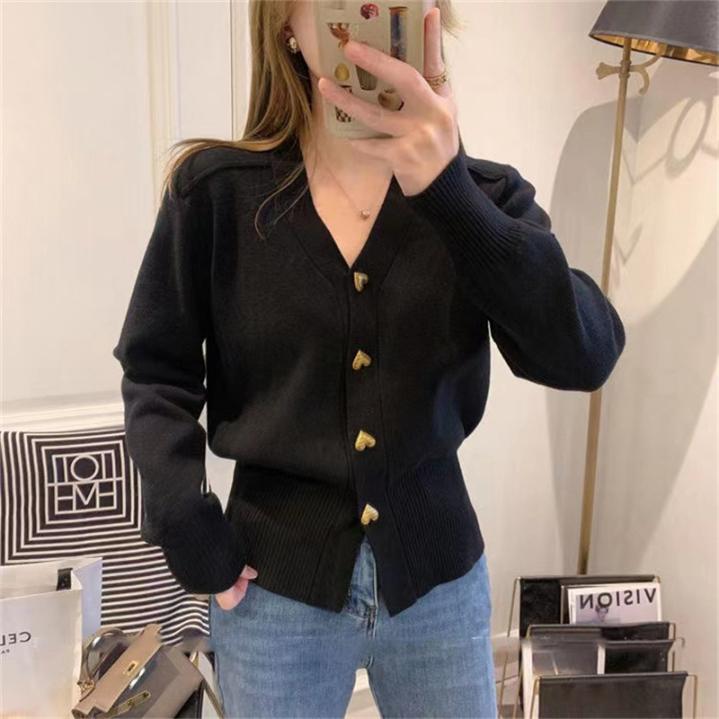 V-넥 슬림 핏 스웨터 2024 새로운 가을 단색 캐주얼 스티칭 러브 버튼 슬림 니트 카디건 여성스토어 가기