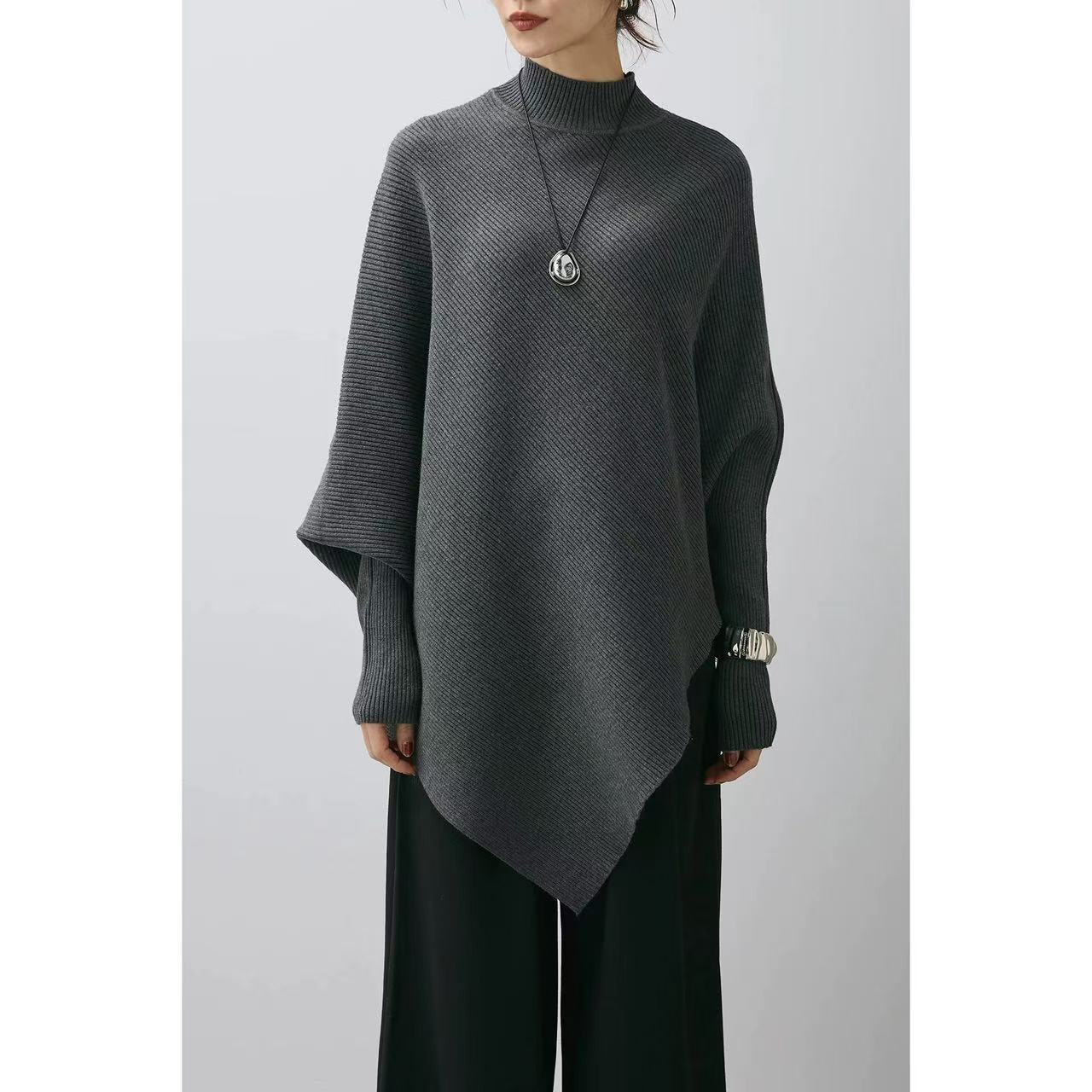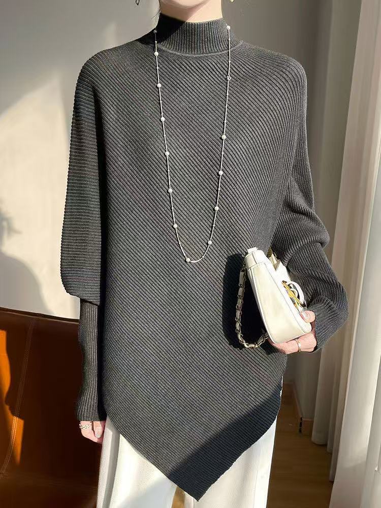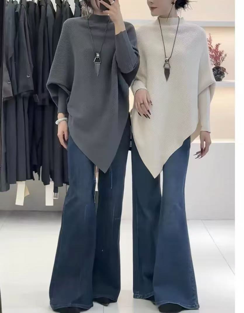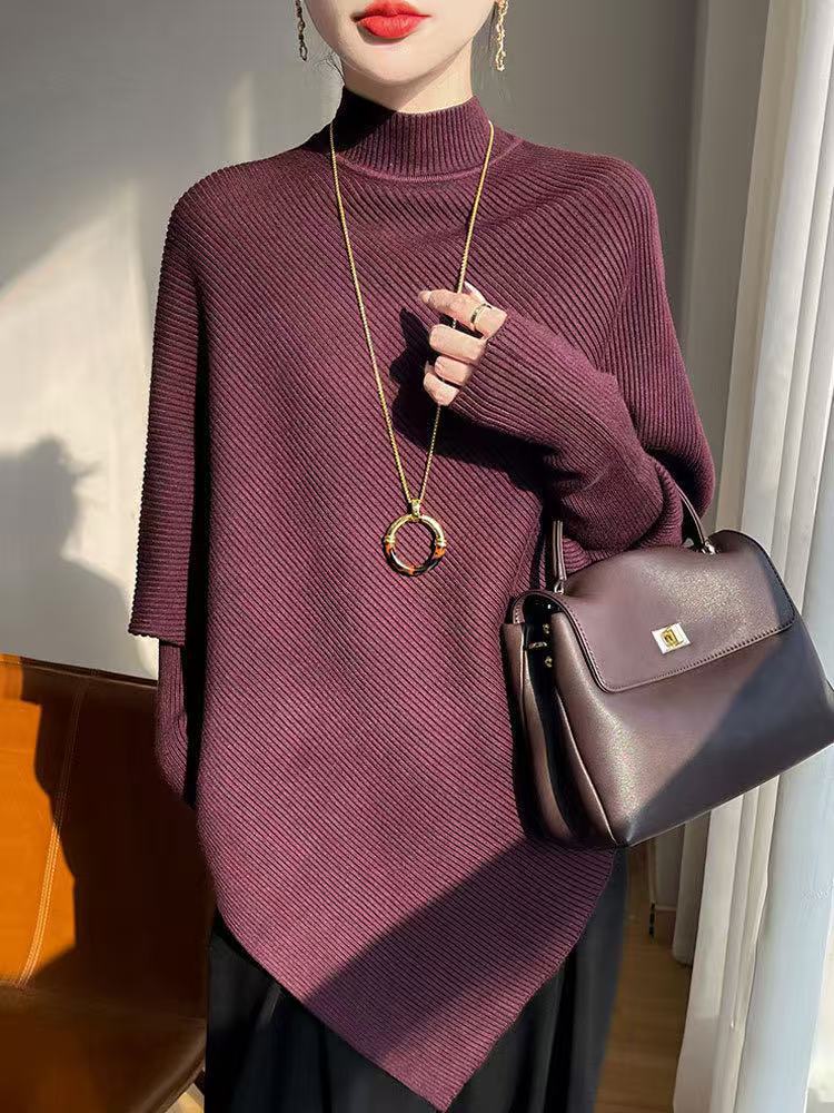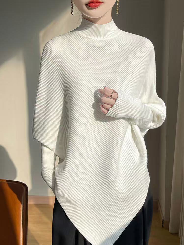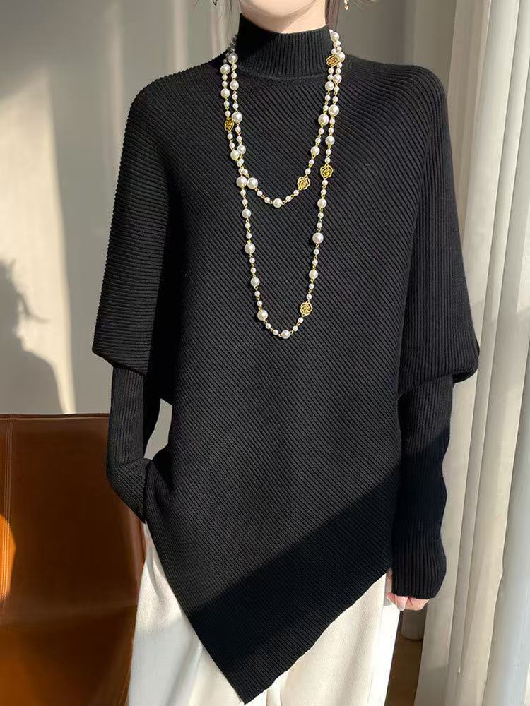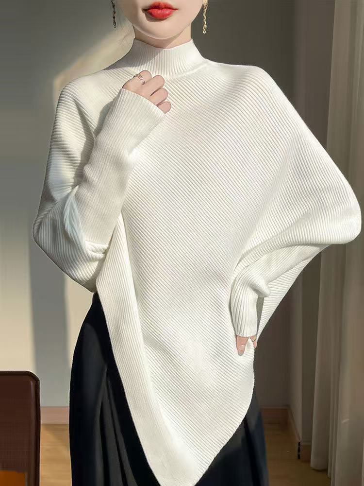 올드머니 스타일 심플 망토 스웨터 여성용 불규칙 슬림핏 박쥐소매 고급스러운 하이넥 트렌디 니트