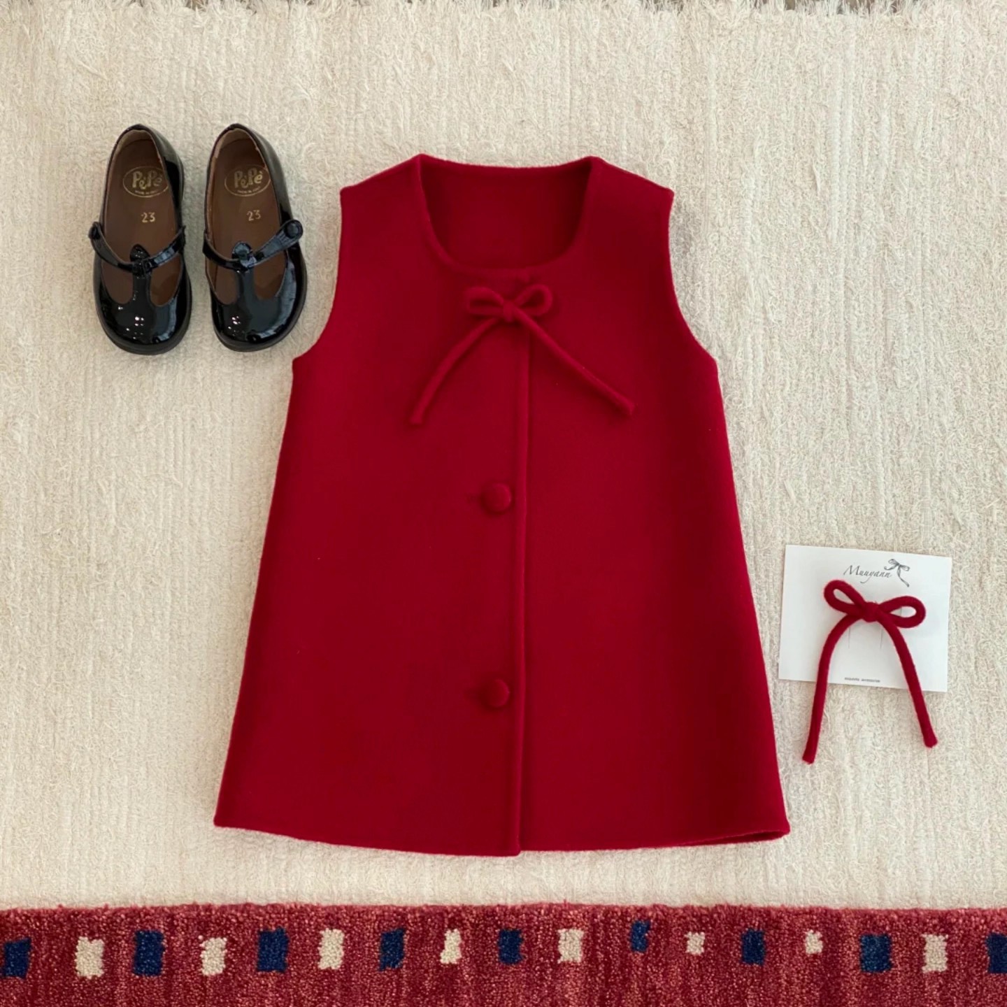 소녀들의 새해 모직 원피스 2025 아기의 새로운 서양식 복고풍 빨간 격자 무늬 원피스 새해 조끼스토어 가기