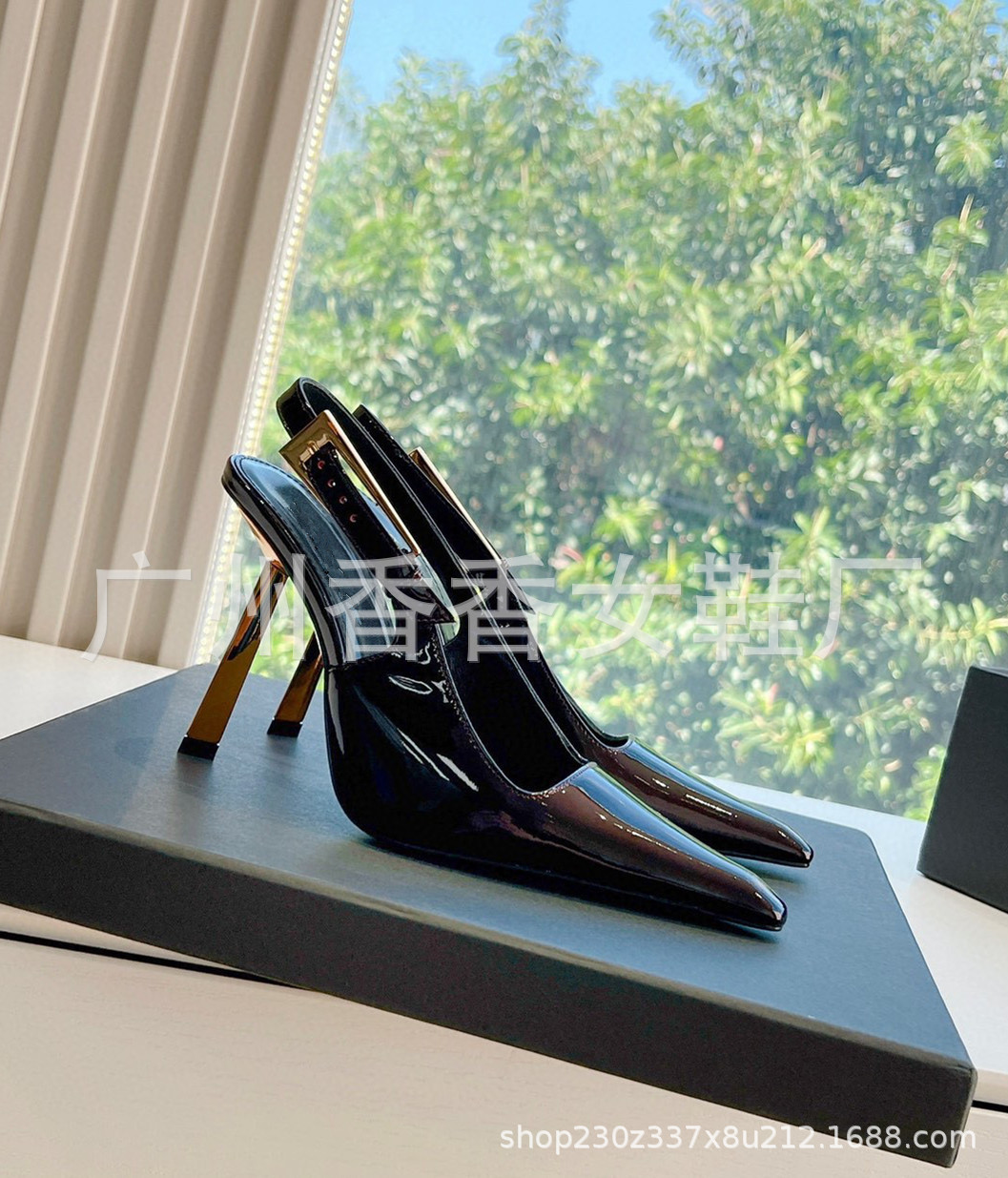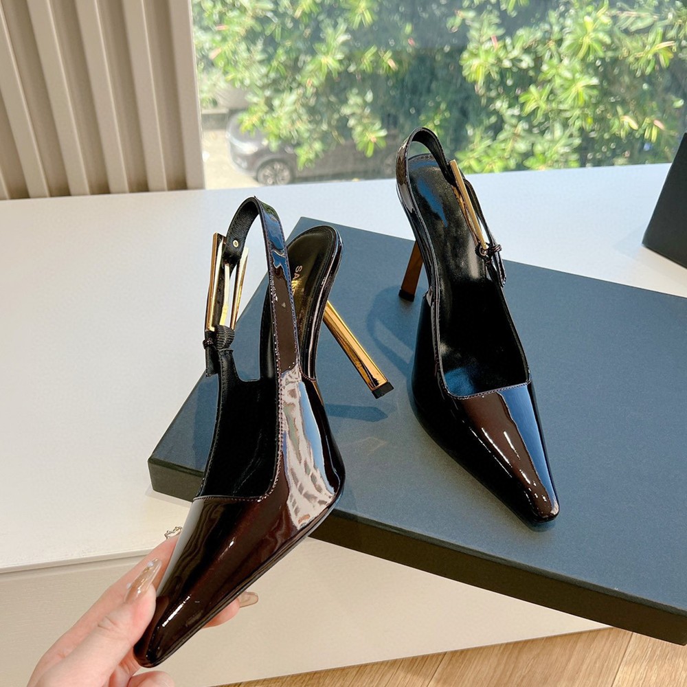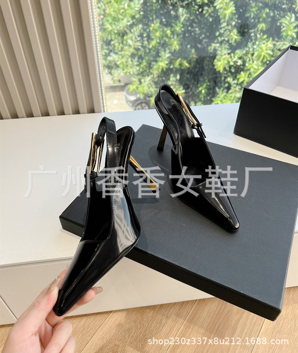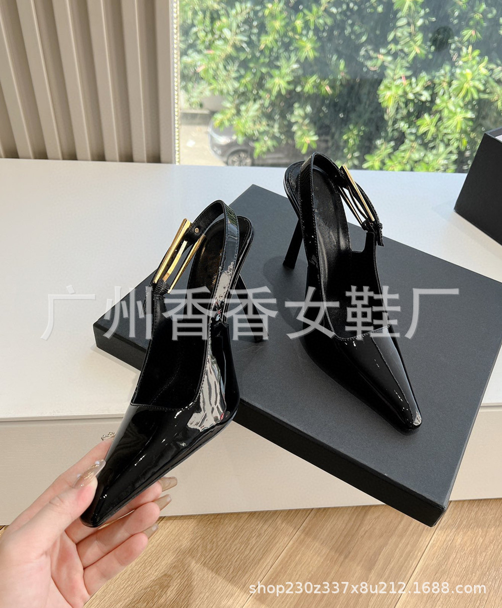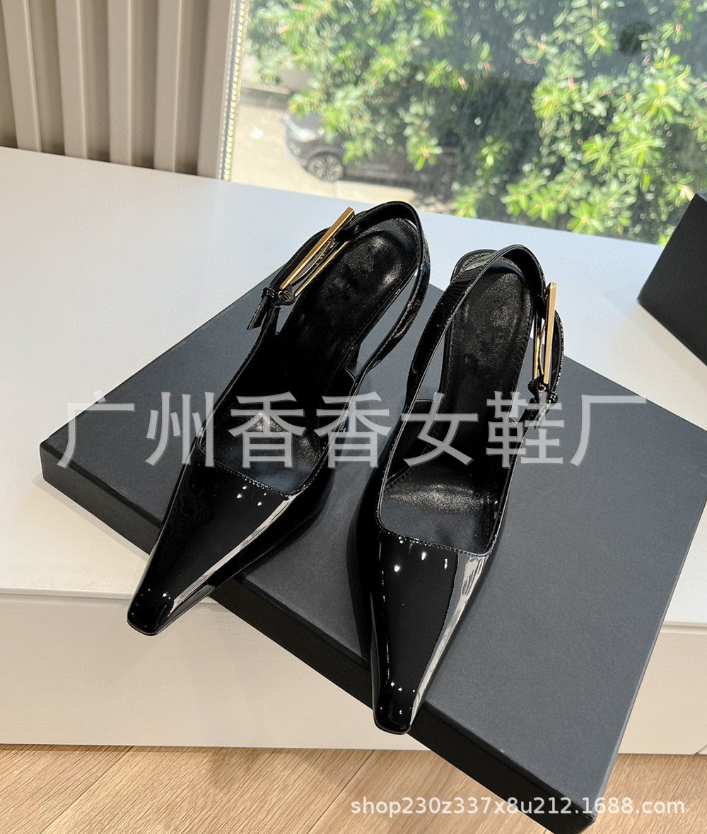 Nazha 하이힐 여성 2025 새로운 블랙 특허 가죽 우아한 싱글 레이어 신발 작은 골드 스트립 스틸레토 힐 포인팅 샌들 여성스토어 가기