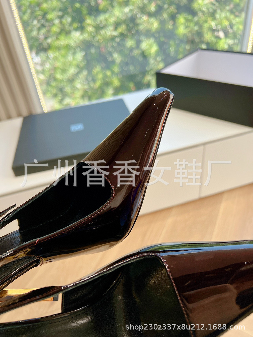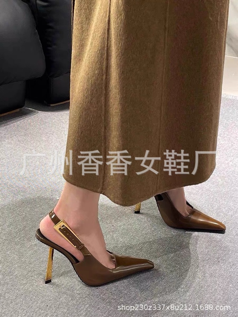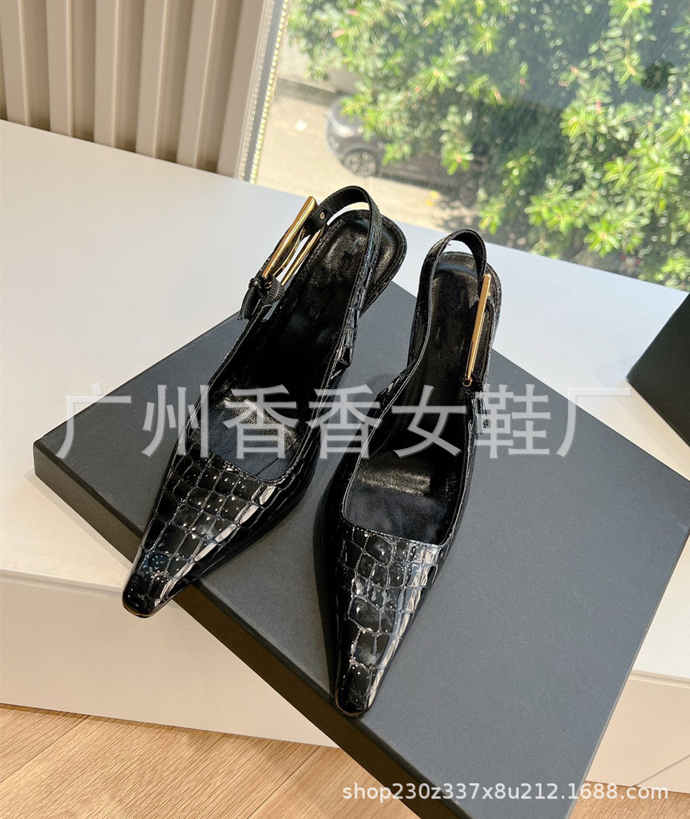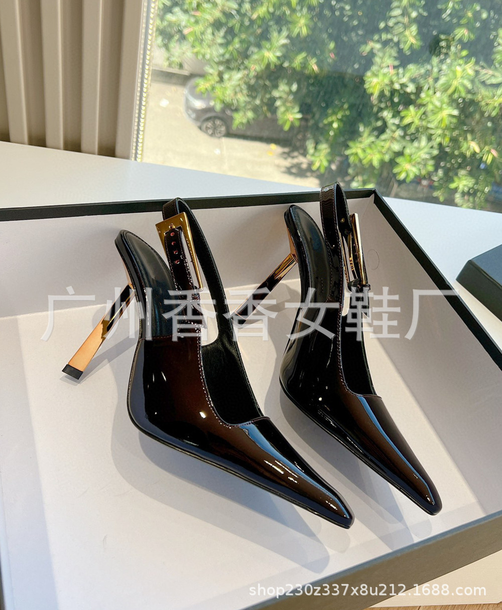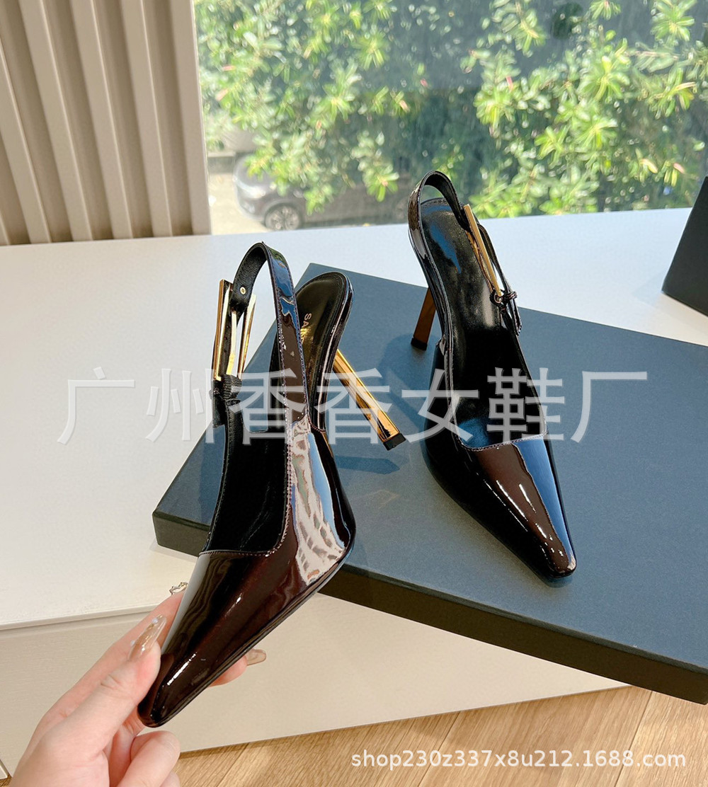 Nazha 하이힐 여성 2025 새로운 블랙 특허 가죽 우아한 싱글 레이어 신발 작은 골드 스트립 스틸레토 힐 포인팅 샌들 여성스토어 가기