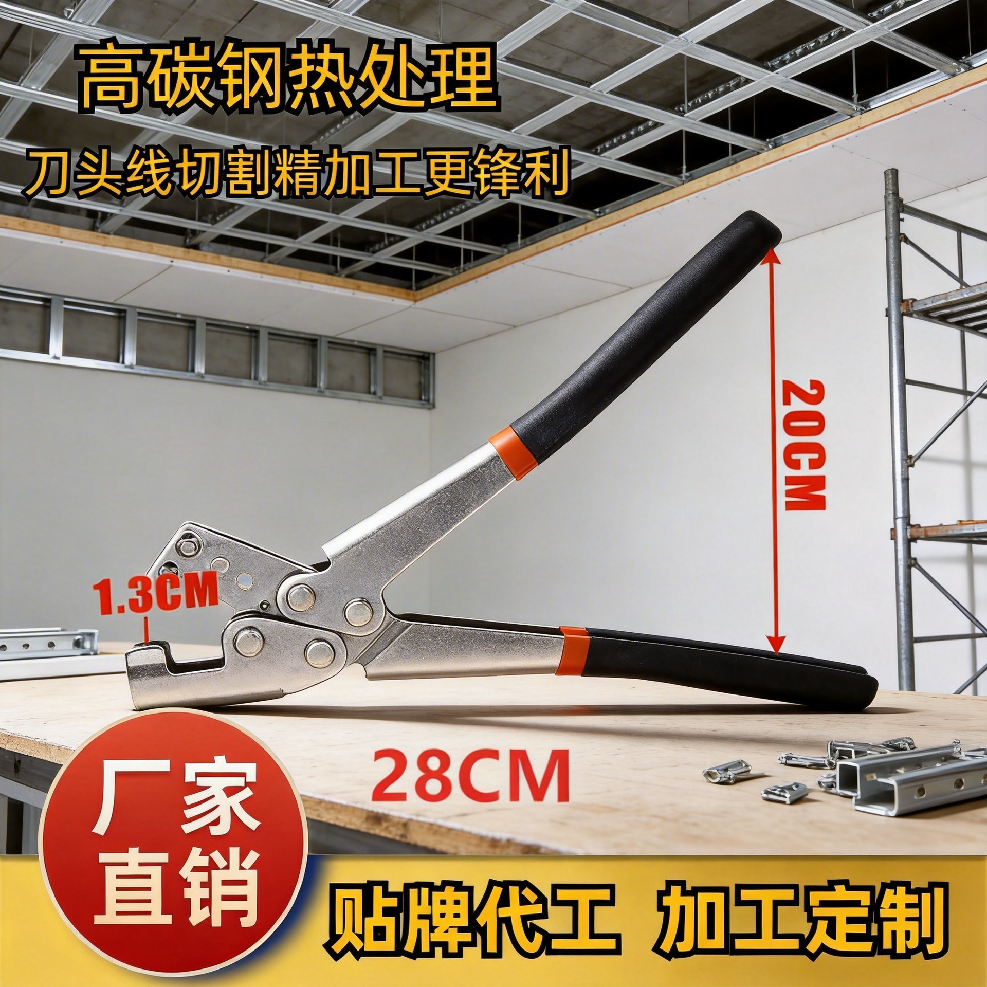 龙骨钳,又名龙骨铆接钳。为横竖轻钢龙骨噬合而特制的一种多功能专业工具。采用高碳合金钢制作。适用冲切壁厚为0.6mm-0.8mm的龙骨,达到龙骨与龙骨之间的连接和固定,该连接工艺简便易用,不需钻空、铆接,更不需要铆钉、螺丝等材料,达到快捷、牢固、省时省力、降耗、提高工效等效果!